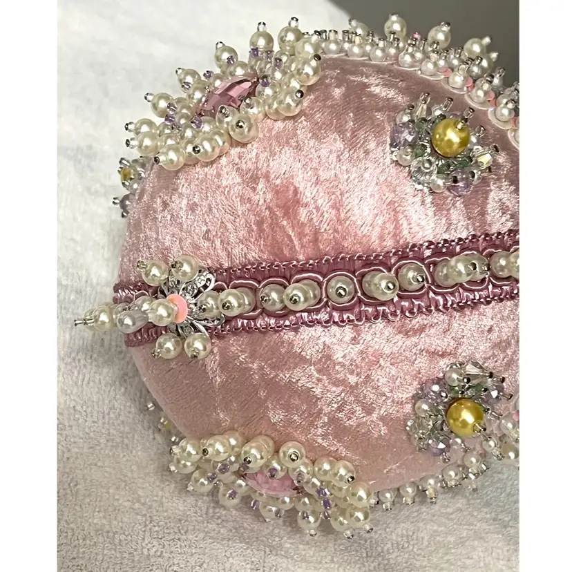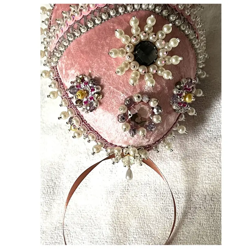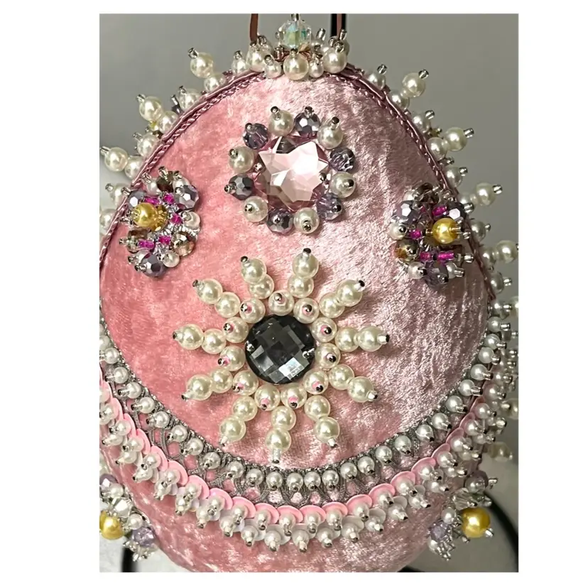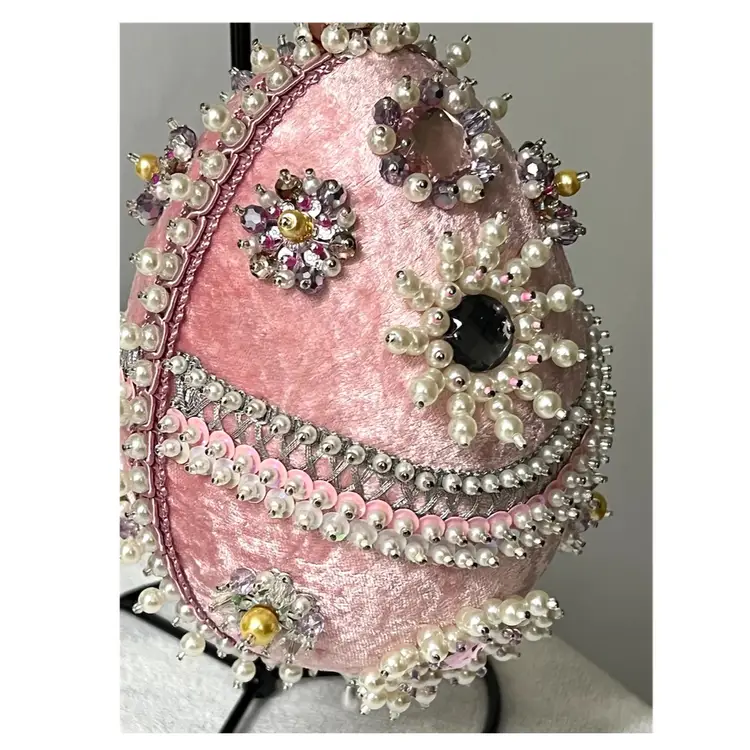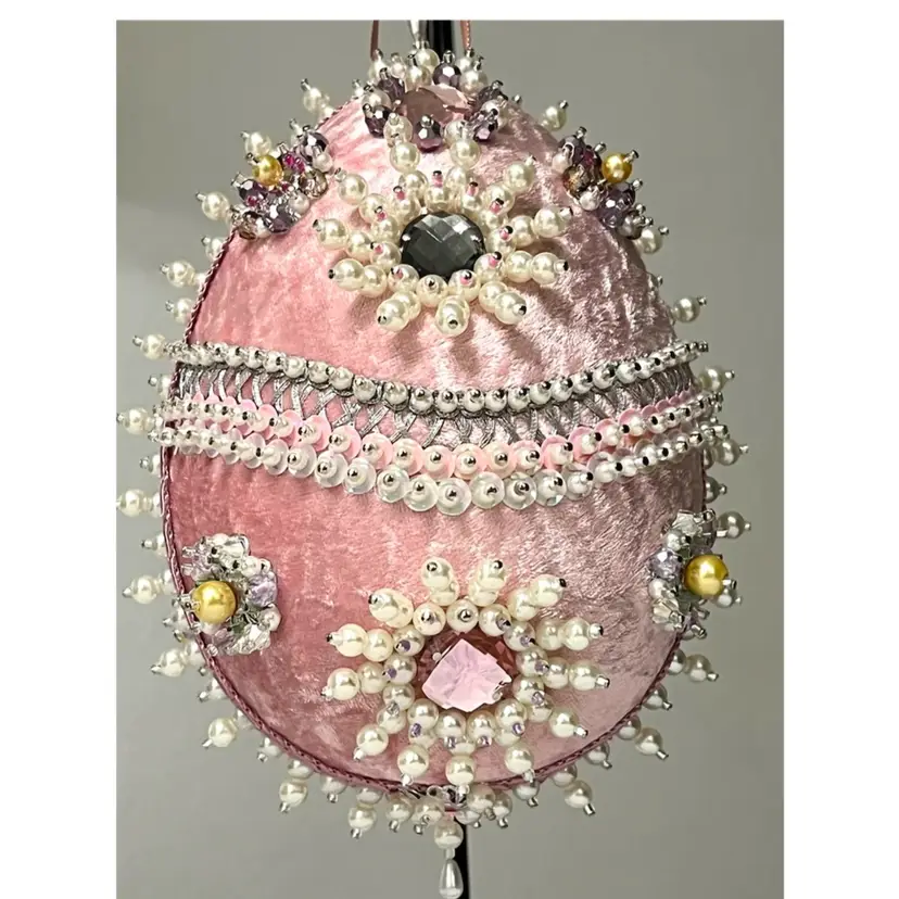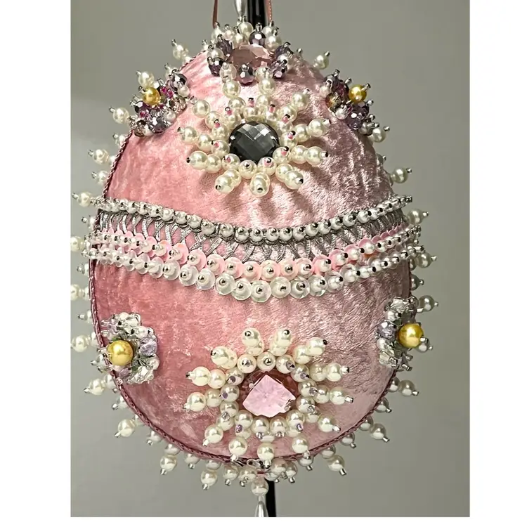 Handmade Vintage Style Push Pin Easter Egg Ornament Pearls Sequins Beads Ribbon. 6 in Height