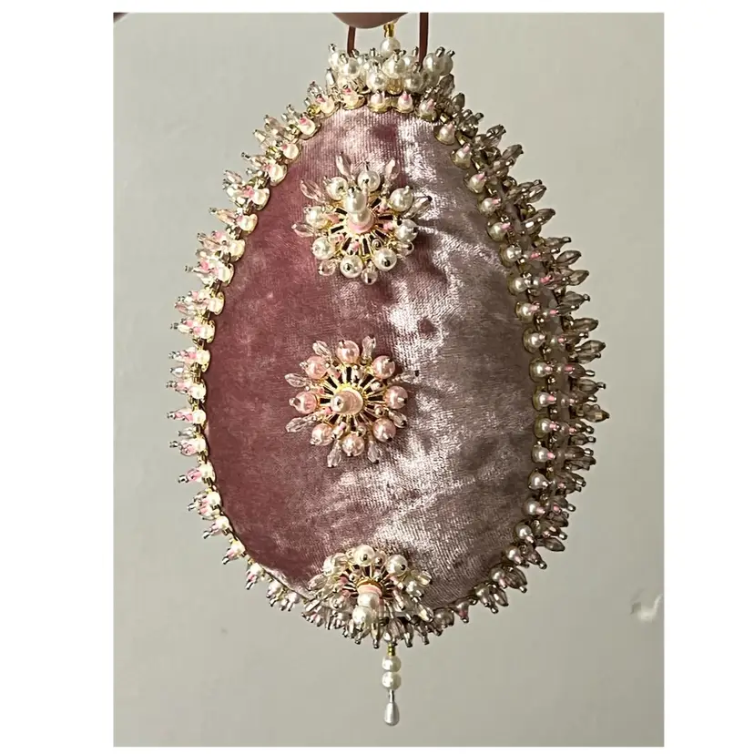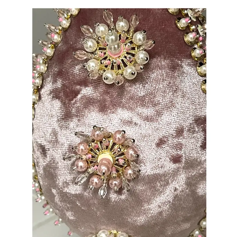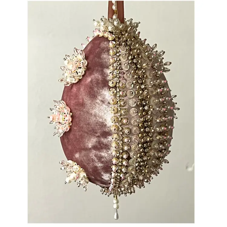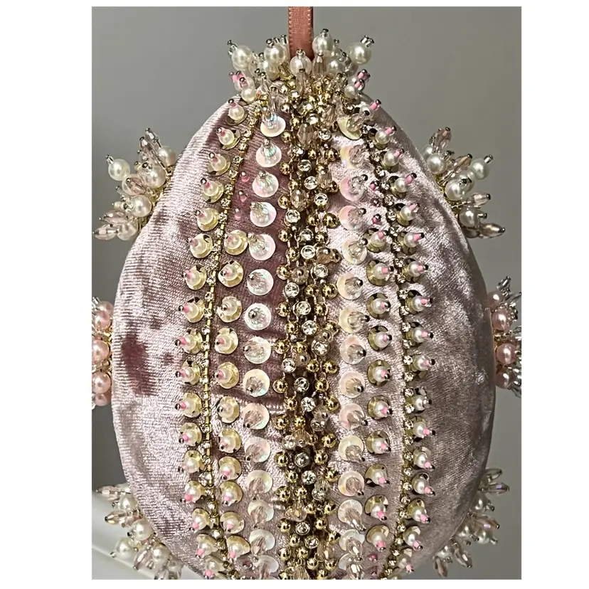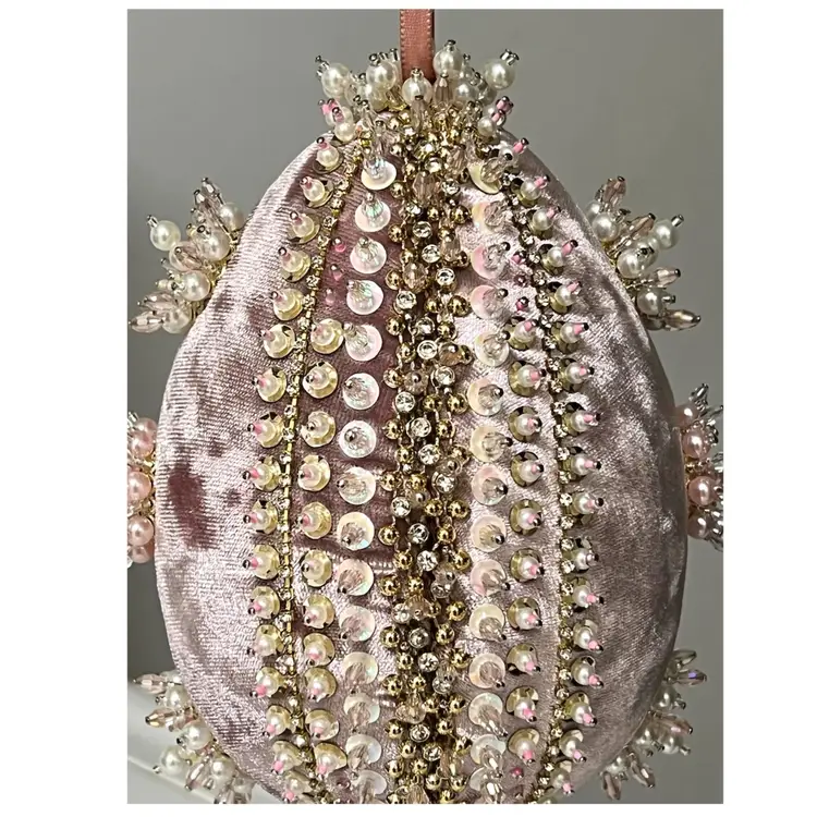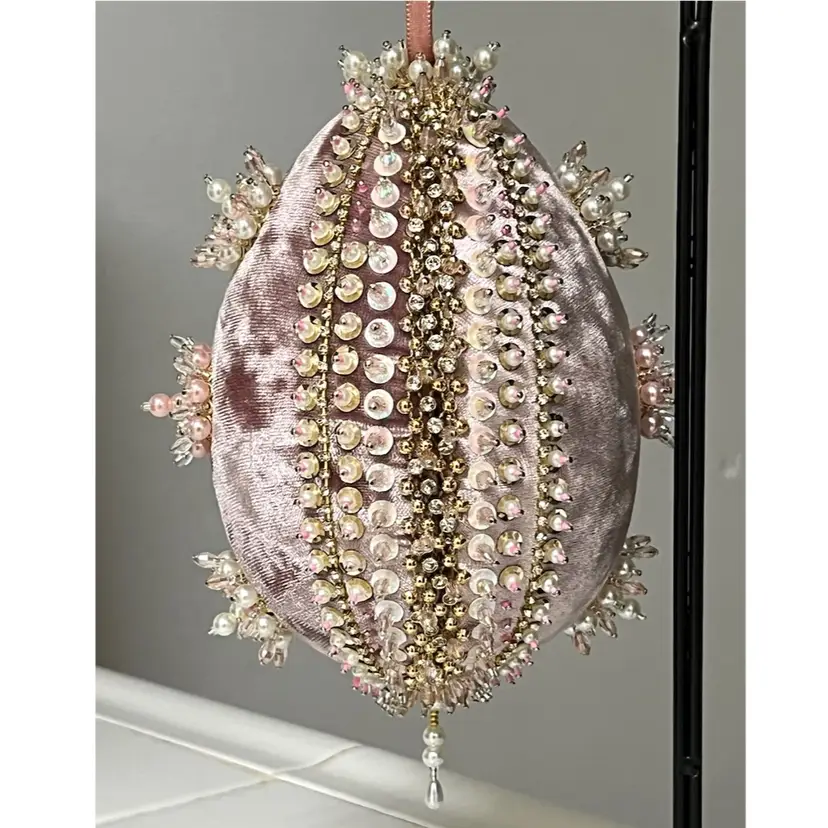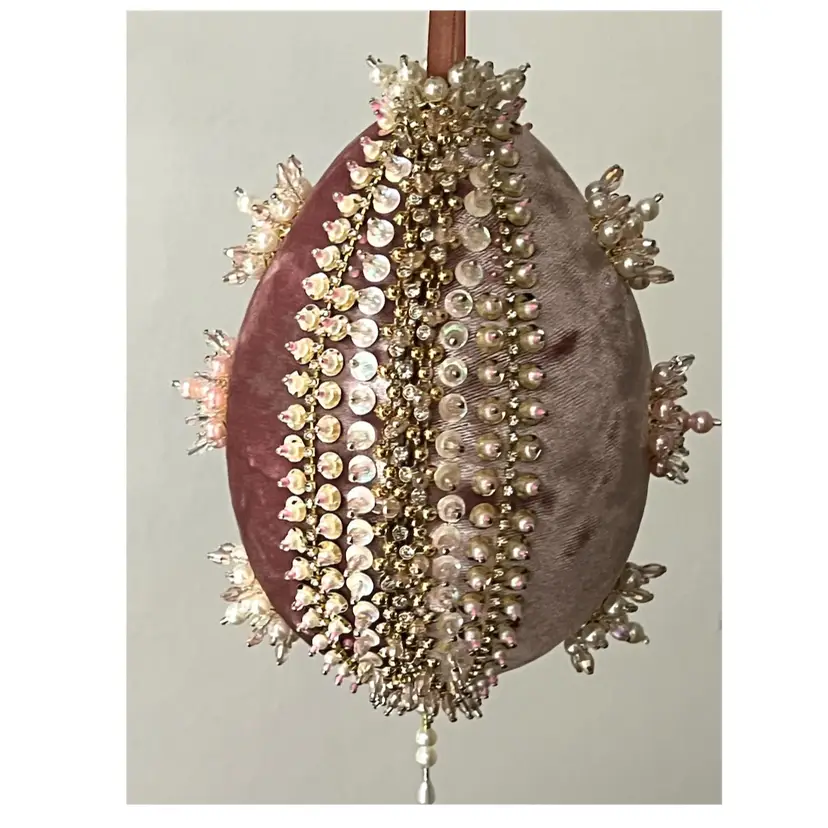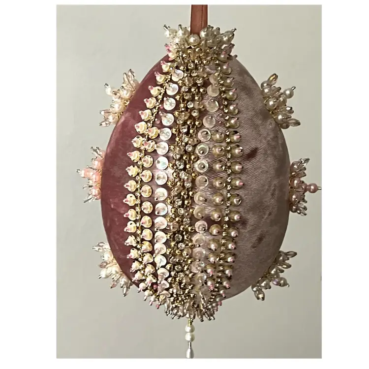 Handmade Vintage Style Push Pin Easter Egg Ornament Pearls Beads Sequins Ribbon. 6 in Height