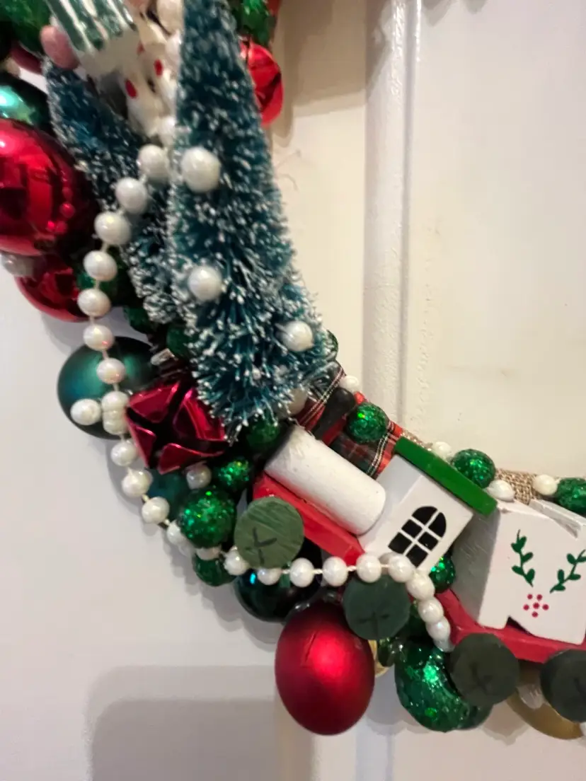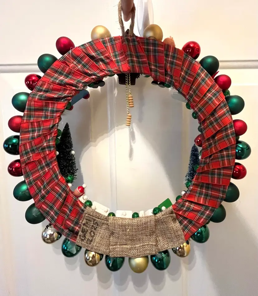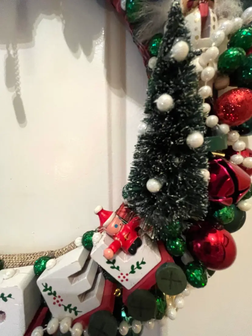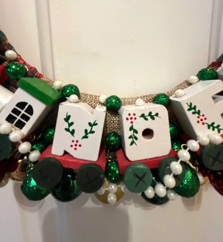 NEW - Handmade from an assortment vintage and newer materials. Featuring vintage wooden ornaments with a clock at top flanked by Mr. & Mrs. Santa Claus and a NOEL train at the bottom - it appears that the wooden figures are awaiting the trains arrival. Finished off with plastic and foam balls, beads and metal jingle bells. The wire base is wrapped in plaid ribbon and hanging loop is securely attached at top.