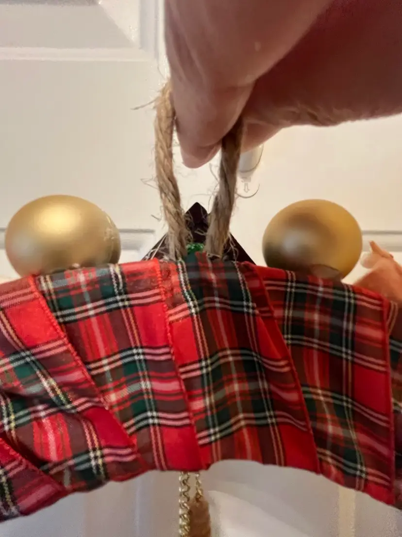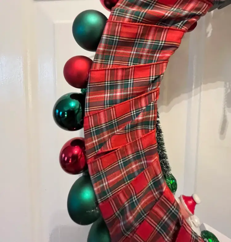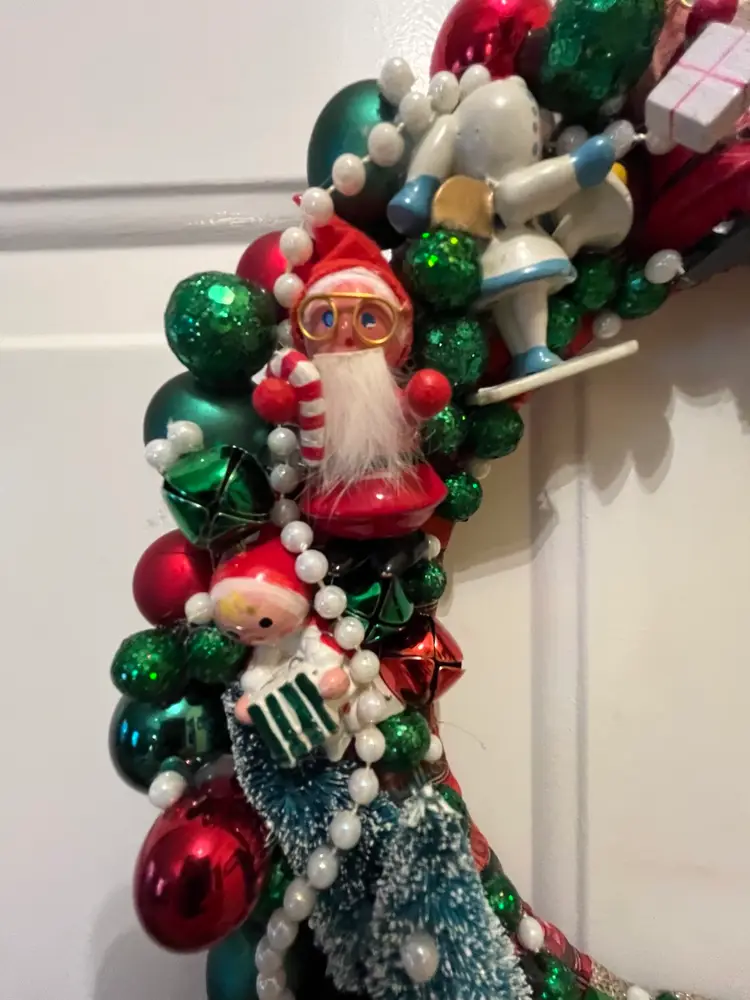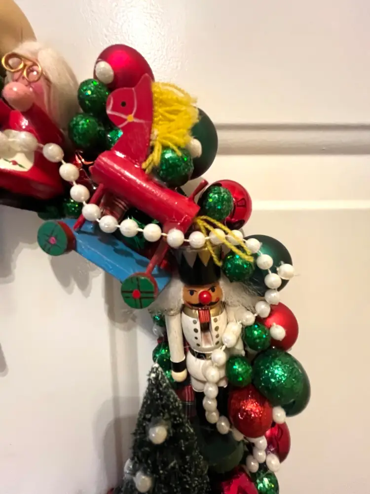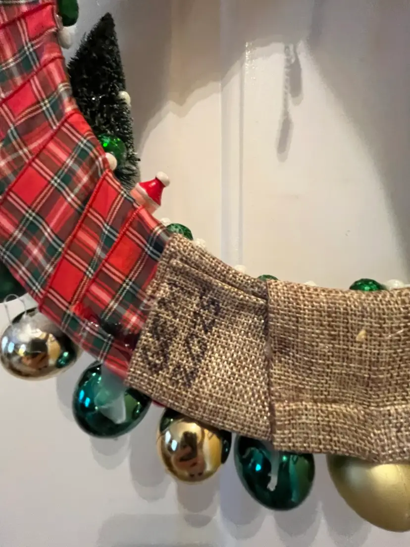 NEW - Handmade from an assortment vintage and newer materials. Featuring vintage wooden ornaments with a clock at top flanked by Mr. & Mrs. Santa Claus and a NOEL train at the bottom - it appears that the wooden figures are awaiting the trains arrival. Finished off with plastic and foam balls, beads and metal jingle bells. The wire base is wrapped in plaid ribbon and hanging loop is securely attached at top.