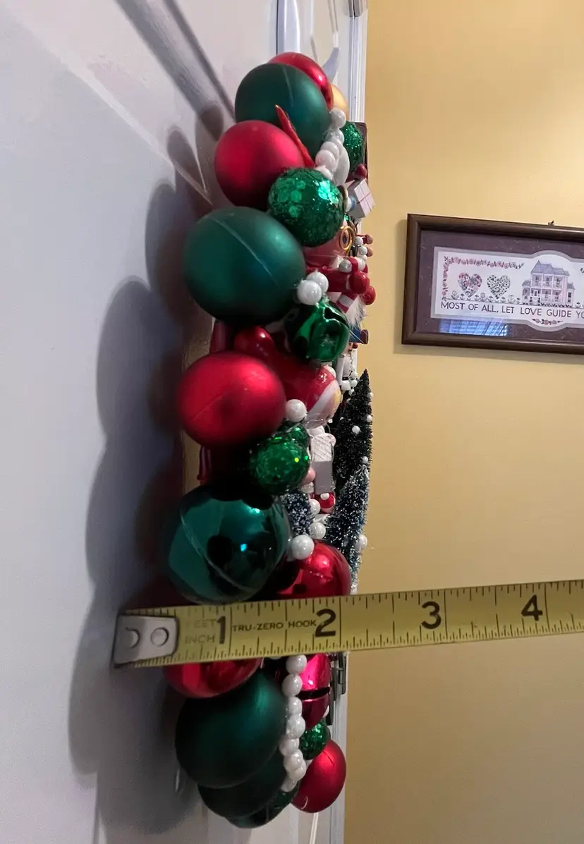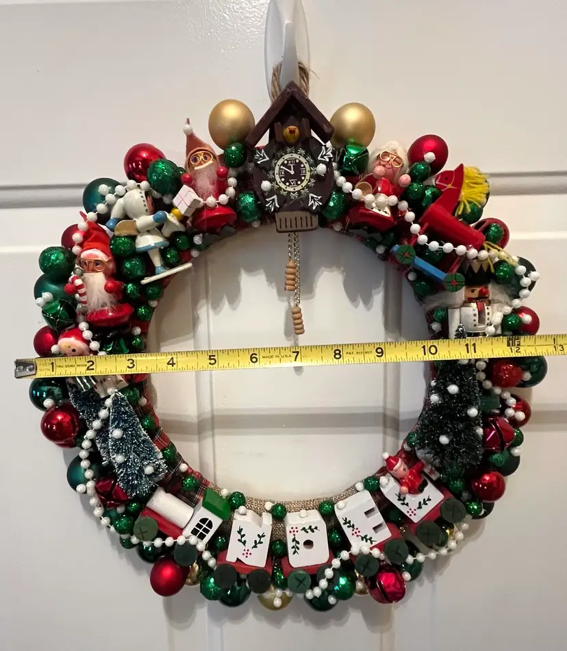 Measures approx.13" in diameter and approx. 2.5" in depth - this is a smaller size / lower clearance wreath which offers lots of options for where to hang (check clearance if planning to hang on door). Made for indoor use. Handle with care! The item in photos is exact item you will receive. One of a kind made by me (GEM).