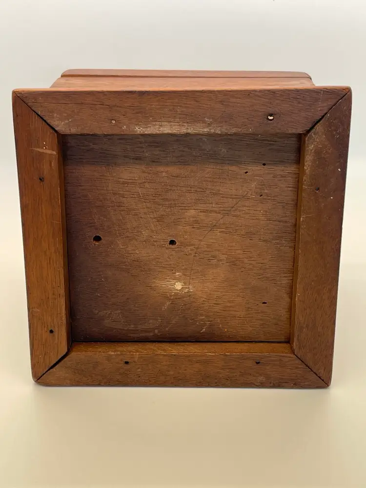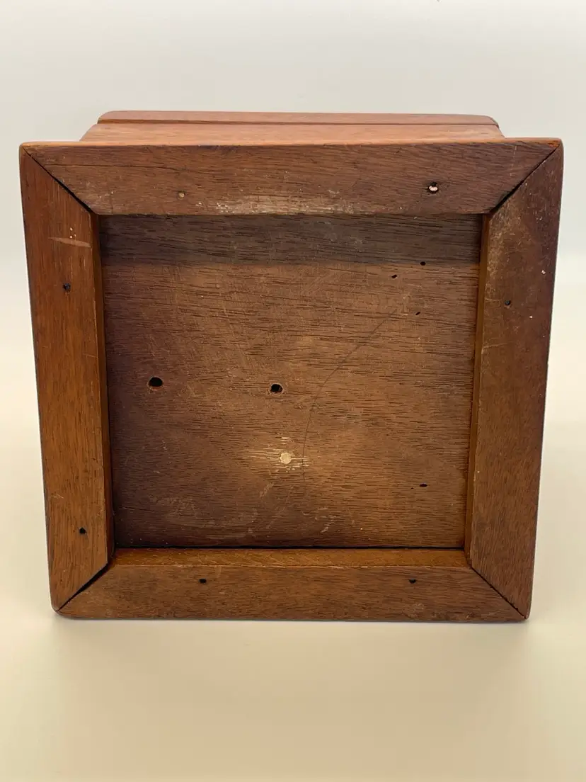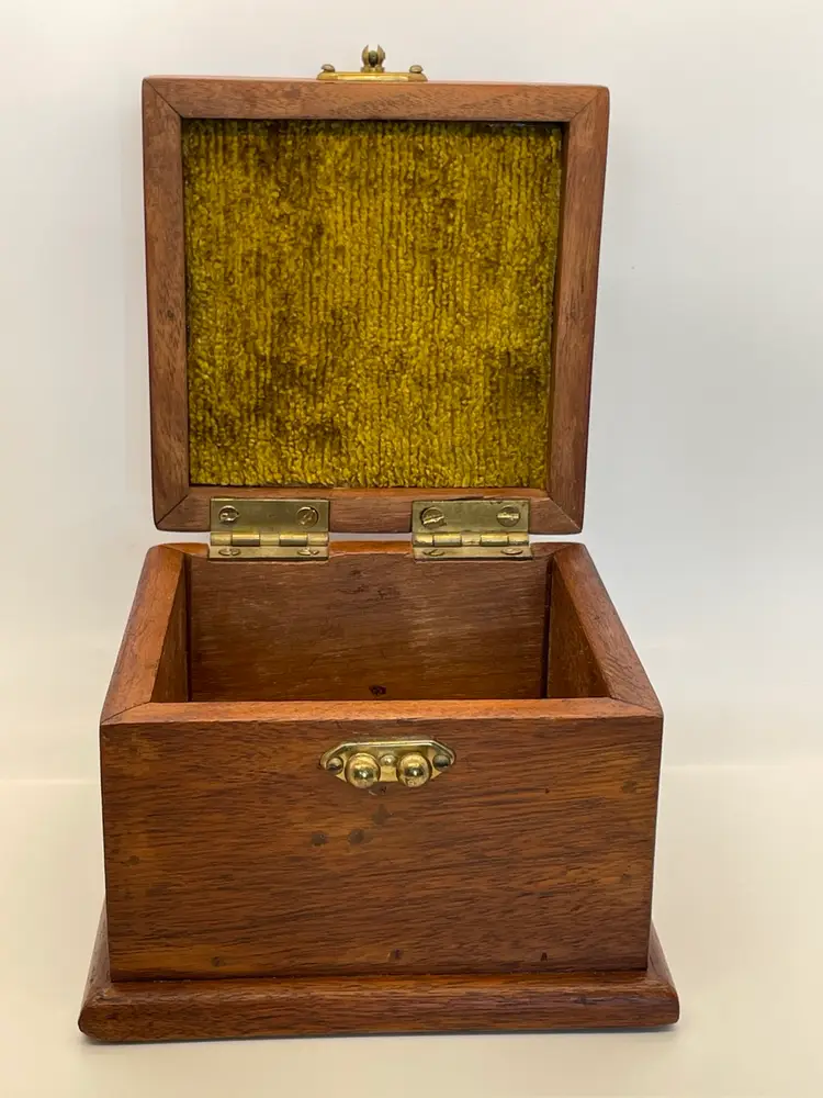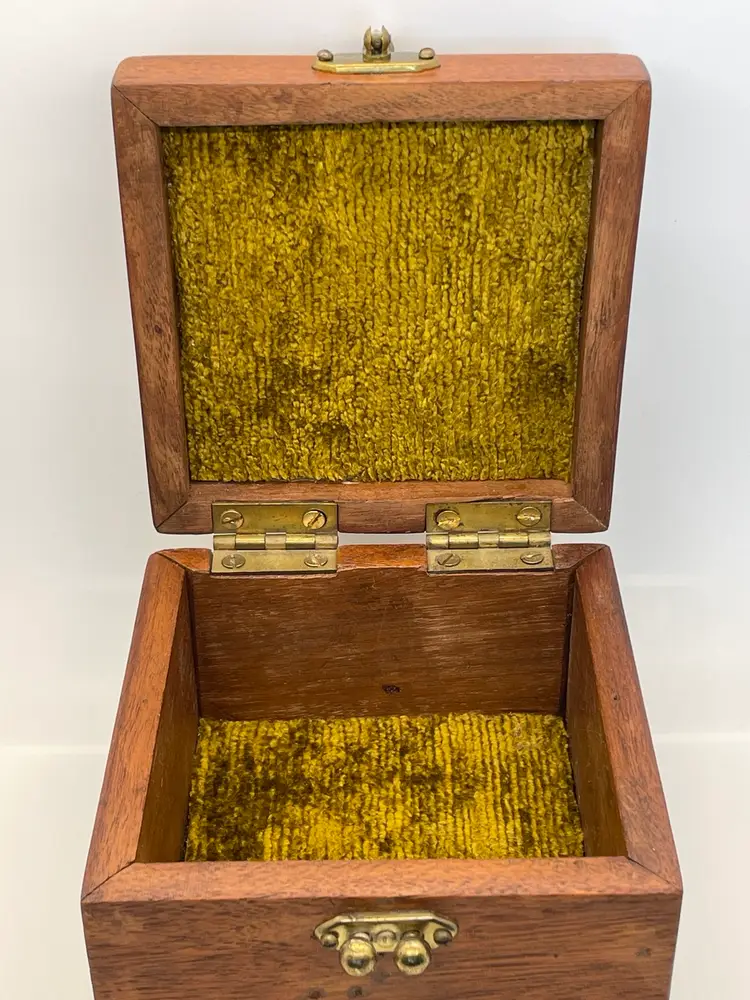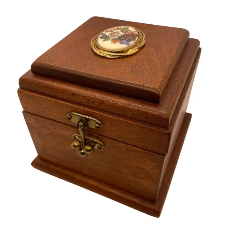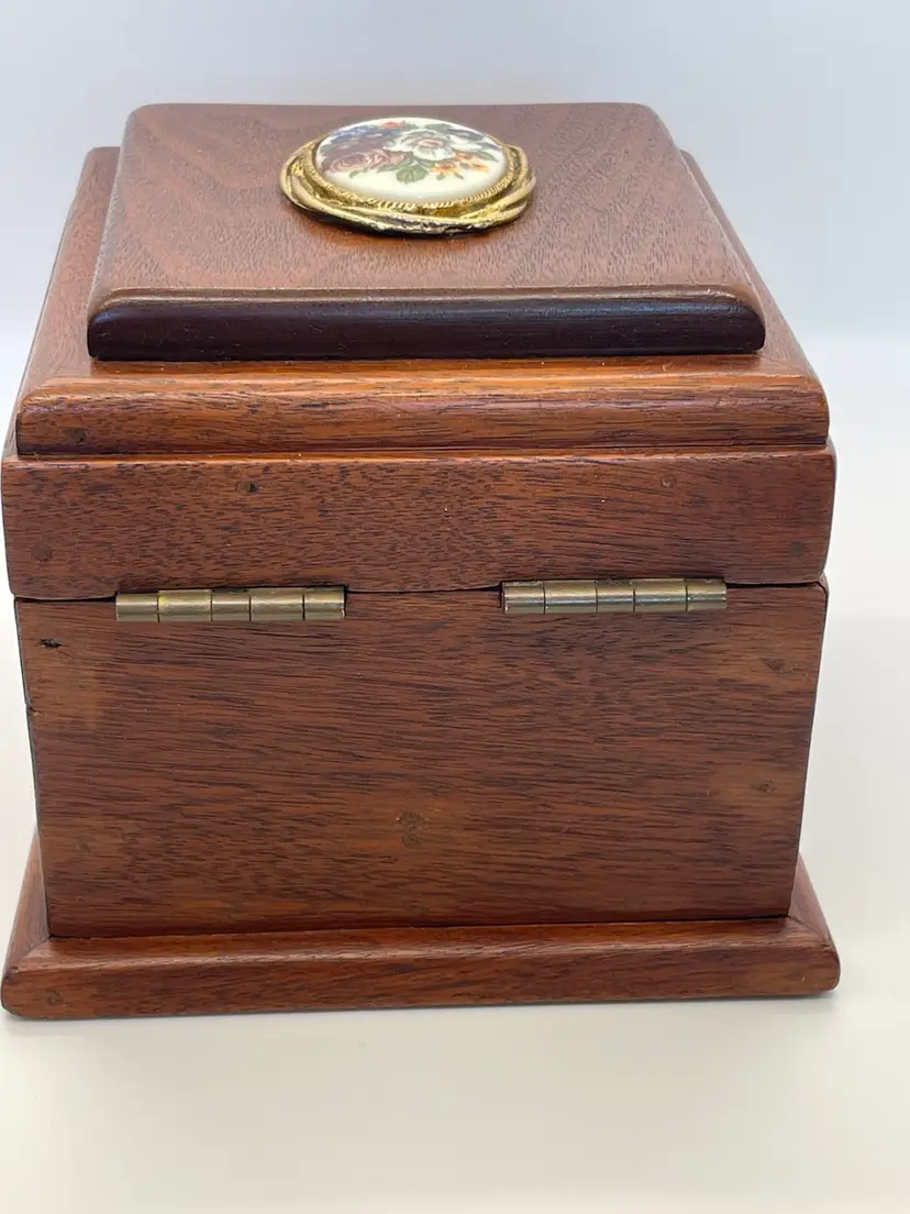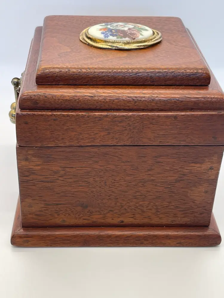 Beautifully made wood box with ceramic medallion, vintage closure and original lining, no cracks or damage to wood, great condition
