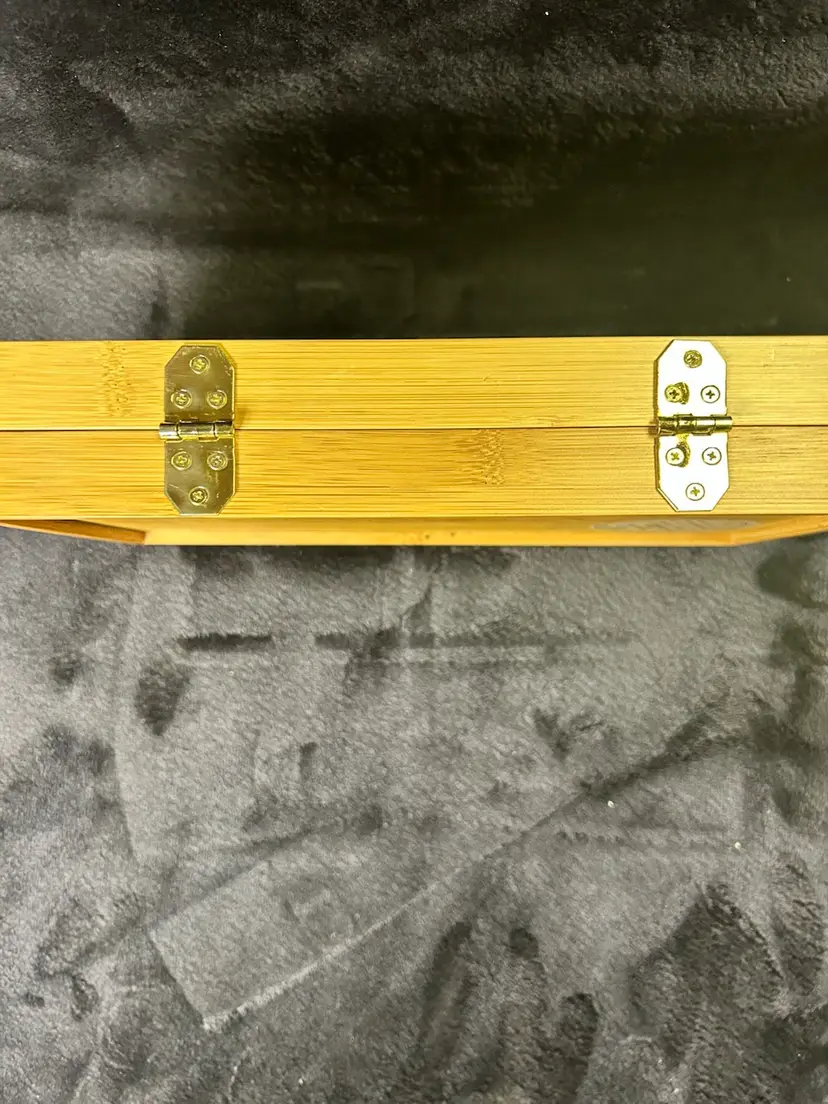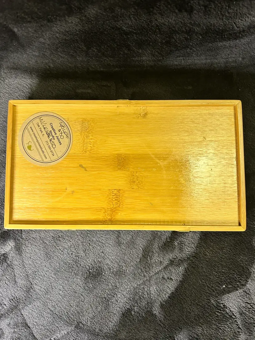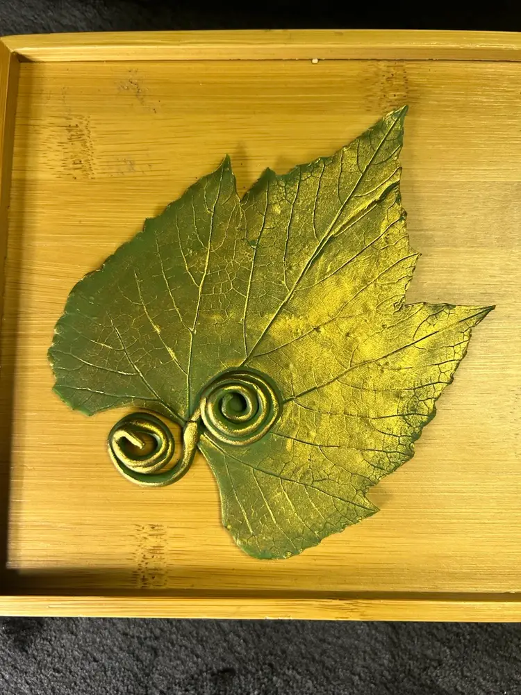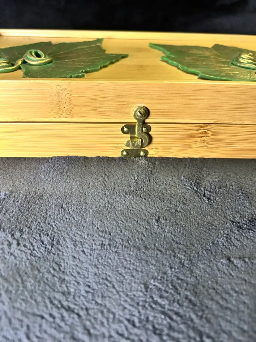 This handmade wooden box with metal leaves is a unique and decorative collectible piece. The medium-sized rectangle-shaped box features a beautiful brown wood finished design with intricate metal leaves showcasing a nature-inspired pattern. Made in the United States, this boxed item is perfect for storing small trinkets or jewelry while adding a touch of charm to any room. The combination of wood and metal materials gives it a rustic yet elegant look, making it a standout piece for collectors or those looking to add a special touch to their decor.