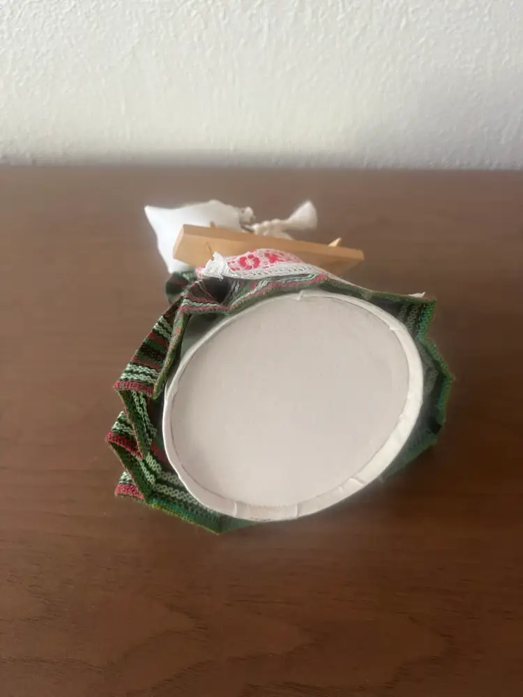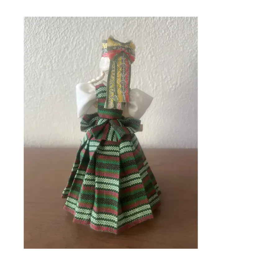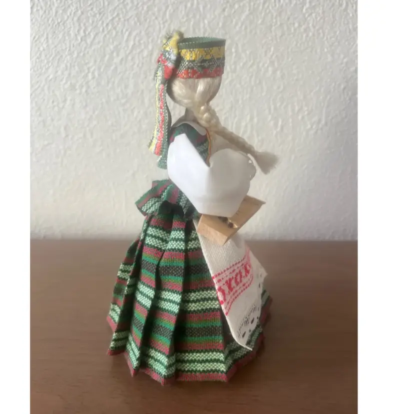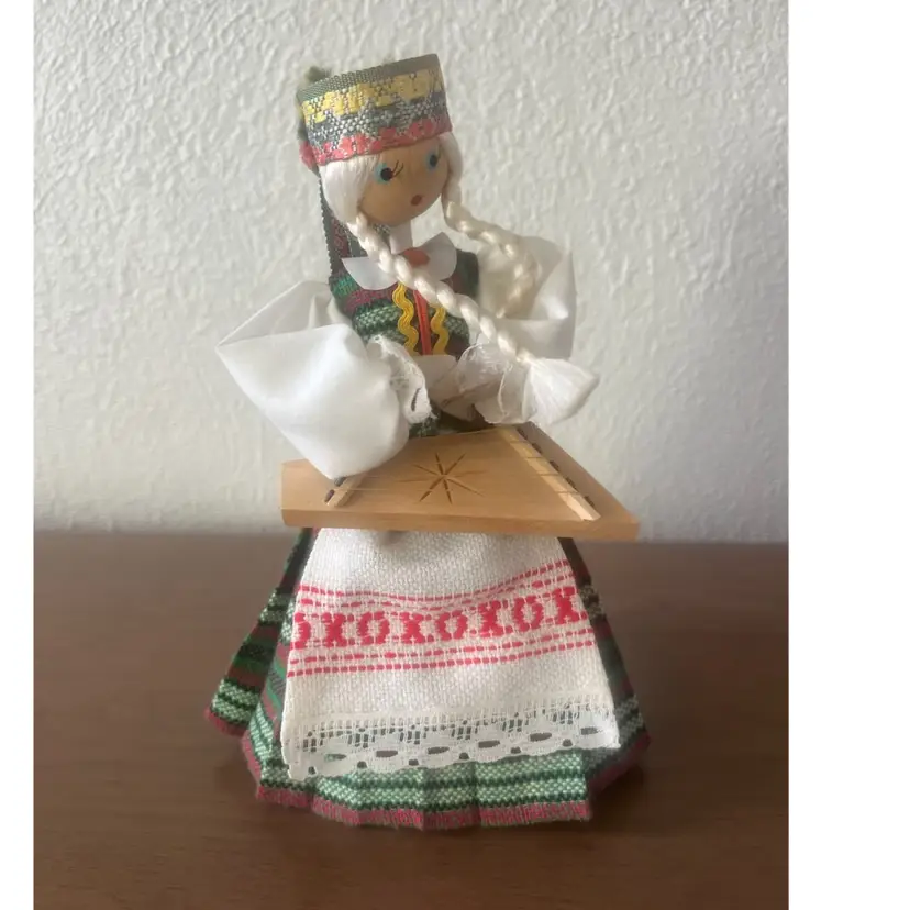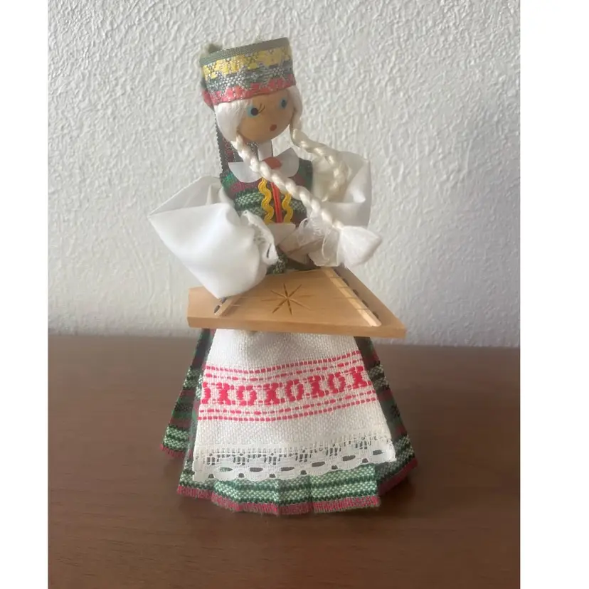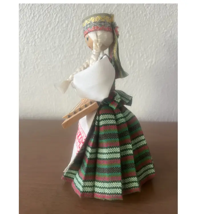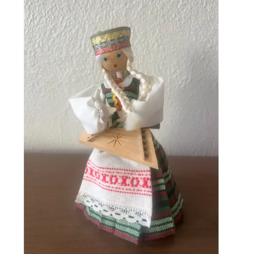 Handmade wooden doll from Lithuania, specifically dressed in a traditional costume from the Aukštaitija region. Features: The doll is crafted with a hand-painted face and is holding a musical instrument, likely a kanklės. Costume: The attire includes a woven headdress known as a galloon, a woollen skirt, and an embroidered apron. Cultural Significance: These dolls are created as folk art souvenirs to represent Lithuanian Baltic heritage.