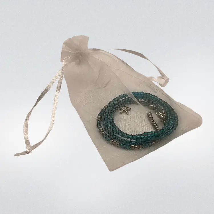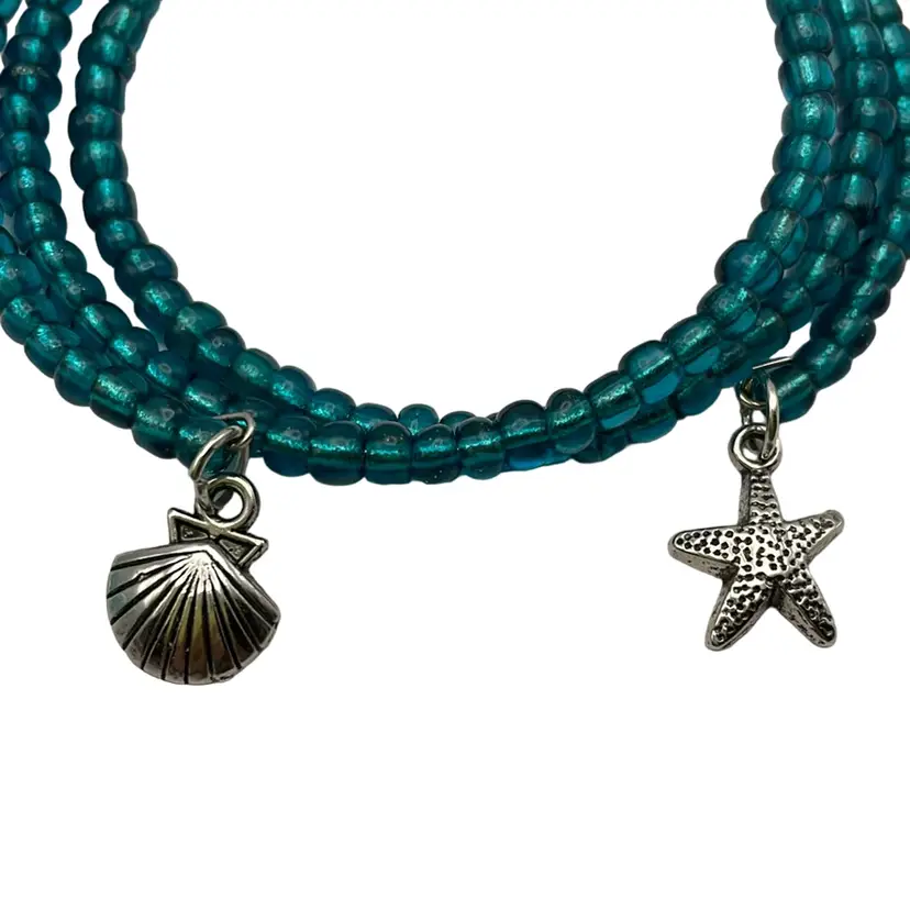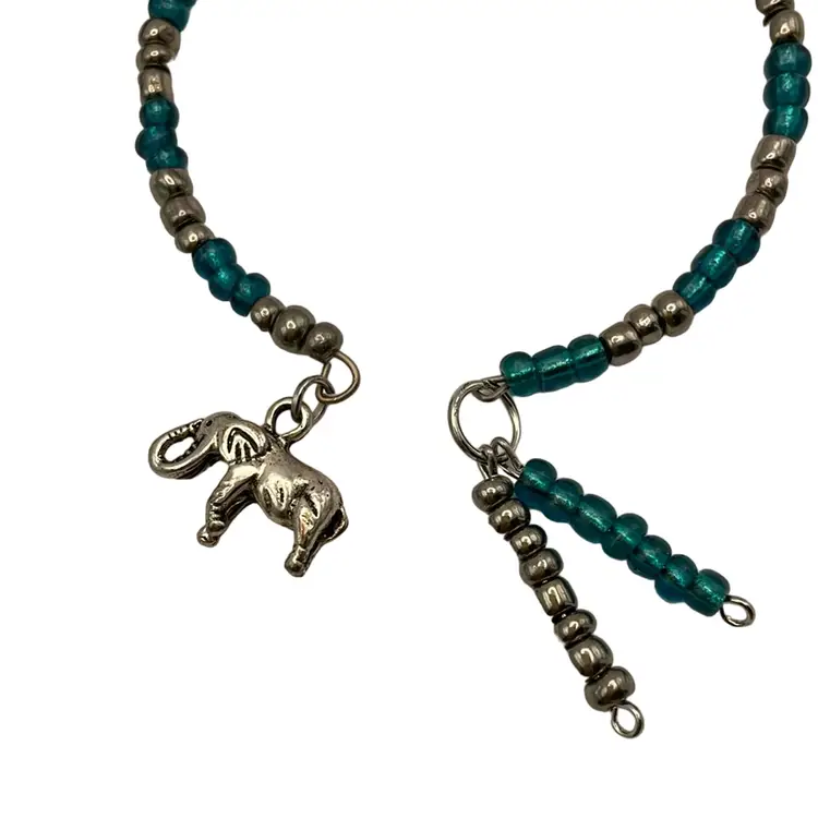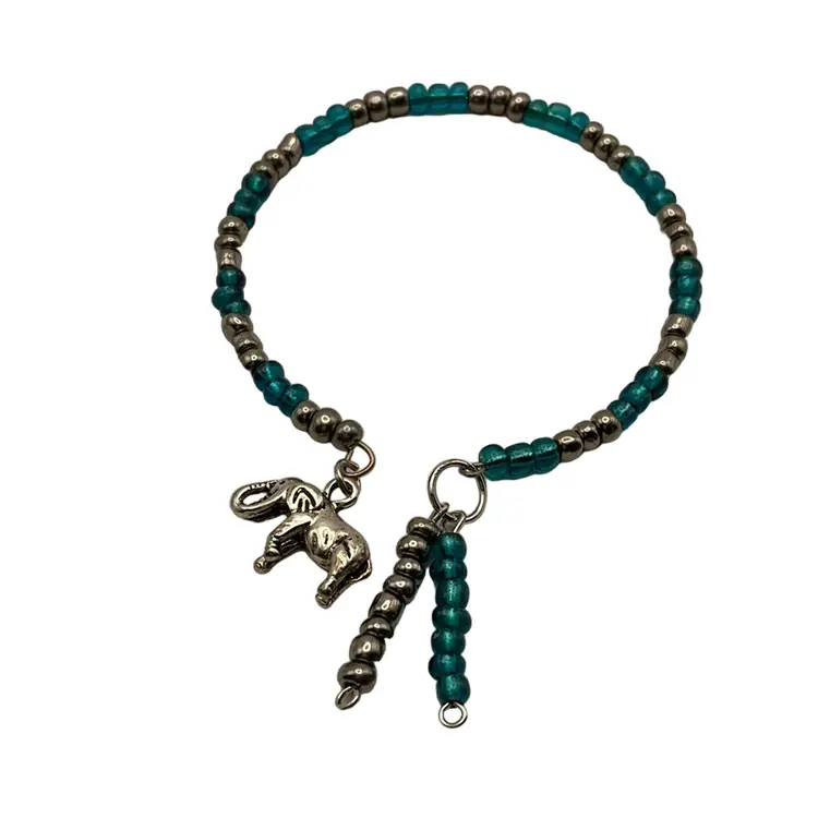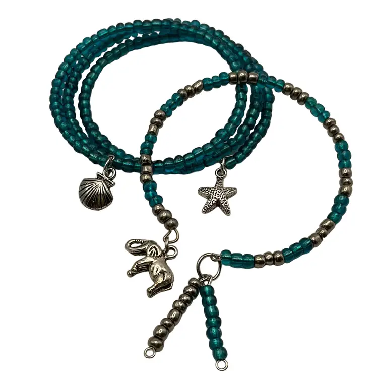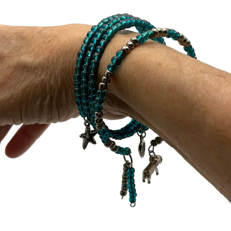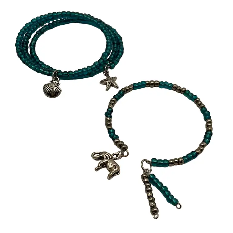 Handmade Wrap Bracelets, Turquoise/Pewter, Glass/Ceramic Bead, Silver Tone Charms, Elephant and Shells. Set of 2. Come in drawstring bag. Measure 2.5” across