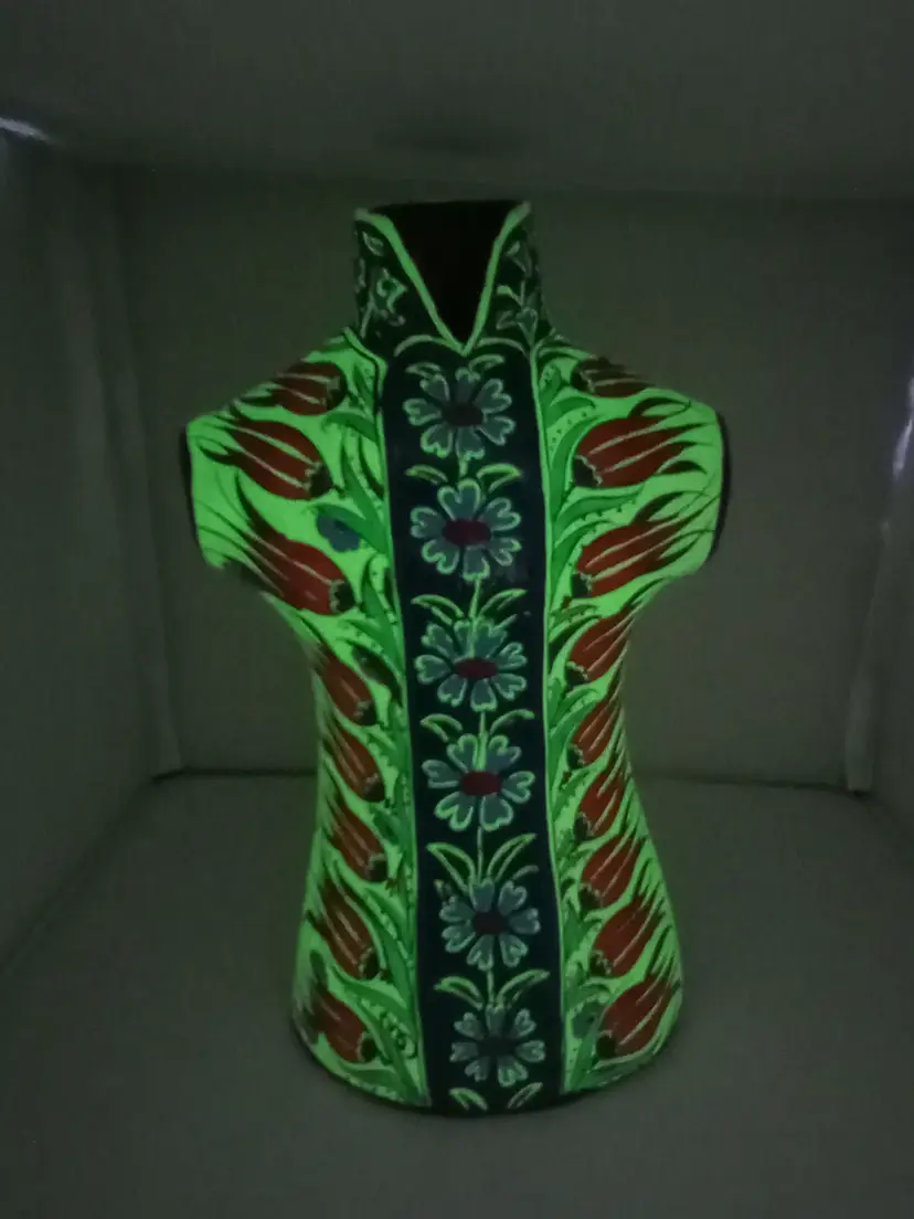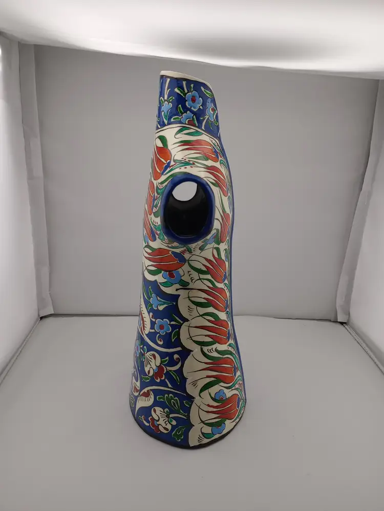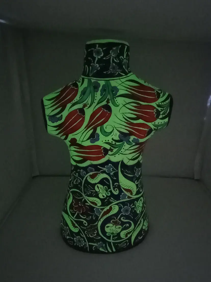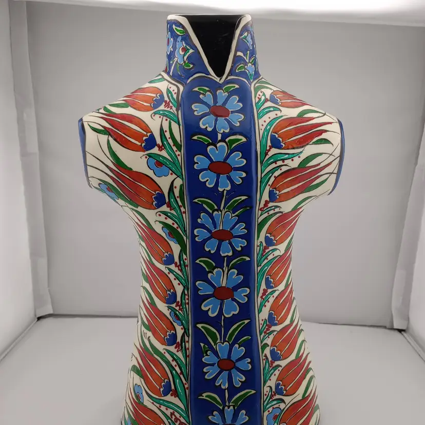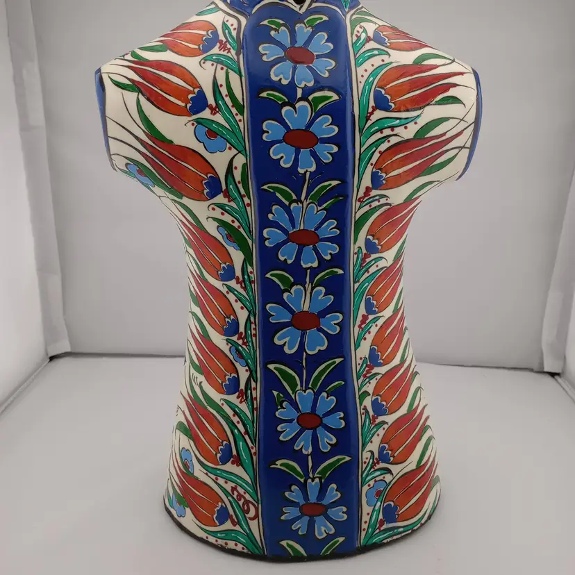 This is an amazing Turkish ceramic piece in the form of a caftan. It is handpainted and signed by the artist. It glows like crazy! It's 13.5" tall and 8.5" across and it's in excellent condition with no noted damage on the outside, one small spot of peeling/chipping paint on the inside near the bottom as shown in the last photo.