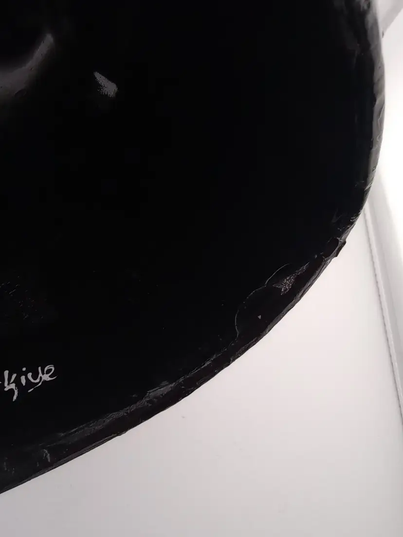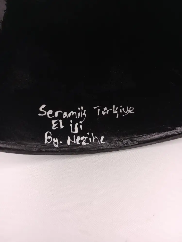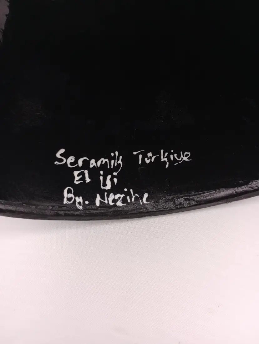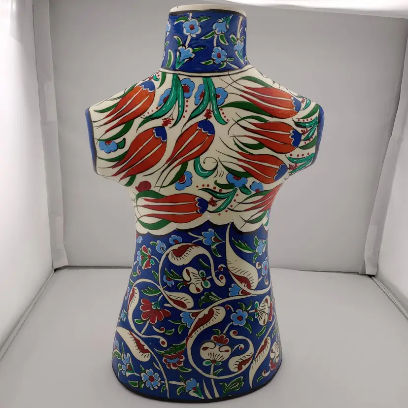This is an amazing Turkish ceramic piece in the form of a caftan. It is handpainted and signed by the artist. It glows like crazy! It's 13.5" tall and 8.5" across and it's in excellent condition with no noted damage on the outside, one small spot of peeling/chipping paint on the inside near the bottom as shown in the last photo.