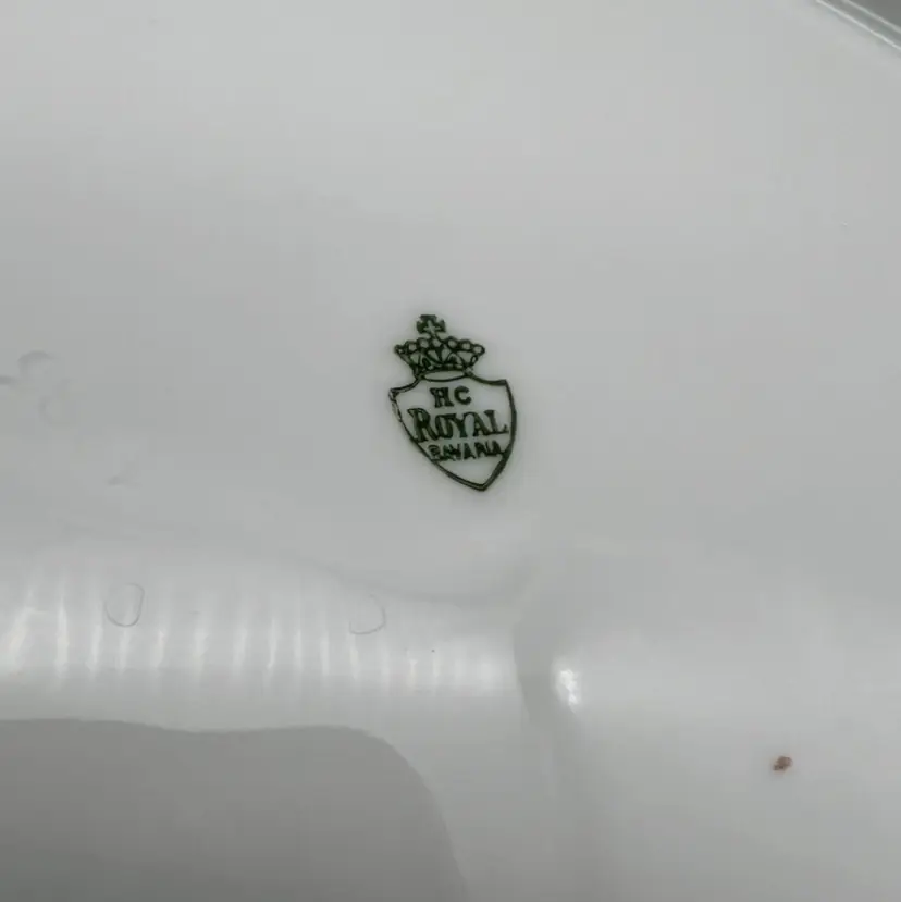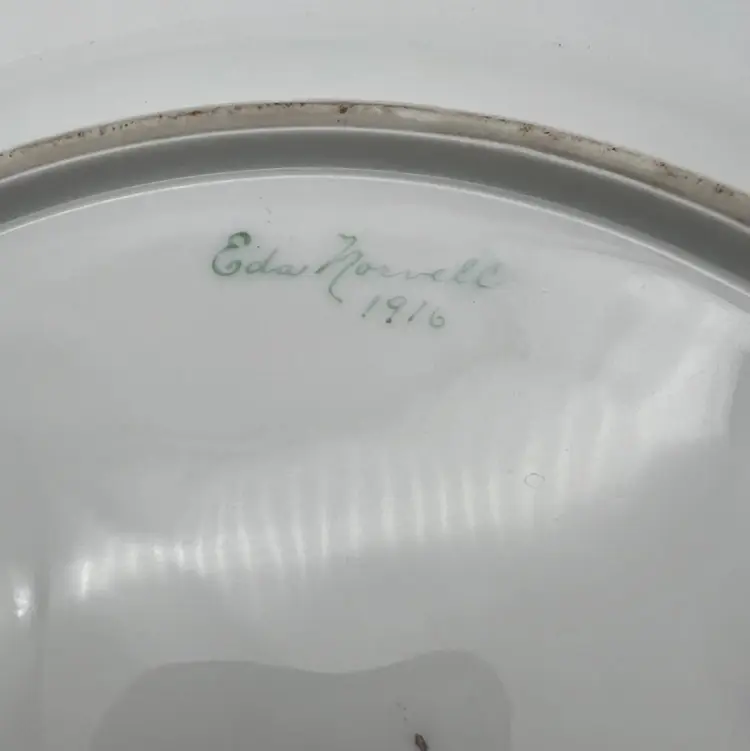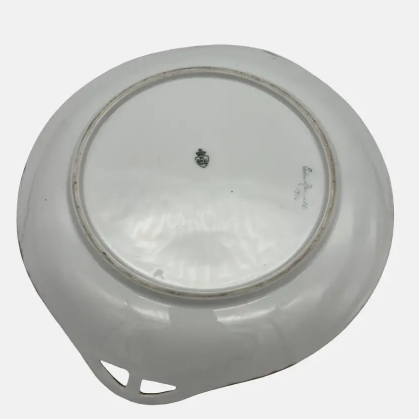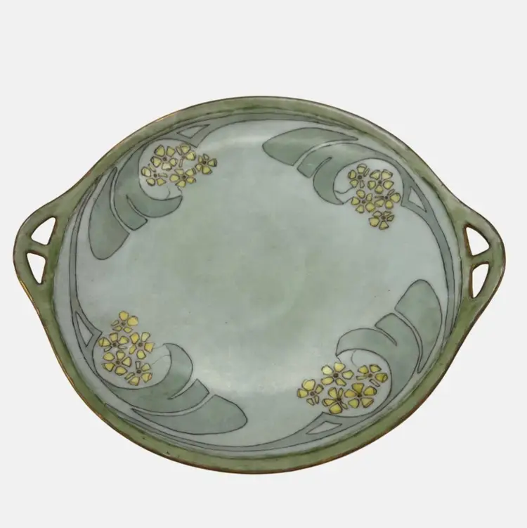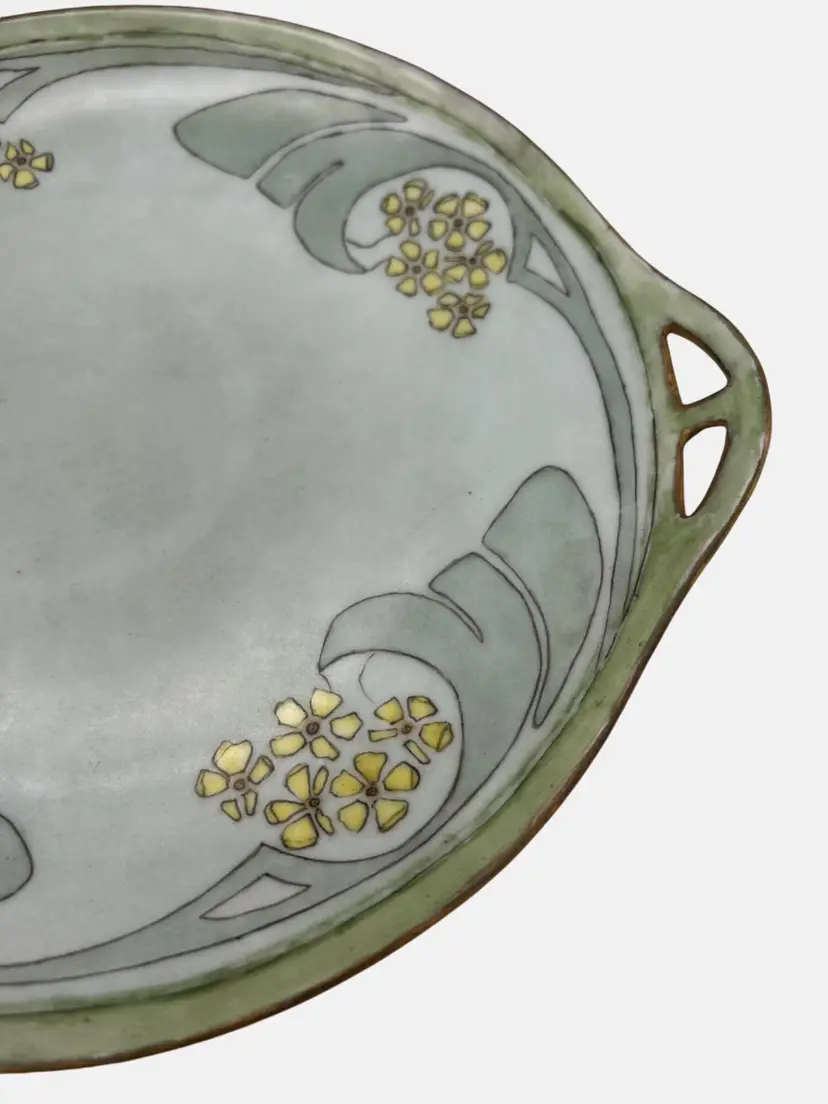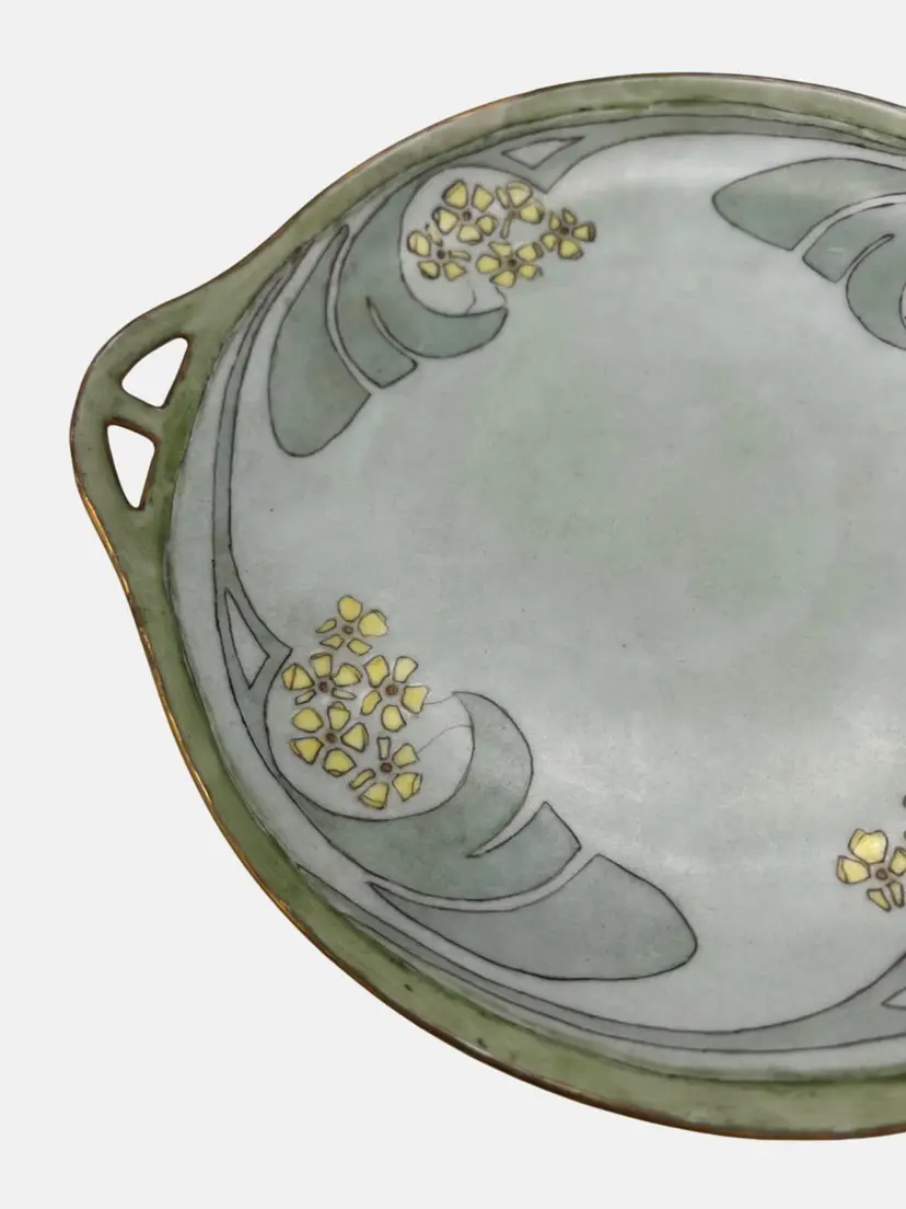 This antique HC Royal Bavaria plate showcases a hand-painted floral design by Eda Norvell, dated 1916. The plate measures 10.25" from handle to handle. The plate is decorated with shades of green and yellow flowers.