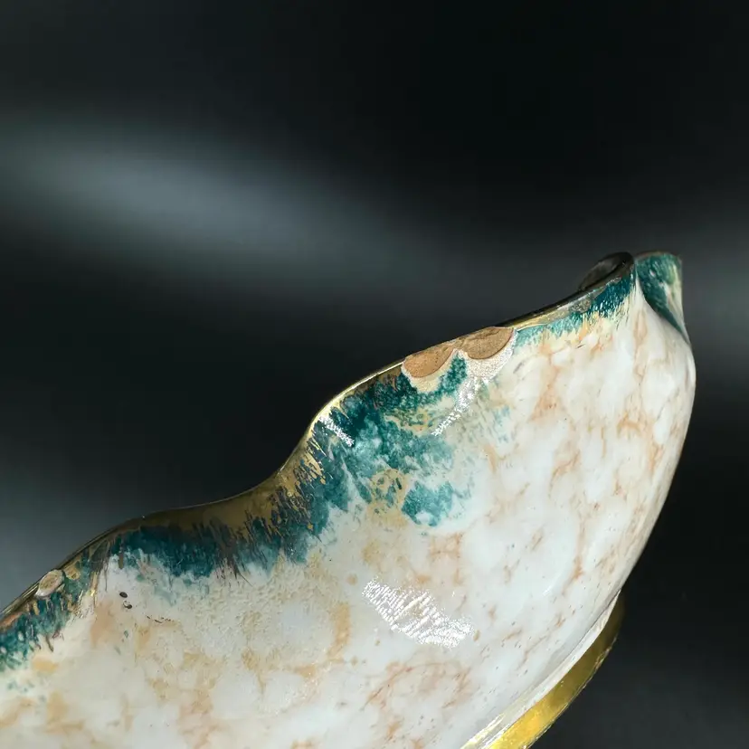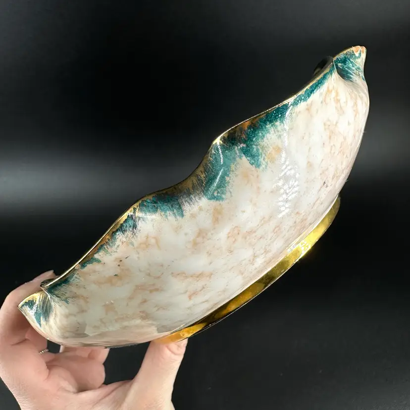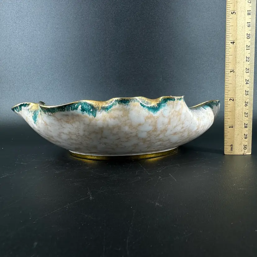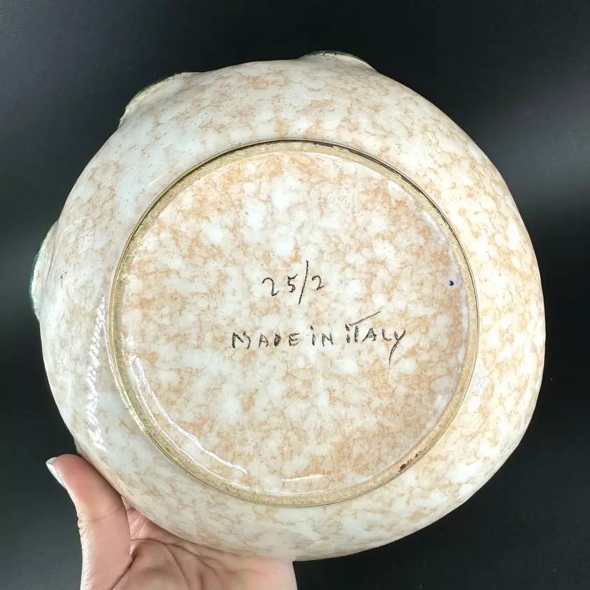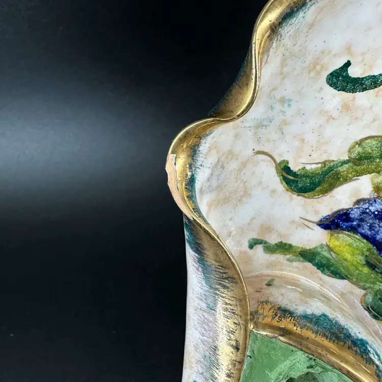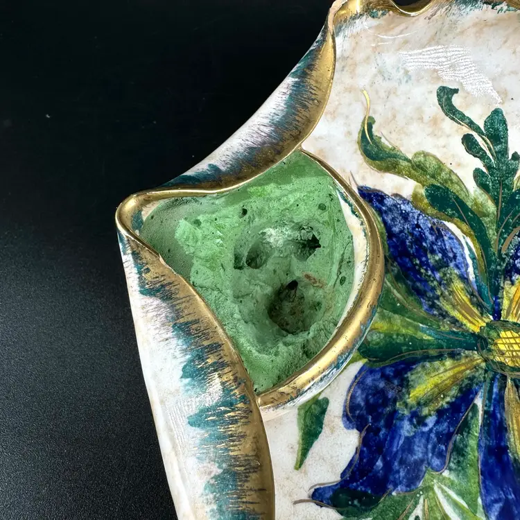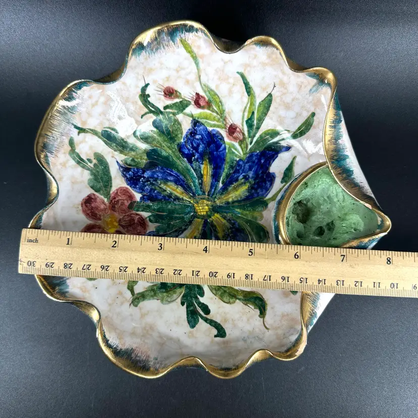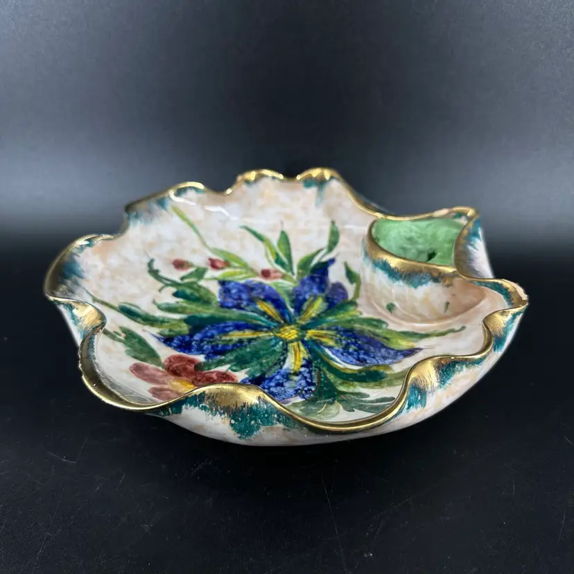 Italian pottery dish with flower frog featuring handpainted floral designs and gold luster ruffled edge. No cracks but there are a few chips around rim as shown. Flower frog material is worn. Dish measures approximately 8” x 8”. Handpainted marking “25/2 MADE IN ITALY” on bottom.