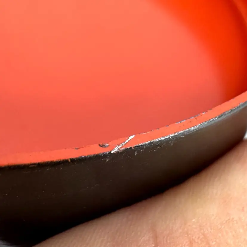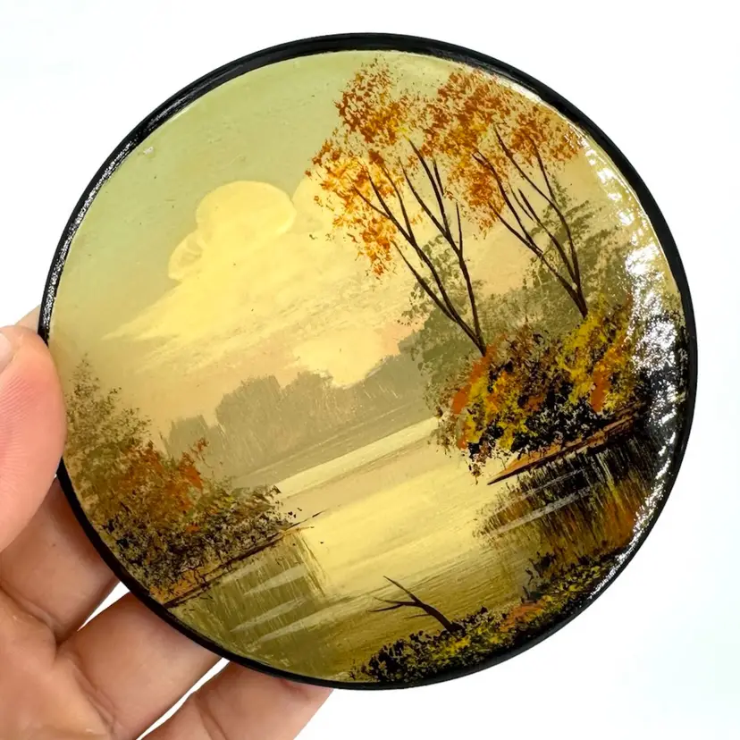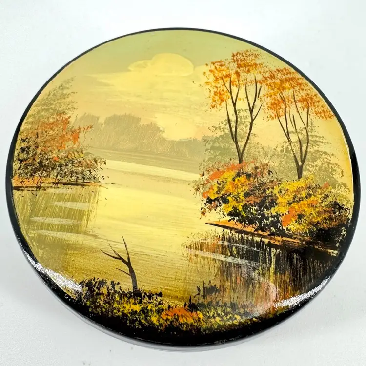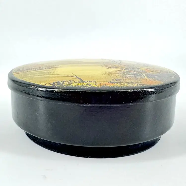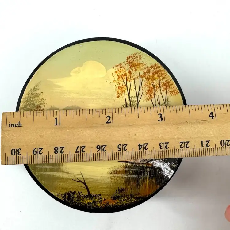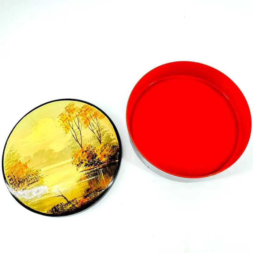 This is a handpainted metal trinket box there is some little scratches in the paint can be seen in the photos. There are NO chips or cracks anywhere also NO signatures or markings were found.