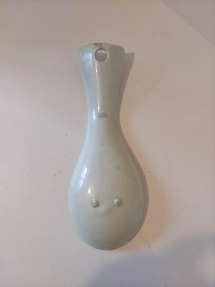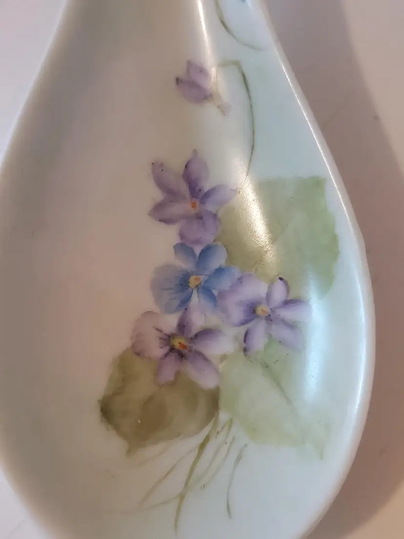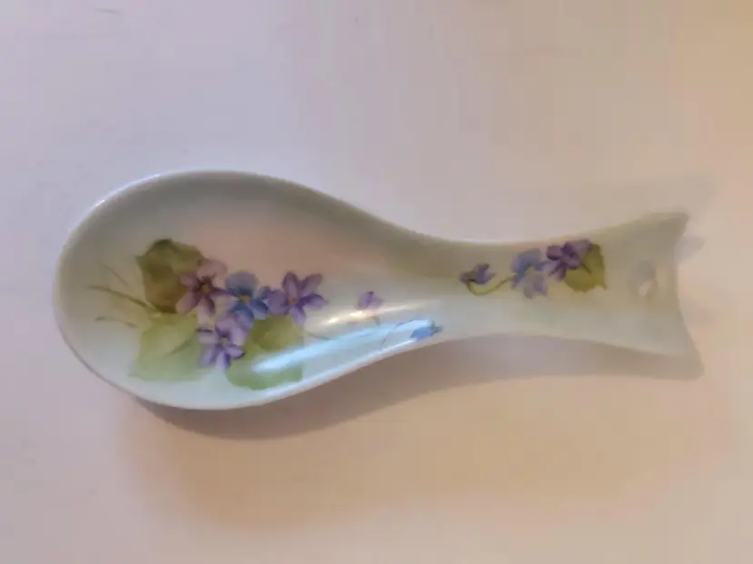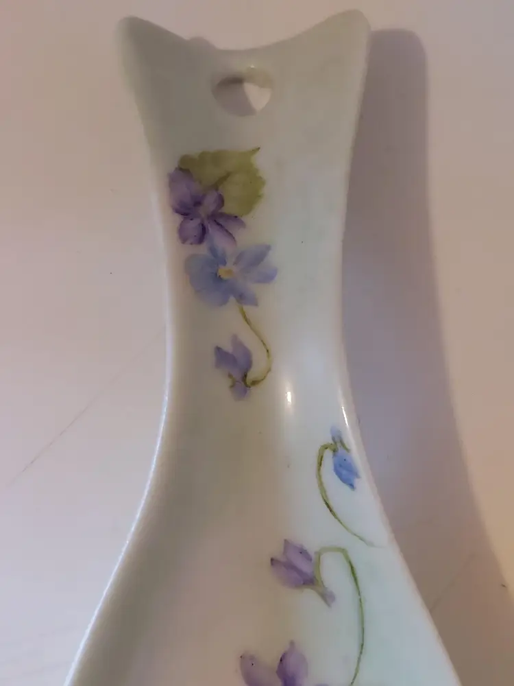 This beautiful handpainted spoonrest is unmarked. It measures approximately 7.75×2.75 inches and is in good condition.