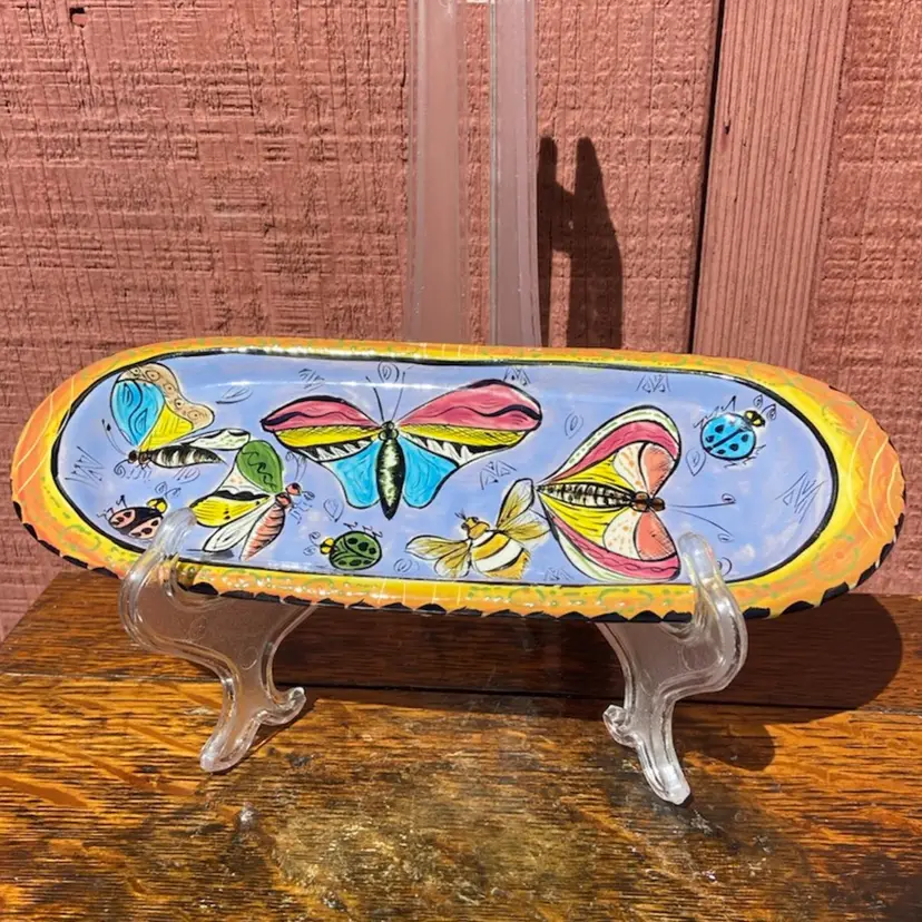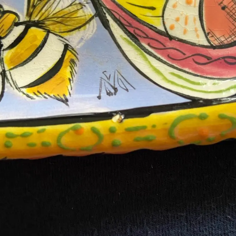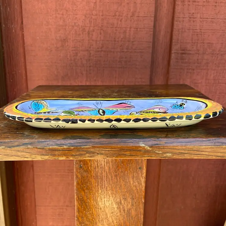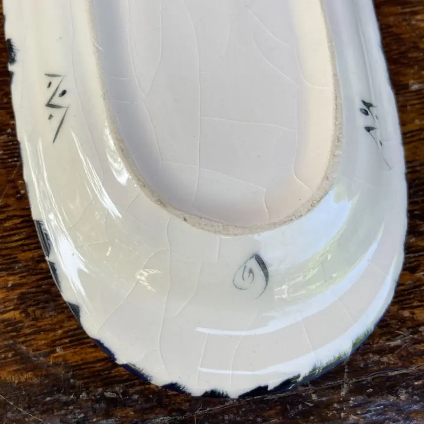 Approx 9”l x 3 3/8”w x .75”h. Preowned condition. No chips or cracks. Crazing. See last image for one area of paint flaw. See images as part of description.