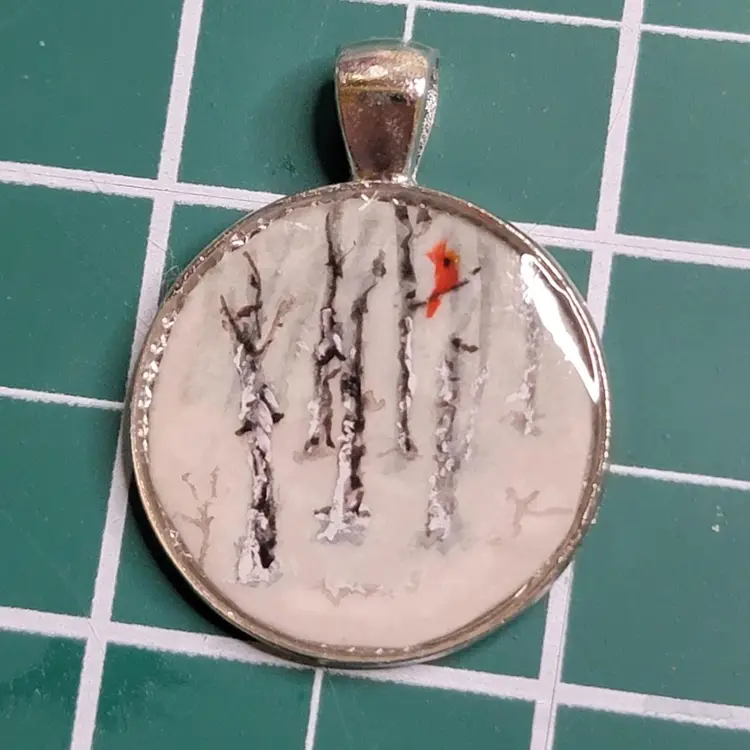 Handpainted Watercolor Cardinal In Winter Bird Pendant. To prolong finish, do not get wet (bathing, swimming, sweat etc...).