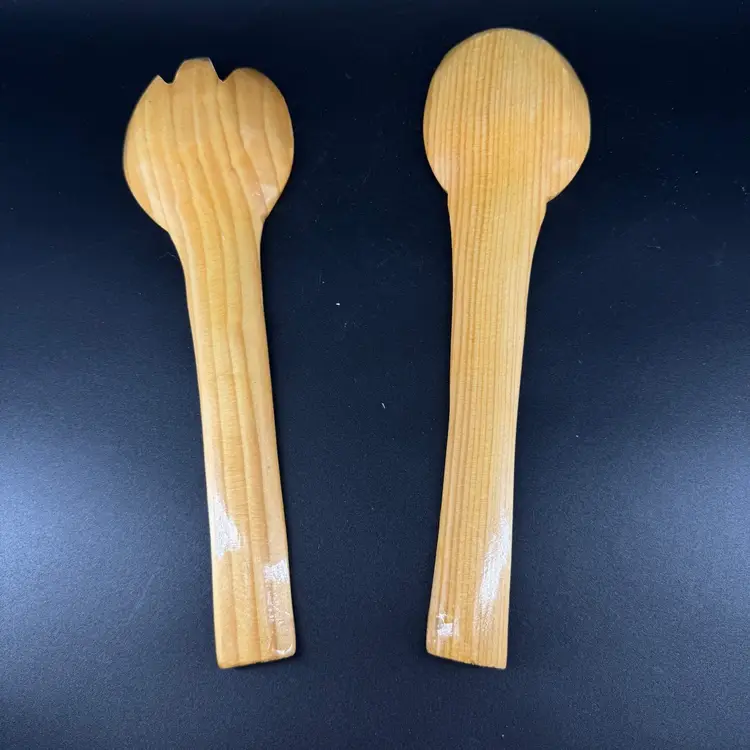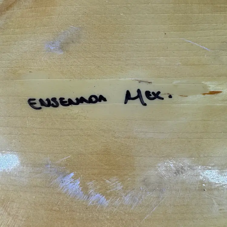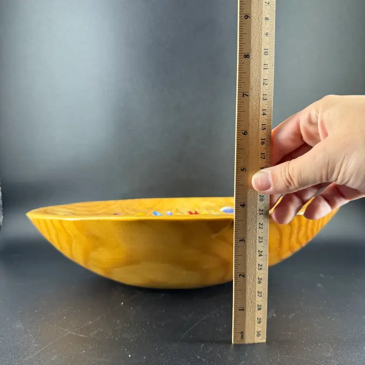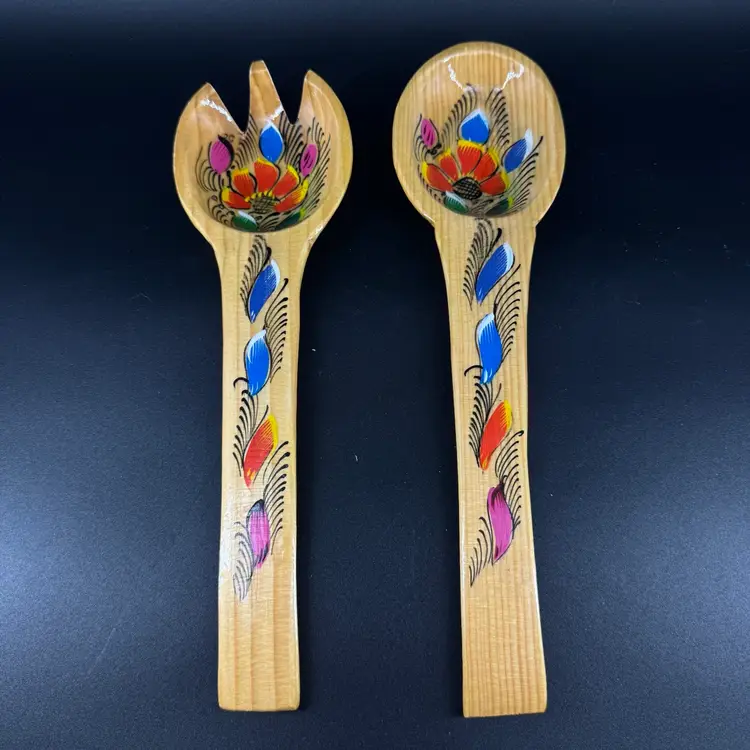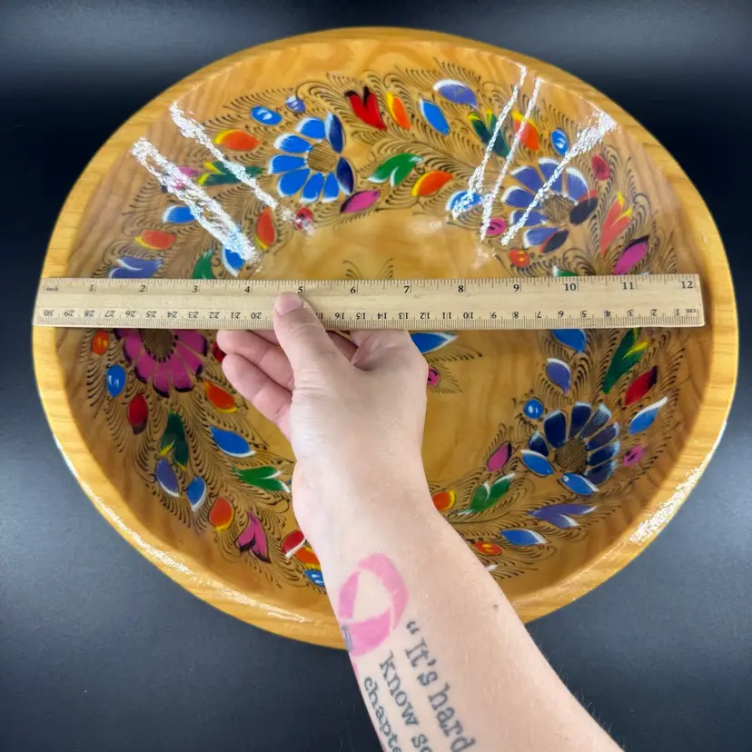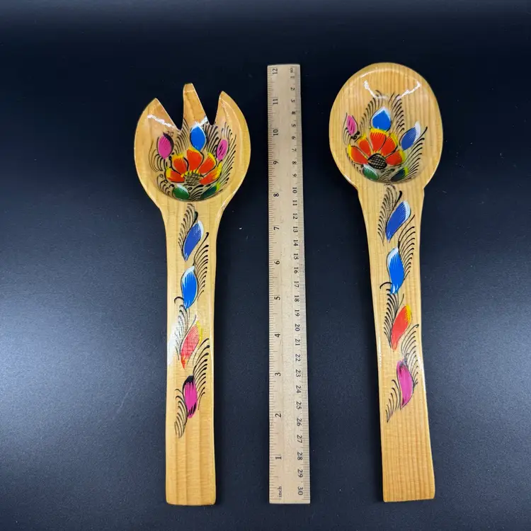 This hand painted wooded salad bowl is approximately 12.5 “ wide and approximately 4” tall. The spoons are approximately 11” and 12”. There are no chips or cracks. Is signed on the bottom e”Ensenada Mex.