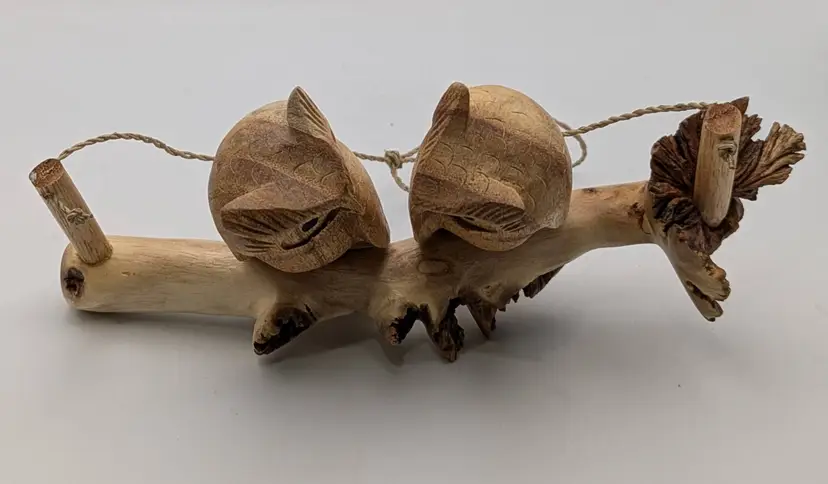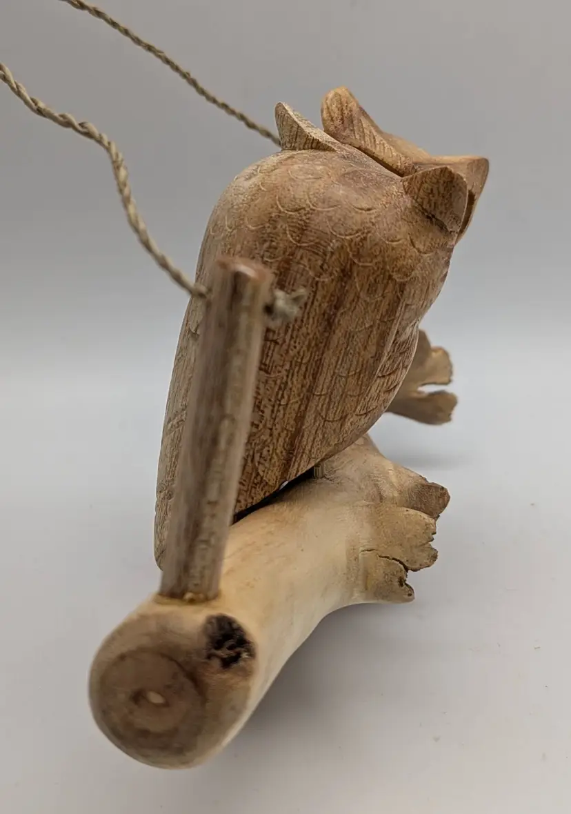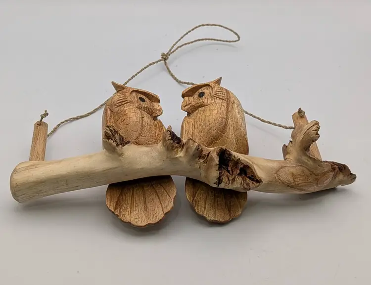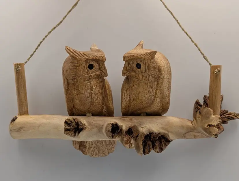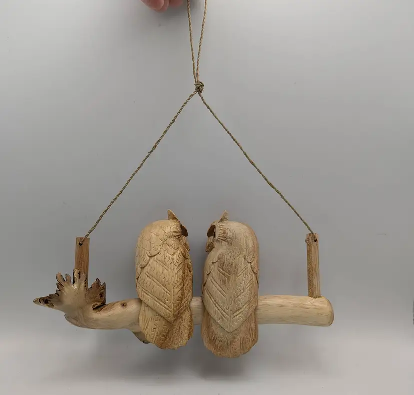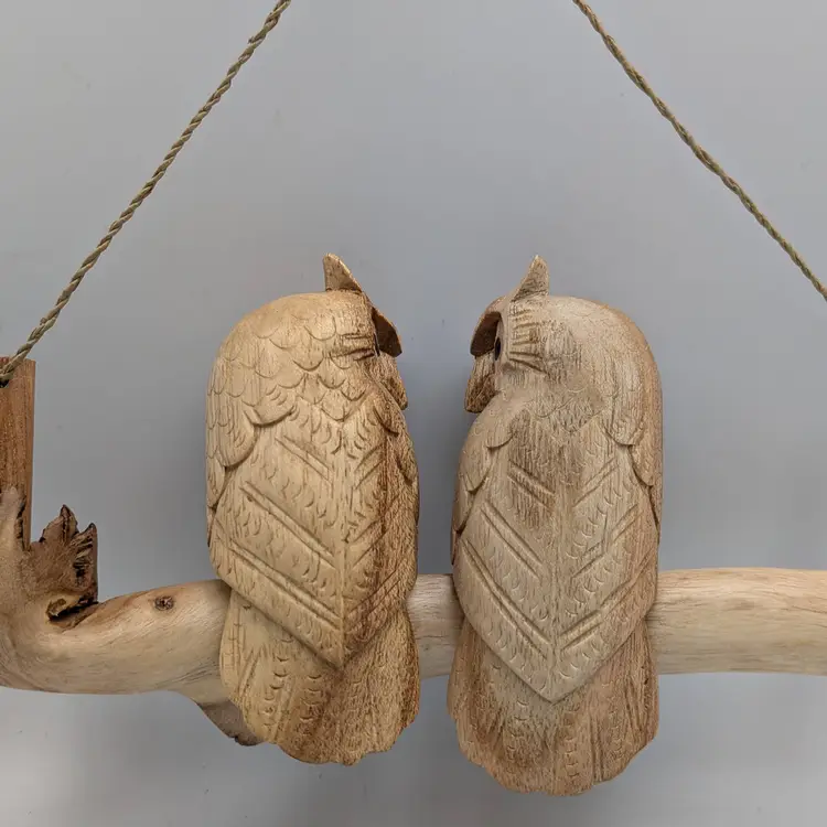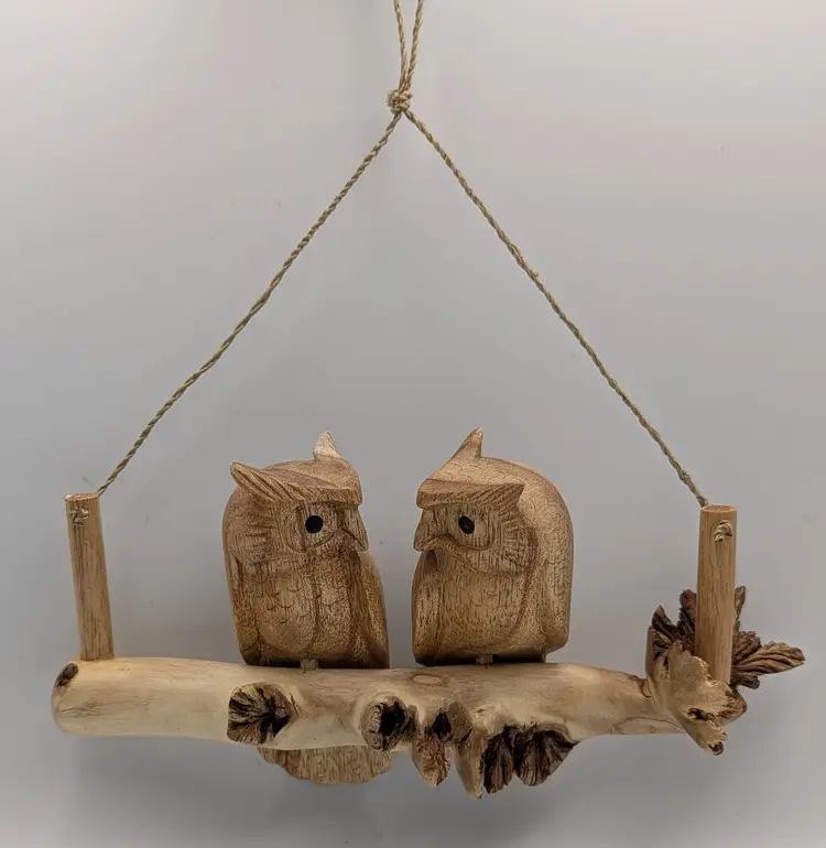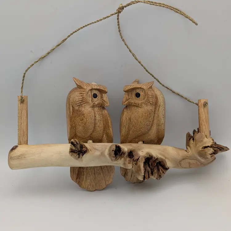 This wood art is from Indonesia The owls are hand carved using the local wood - Jempinis wood. The base, or branch, the owls are perched on is made of Parasite Wood Parasite wood is created by the growing plant trying to fight off parasites. It has become a staple to this countries artwork.