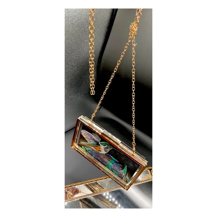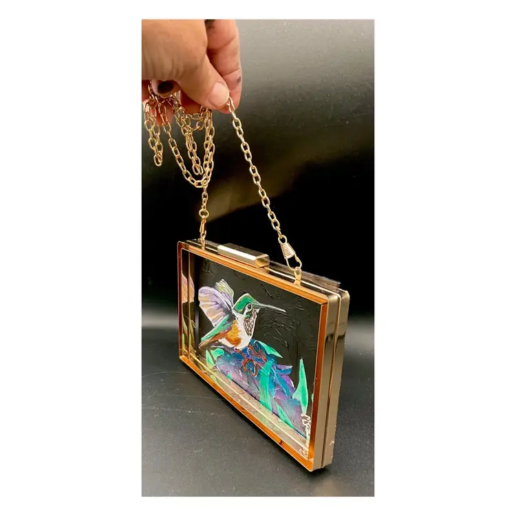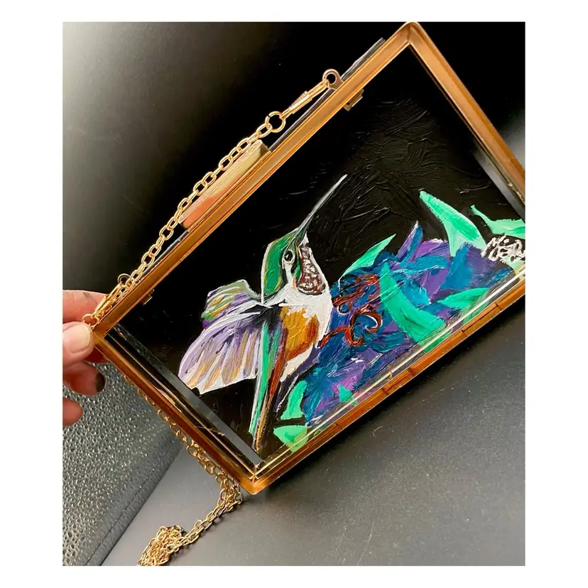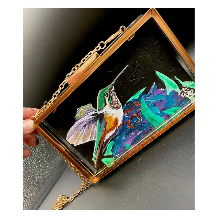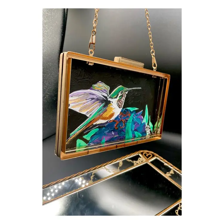 New original hummingbird painting On 7”x5” canvas board attached to a gold, pre loved purse frame. Would be a great addition to a gallery wall❤️ Good condition #1166
