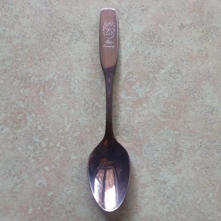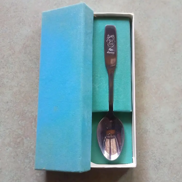 Celebrate your 25th anniversary in style with this Happy 25 Silver Anniversary Collector Spoon. This silver novelty spoon is made of metal and measures approximately 11 x 2.5 cm, making it the perfect size to display in your collection or use for special occasions. The sleek silver design of the spoon adds an elegant touch to any anniversary celebration, and its collectible nature makes it a wonderful keepsake for years to come. Whether you're looking to add to your collection of decorative spoons or searching for a unique gift for a special couple, this Happy 25 Silver Anniversary Collector Spoon is a must-have item.