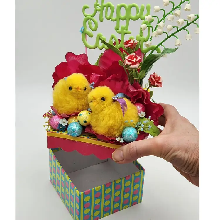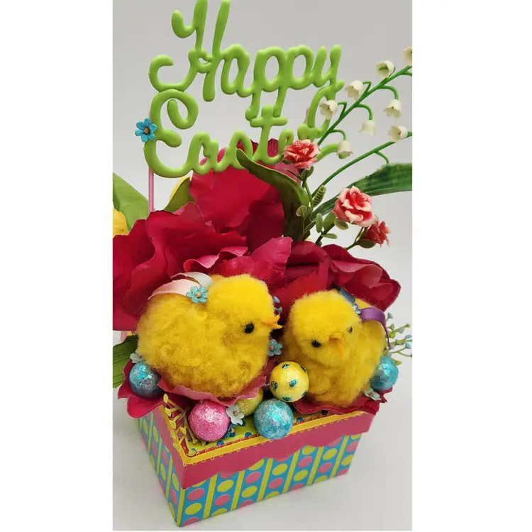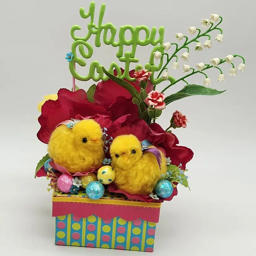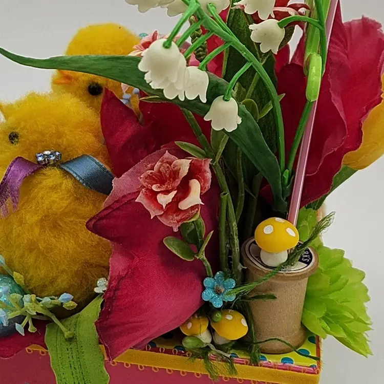 Made with very old pom pom chicks, vintage plastic flowers, handmade polymer clay mushrooms & some added sparkle, this FUN 'Happy Easter Assemblage' is 6"w x 9¾"h. It's also a GIFT BOX that measures 4¼"square x 2½" deep, for a super special gift or a personal note? Hope you like it as much as i enjoyed putting it together. Thanks for looking!
