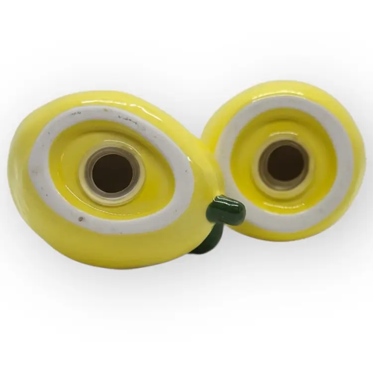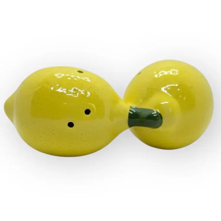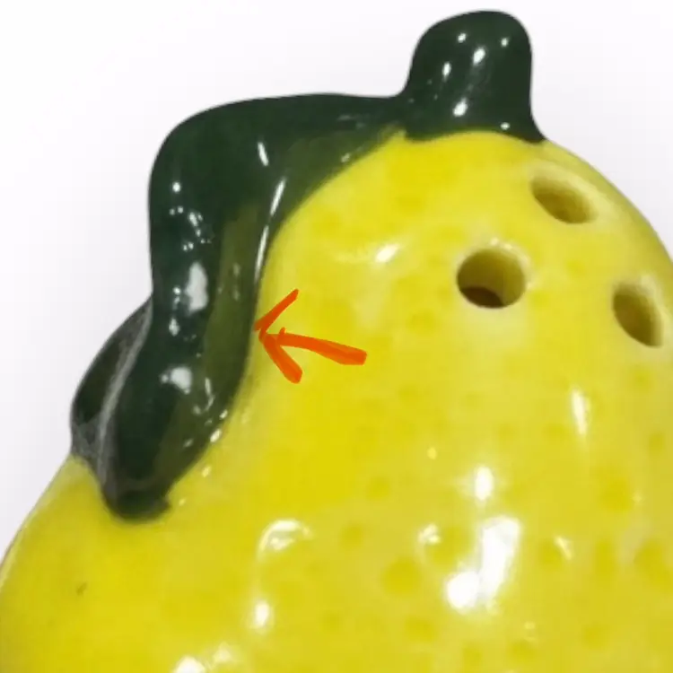 This cute salt & pepper set is not vintage, but has a vintage vibe with their little painted on faces! In near perfect condition, the pepper shaker does have a tiny chipped dot on the back edge of the leaf, which is not visible from the front. See last picture for detail. They are roughly 3” long/tall and the tallest is about 3” too. They both have their original stopper, both in great shape.