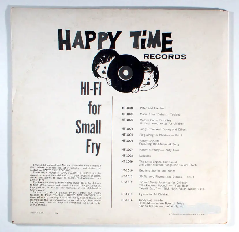 Little Toot, by Happy Time, is a series of songs for children. Leading educational and Musical authorities have combined their talents to choose the list of selections and stories presented on Happy Time Records. These High Fidelity Long Playing Records are designed to present the child with a complete program of songs, stories and games to cover all phases of development from ages 2 to 9. The foremost aims of Happy Time Records is for children to find fun in music; and provide them with happy sounds as they grow up, as well as fond memories of their childhood in future years.