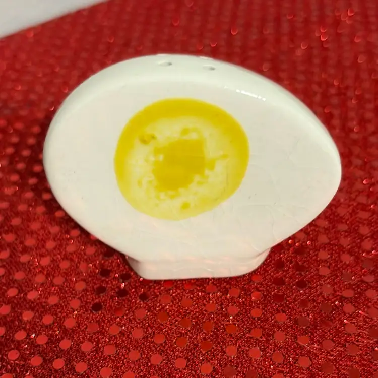 This is a set of vintage ceramic hard-boiled egg salt and pepper shakers. These shakers are functional and collectible items, often made of porcelain or ceramic, and designed to add a fun, kitschy touch to a kitchen or dining table. A little bit of crazing on one of them.