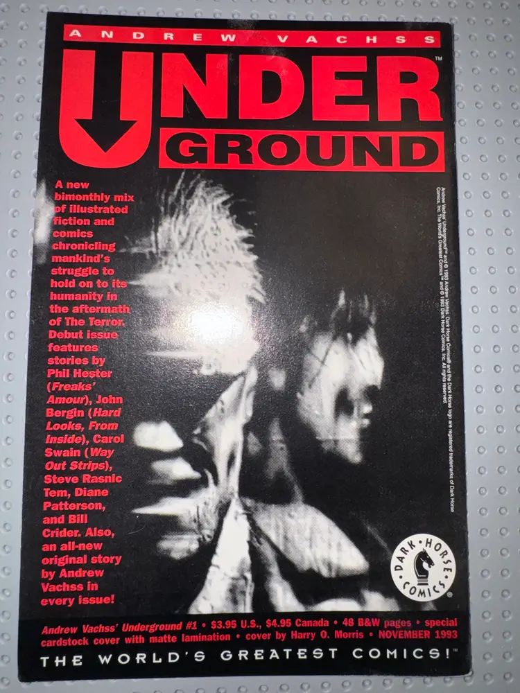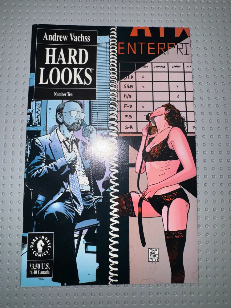 Up for sale is Hard Looks #10, written by Andrew Vachss and published by Dark Horse Comics in the early 1990s. This gritty crime-themed issue features a stylized cover split by a spiral notebook motif: one side displays a man in a suit smoking in an office setting, the other shows a dominatrix figure in lingerie holding a whip beside a coded relationship chart featuring initials such as S&M, H/S, F/D, R/S, S-R. Series Title: Hard Looks Issue Number: #10 Publisher: Dark Horse Comics Publication Year: Circa 1993 Writer: Andrew Vachss Art Style: Noir realism with symbolic formatting Cover Design: Spiral notebook layout split between domestic and fetish-themed personas Condition: Good or better – Cover intact with handling wear consistent with age. Spine solid; interior pages complete. Stored bagged and boarded.