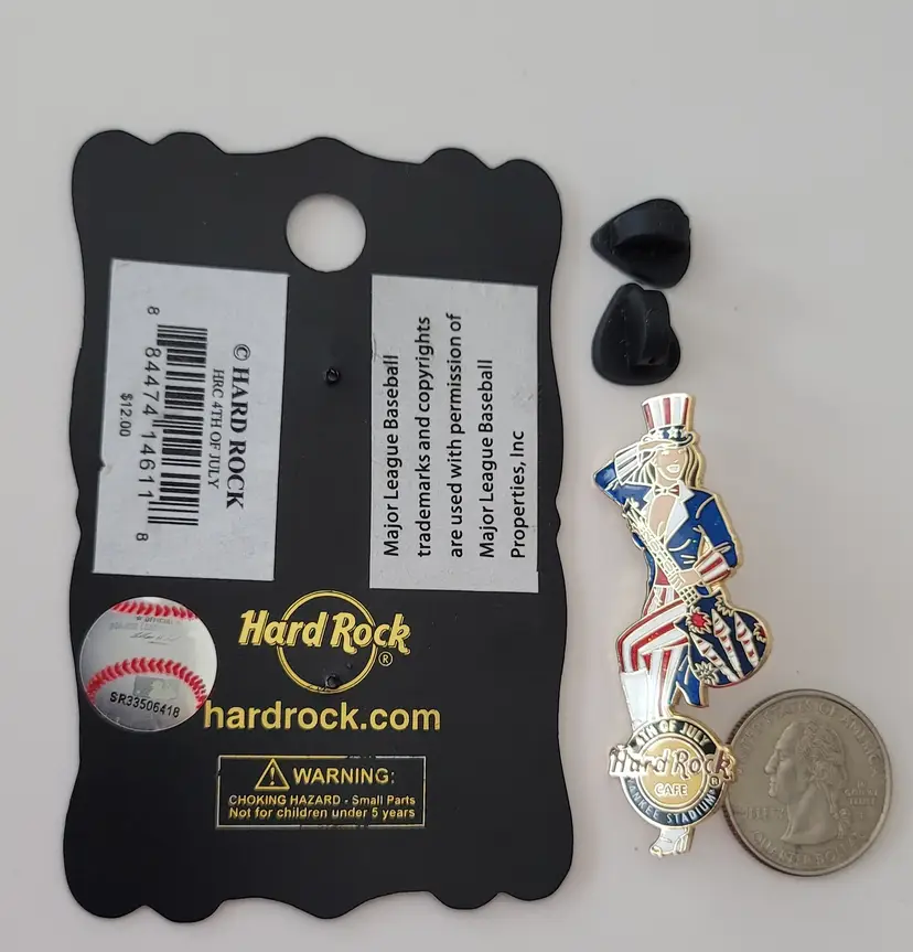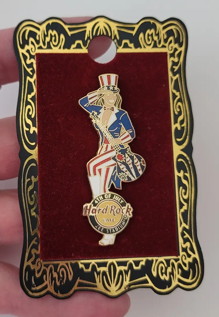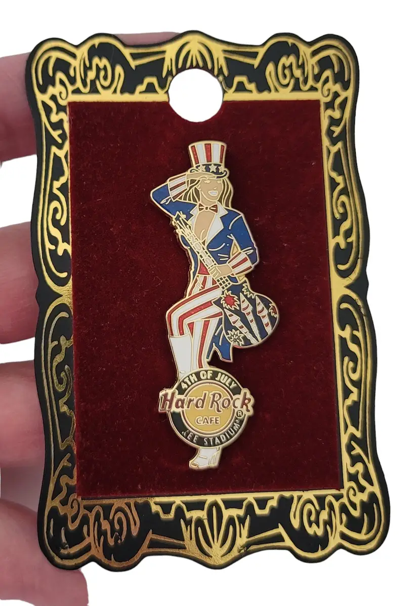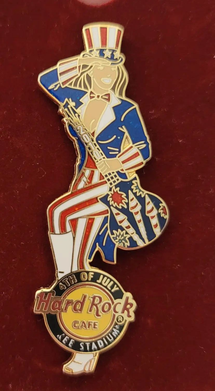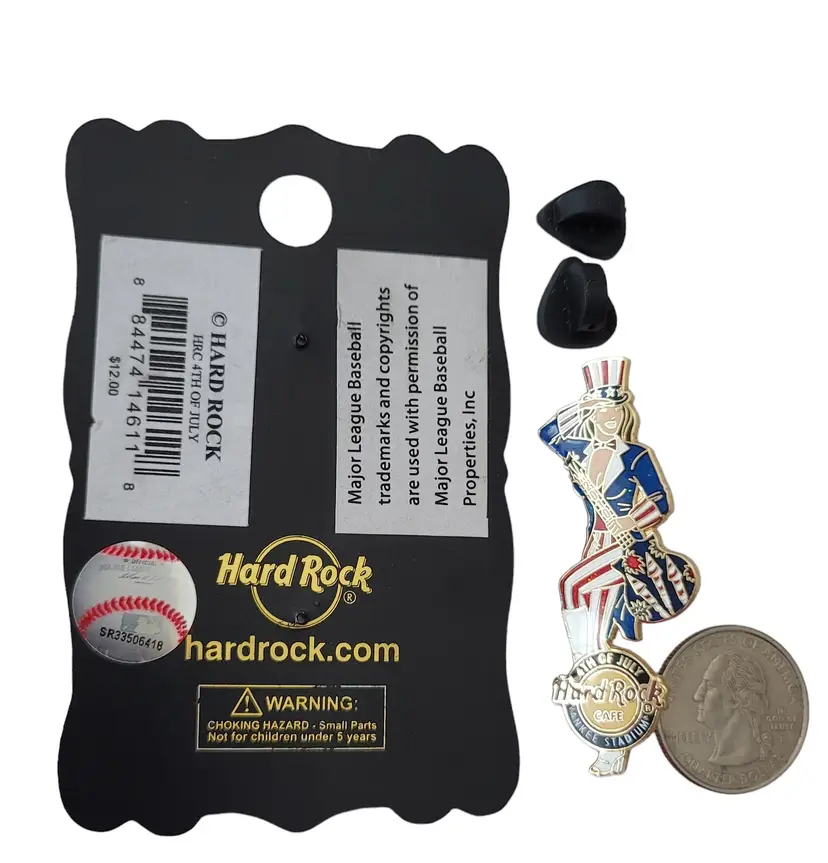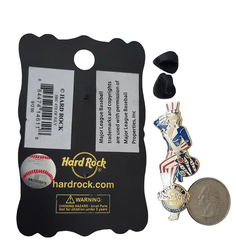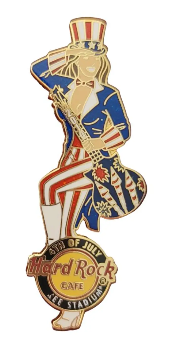 This Hard Rock Cafe 2010 July 4th Yankee Stadium Pin is an error pin where part of the word "YANKEE" is not struck. It features a woman wearing a suit and Uncle Sam's hat that adopt the classic red, blue, and white color scheme. Holding a guitar marked 2010 on the guitar neck with decorative festive-themed fireworks on the body. At the foot is a Hard Rock cafe logo 4TH OF JULY, Yankee Stadium. A proper size that is convenient to wear and take off. It has two posts with a rubber back locking pin that is easy to fix on the back and can be firmly attached to your clothing or accessories throughout the day. This pin comes with a cardboard backing printed with ornate gold and black borders.