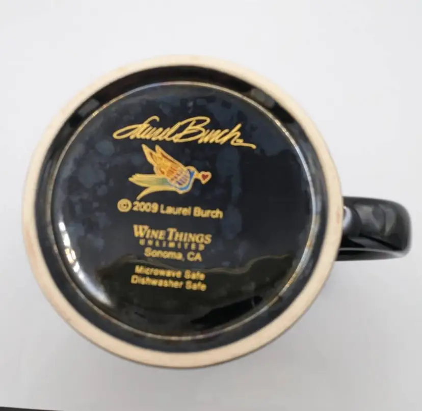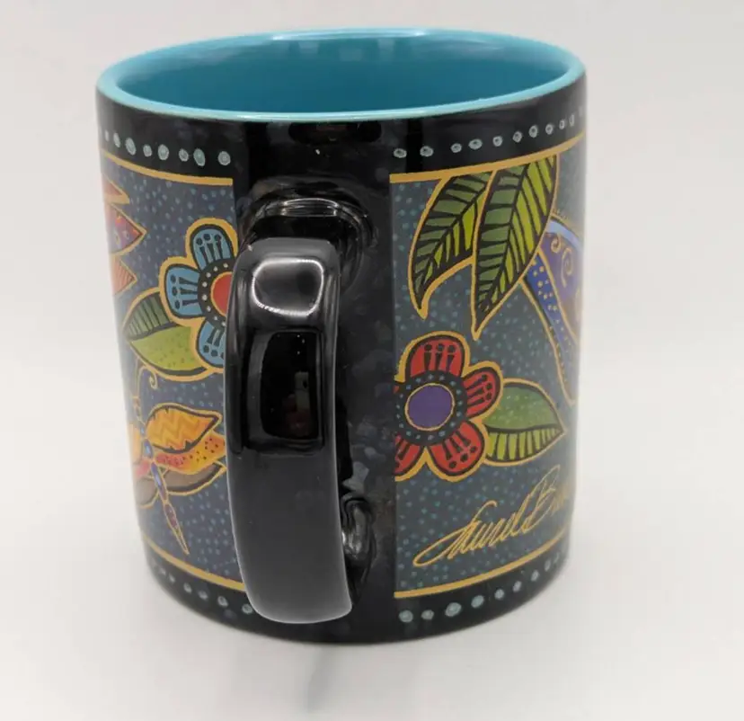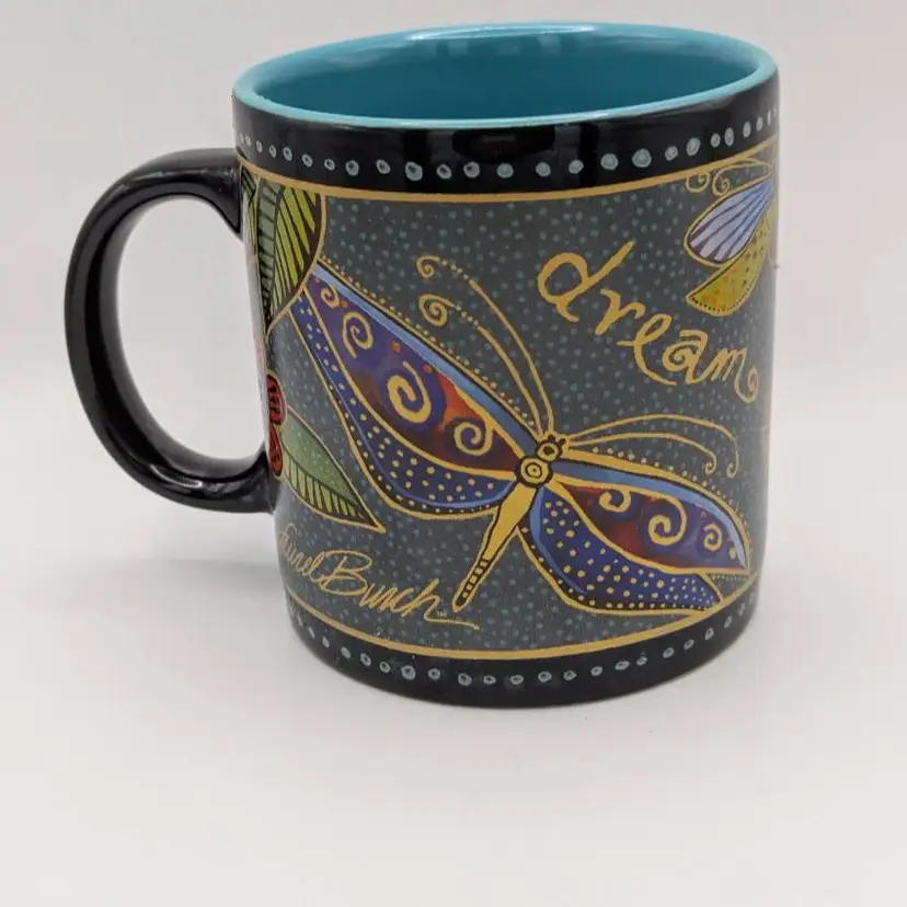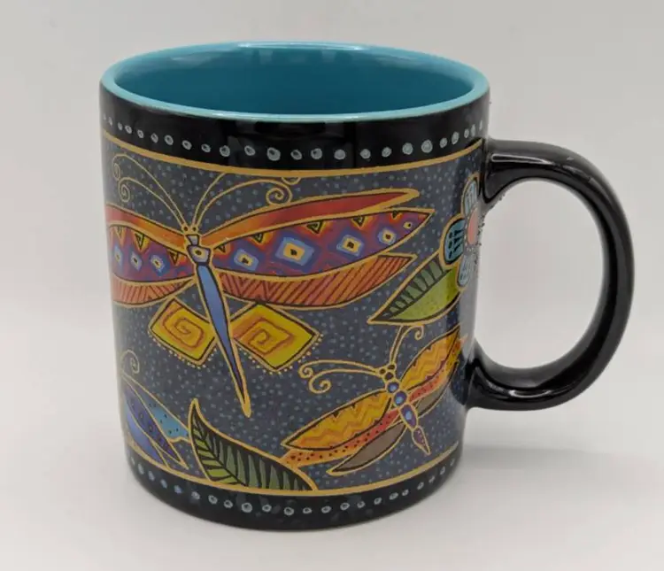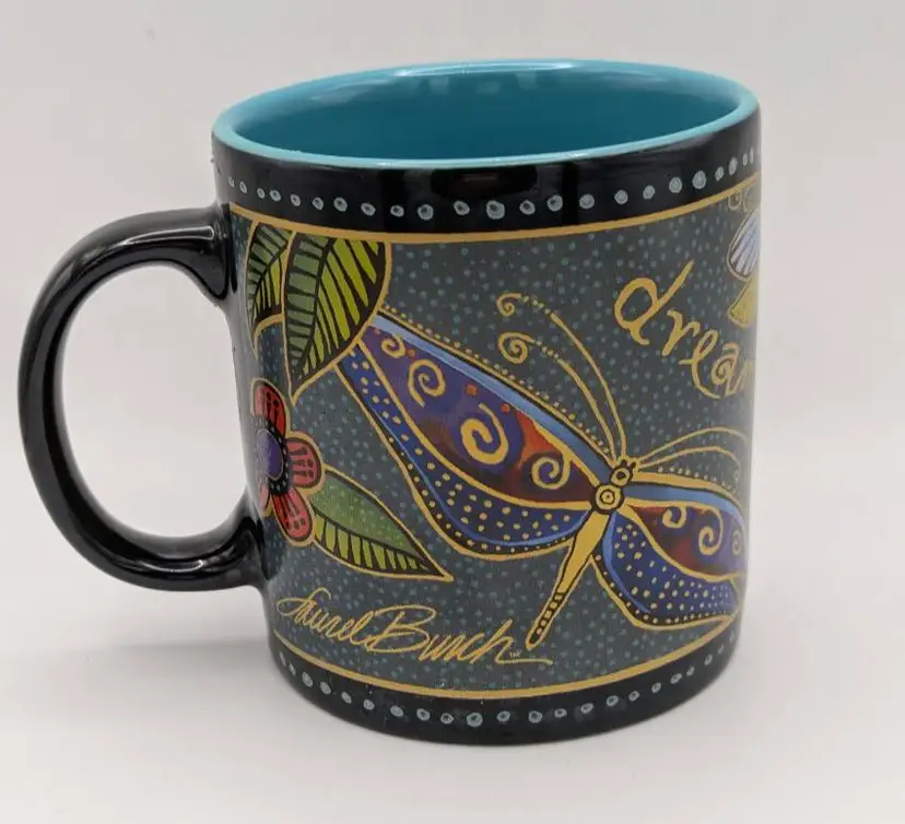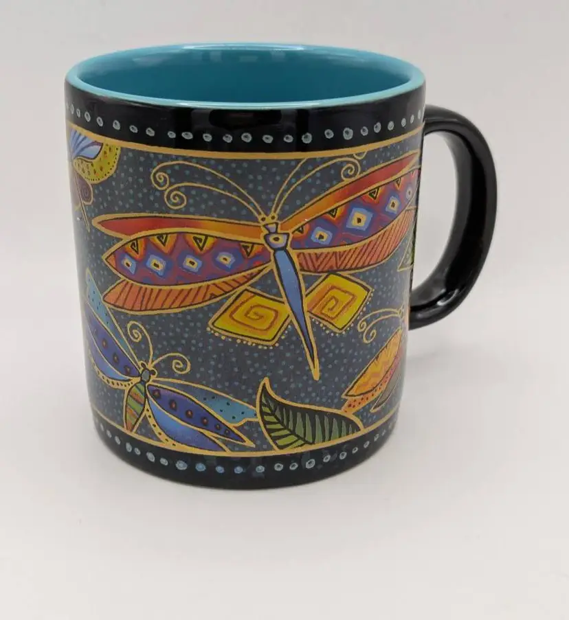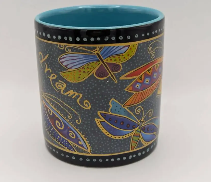 This is a Laurel Burch "Dreams" Mug- Featuring Dragonflies- in beautiful colors. Created in 2009- for Wine Things Unlimited- Sonoma California. Microwave Safe Dishwasher safe- Though- I always washed by hand. Measures: 4 inches tall, mouth diameter 3.5 inches. Holds approx. 14 oz.