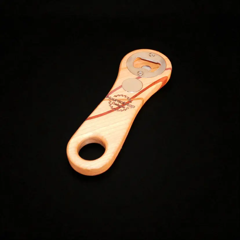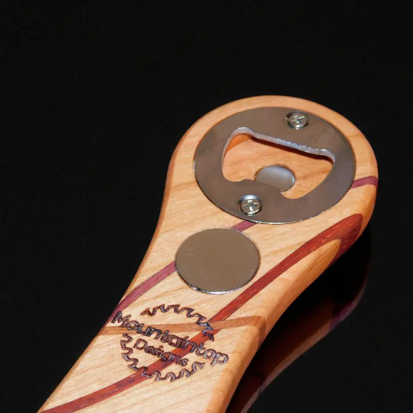These bottle openers are handmade with mostly Cherry woven with various species of wood. There are no stains or dyes! Each bottle opener features a magnet to stick it on the fridge, and a magnet to catch the bottle cap.