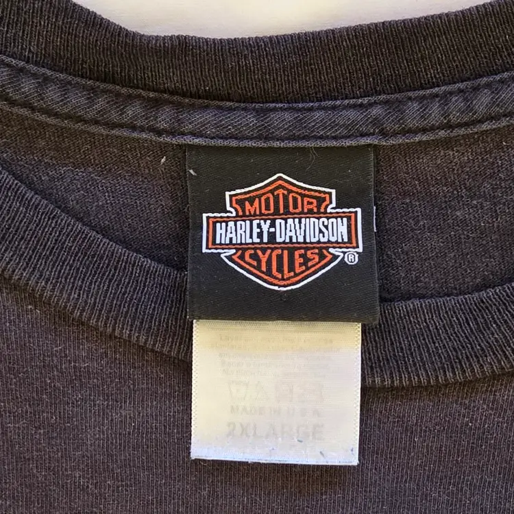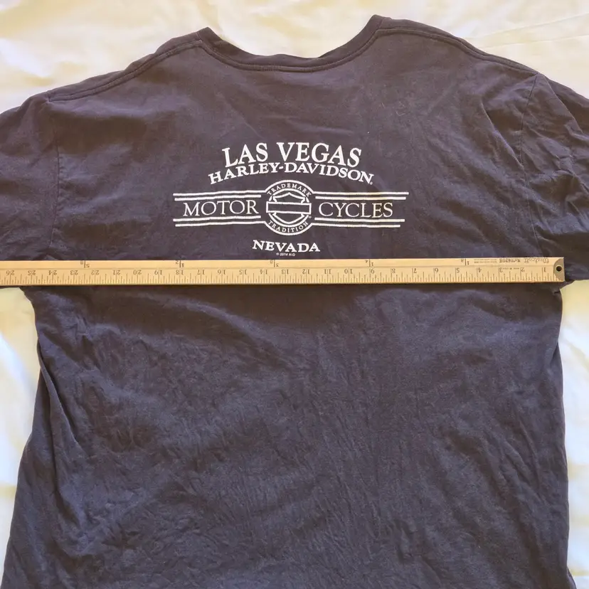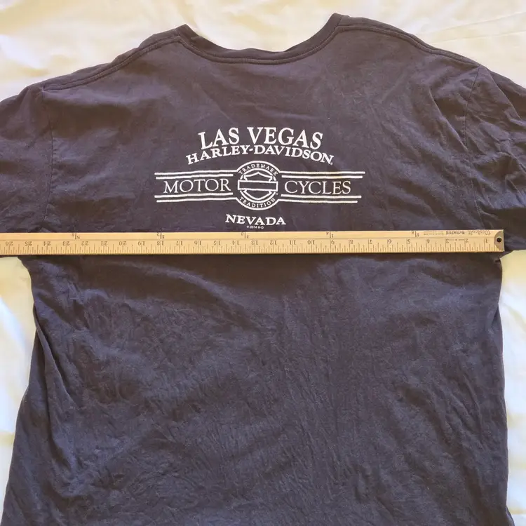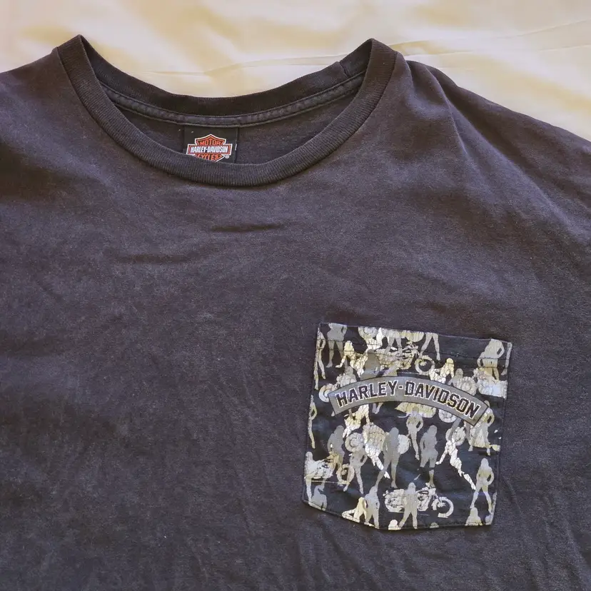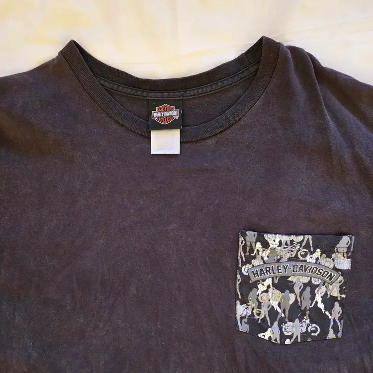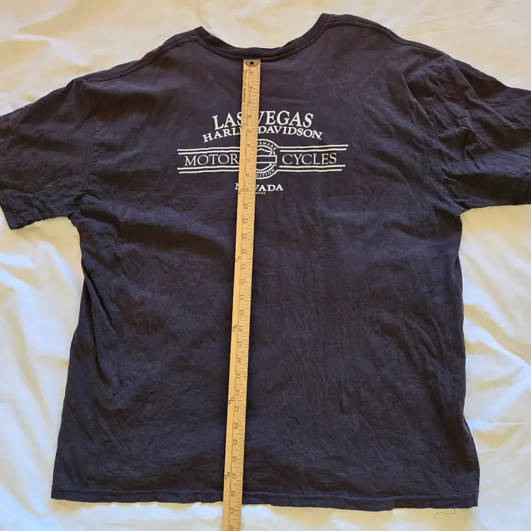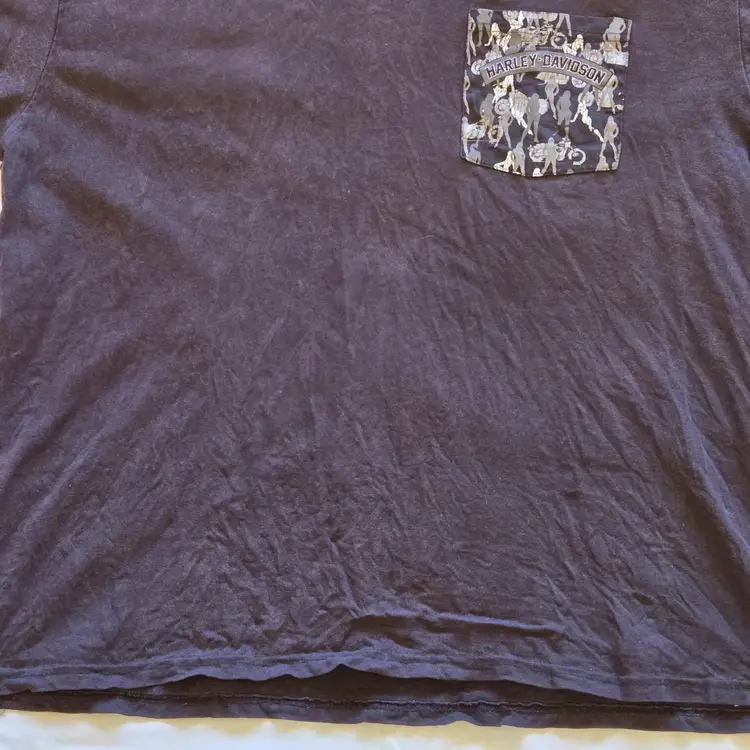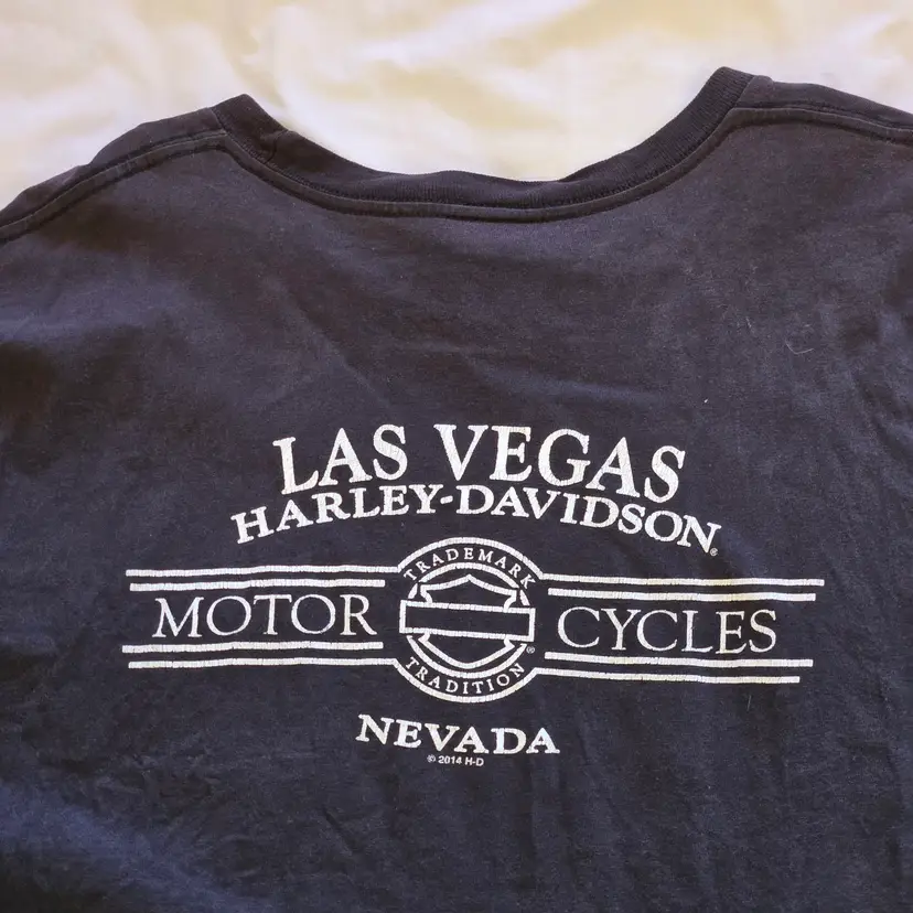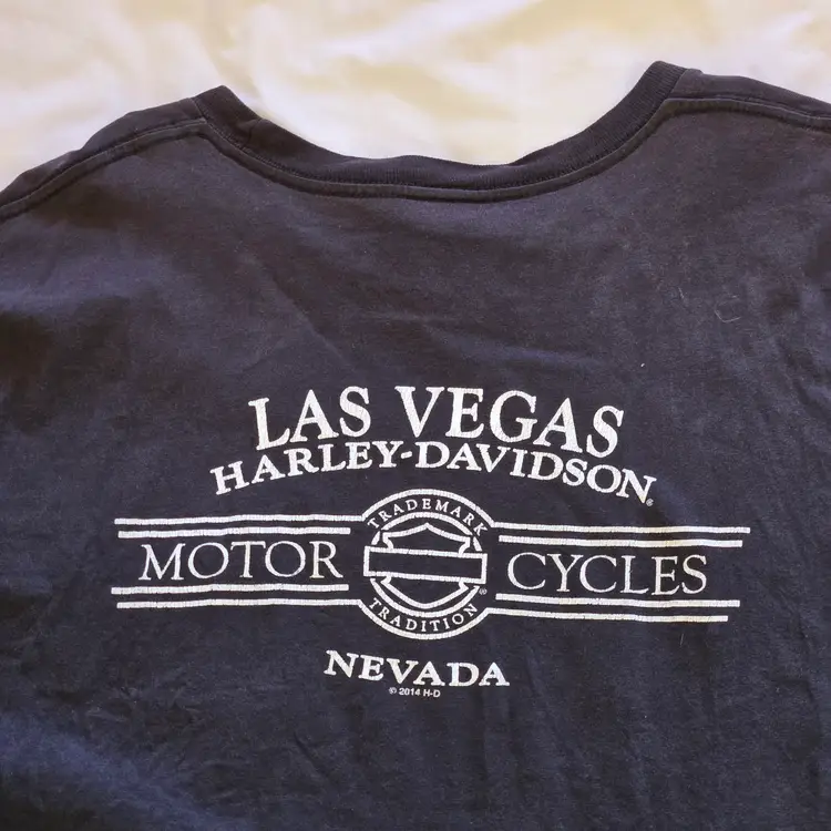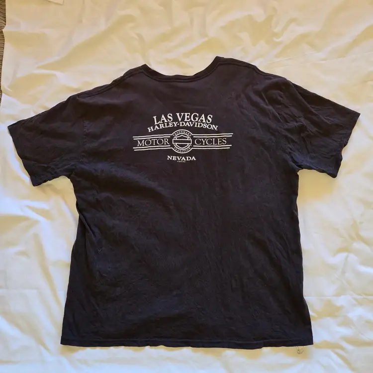 Las Vegas Harley-Davidson T-Shirt Mens Black Women Bikini Logo Pocket Size 2X Large. Used condition with wrinkles, loose threads, sweat stains, fading from use. Please view all the photos and please ask any questions prior to purchase when possible.