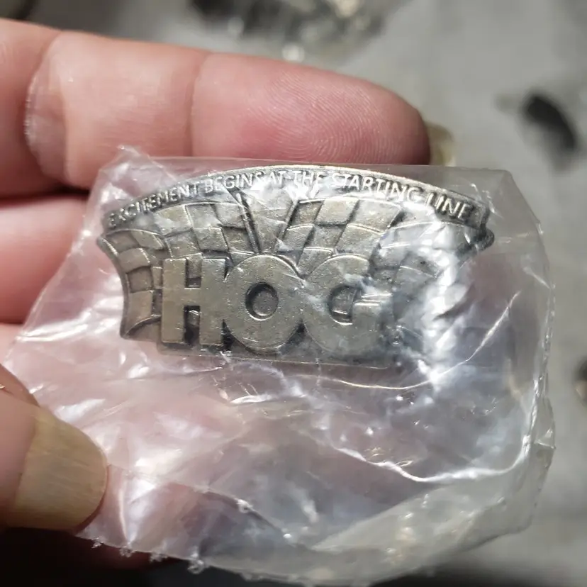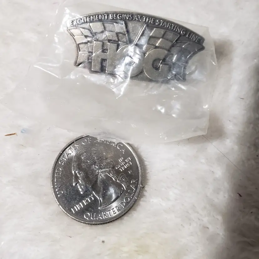 HARLEY OWNERS GROUP HOG " EXCITEMENT BEGINS AT THE STARTING LINE" SILVER PIN