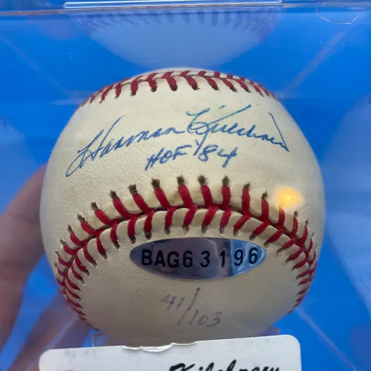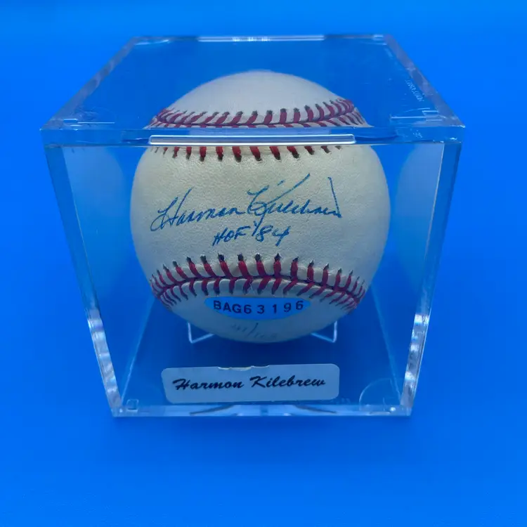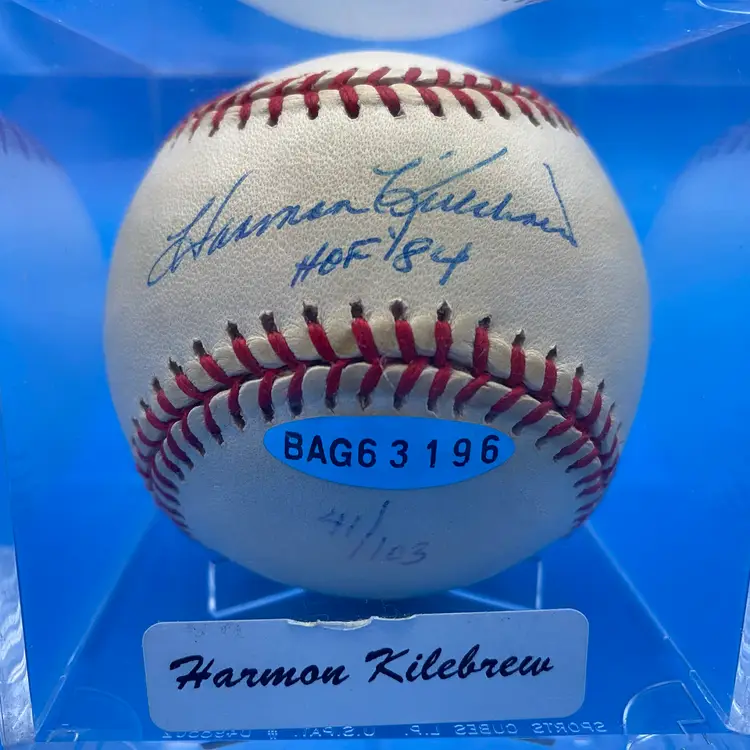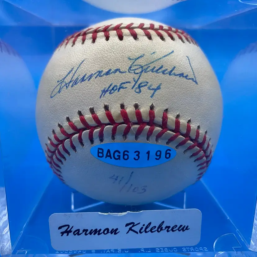 You are purchasing one Harmon Killebrew 'HOF 84' Signed Rawlings Official American League Baseball w/ Hard Plastic Display Case. This Ball has a sticker from an unknown source to me, and is marked 41/103, but no physical certificates. This Ball is in overall great condition. Look through images for a closer look at each angle. No chips or cracks in the case.