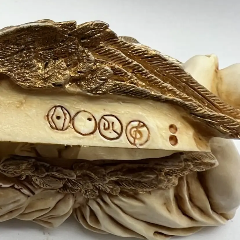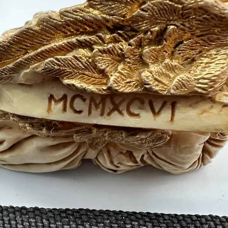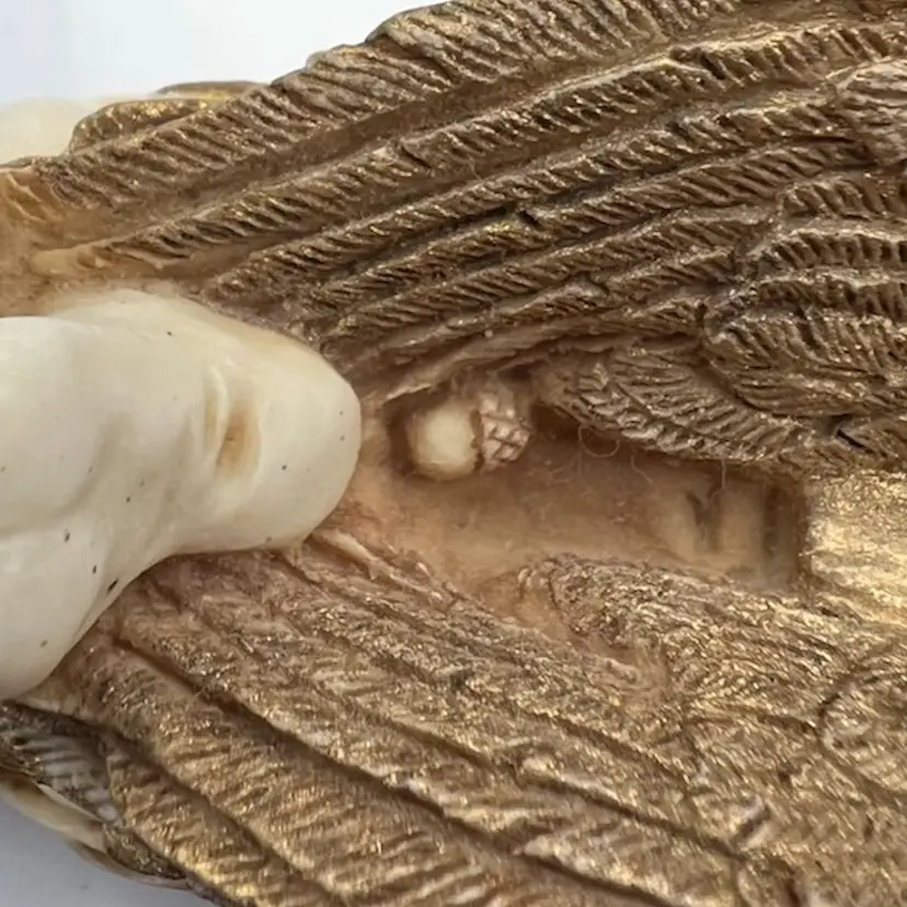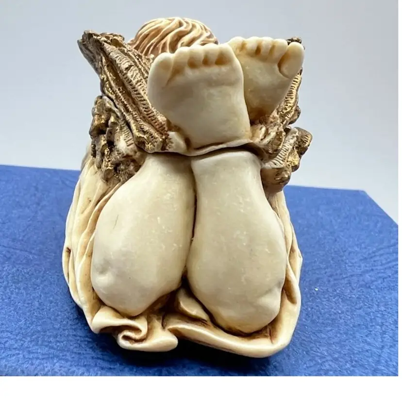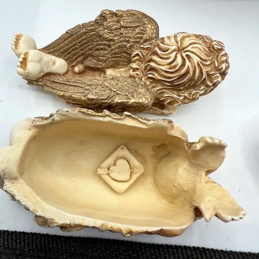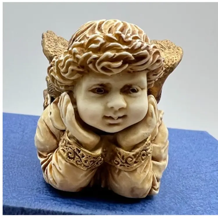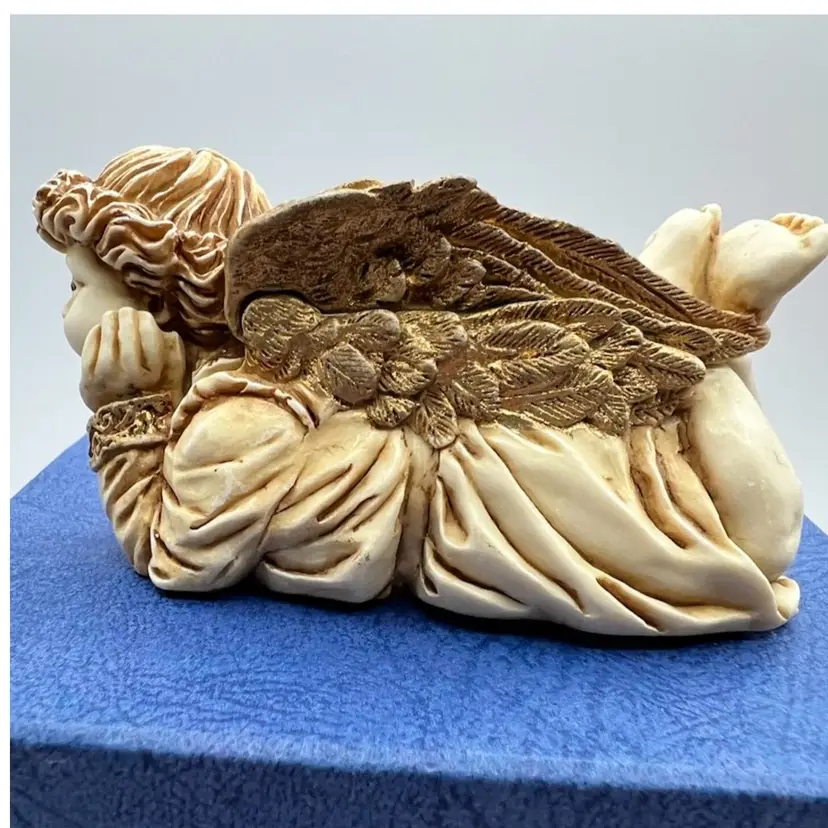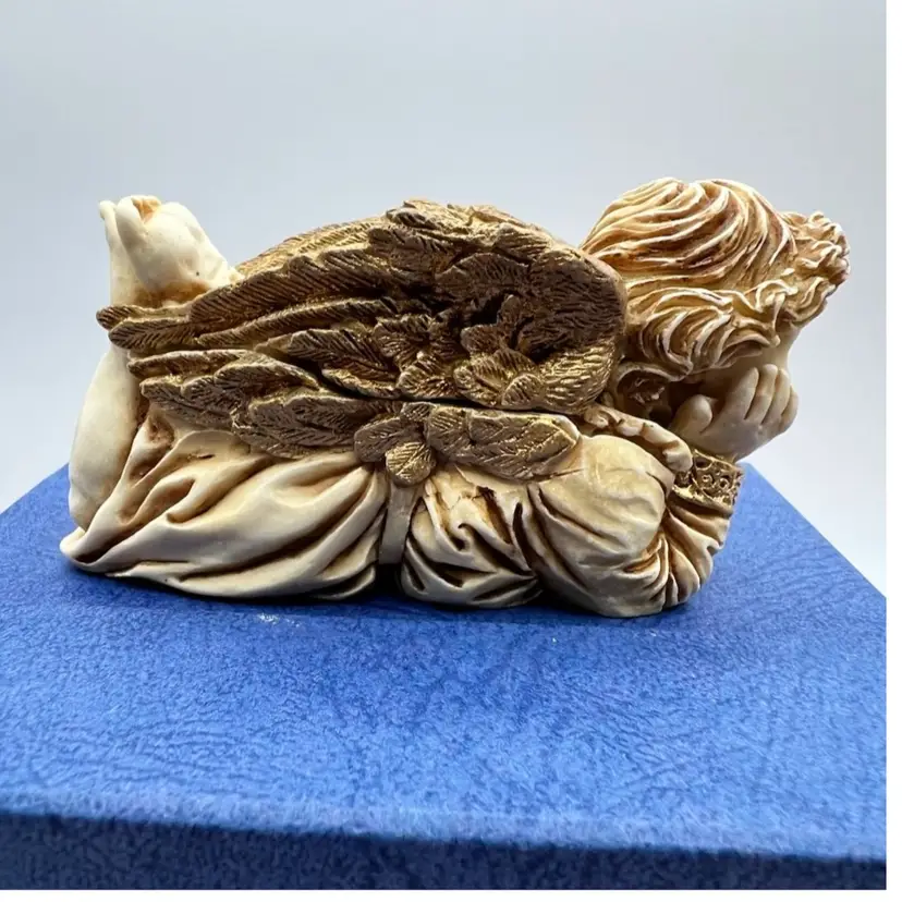 THIS IS HARMONY KINGDOM’S ANGELTIQUE COLLECTION. MADE OF CRUSHED MARBLE AND RESIN THEY ARE VERY UNIQUE. PAINTED BY TOWN FOLKS ALL ARE DIFFERENT. ON SOME OF THESE YOU WILL FIND A HIDDEN ACORN. THIS LITTLE ANGEL HAS GOLD WINGS AND AROUND HER CUFFS. SHE HAS A HEART PILLOW IN HER HIDDEN COMPARTMENT. SHE IS THE 1996 HOLIDAY ANGEL. THERE WERE 3 VERSIONS SHE IS THE THIRD