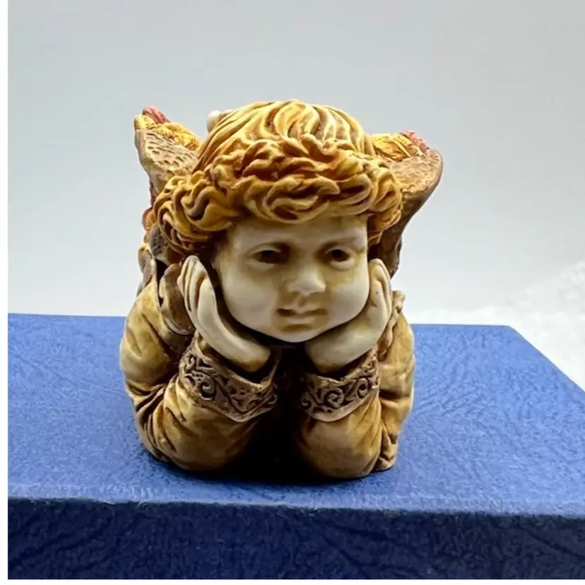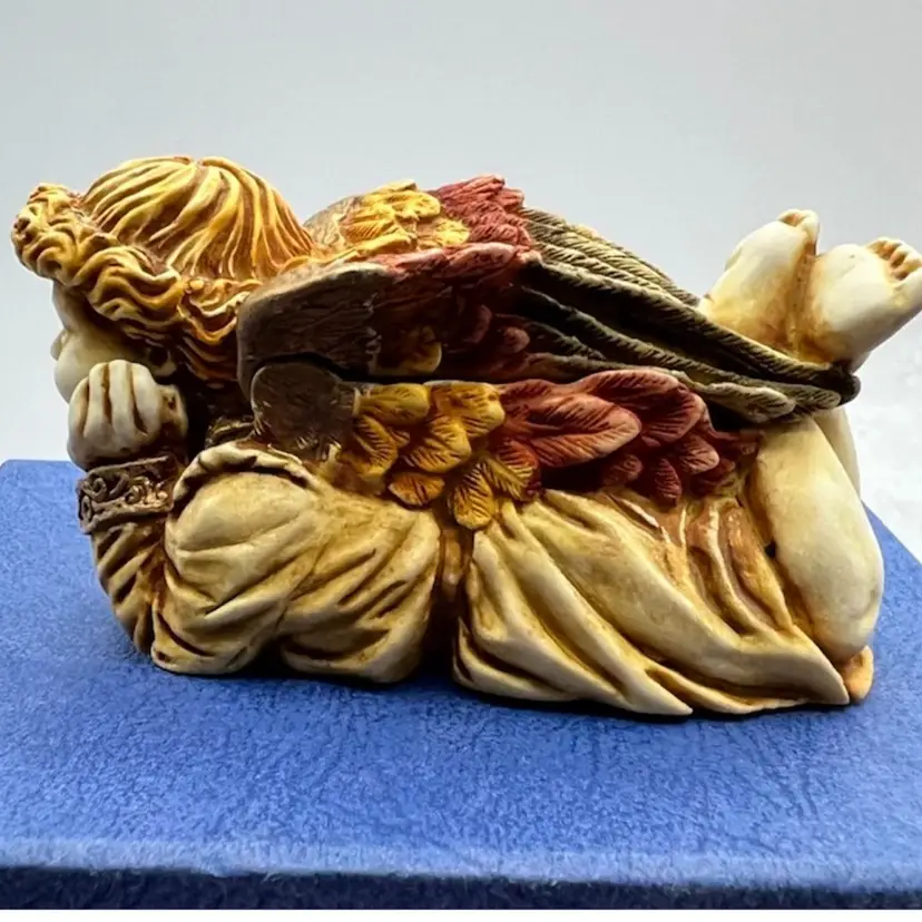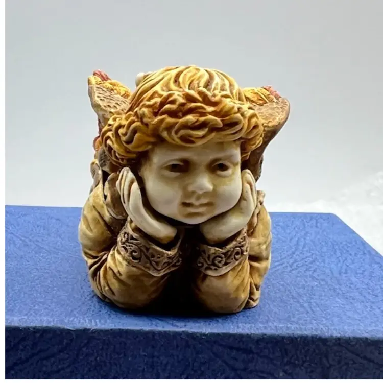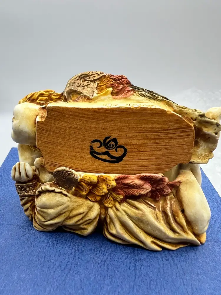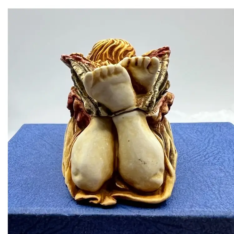 THIS HARMONY KINGDOME “BON ENFANT” HAS COLORED WINGS AND BLOND HAIR. SHE IS THE 2ND VERSION THERE WERE 3. SHE HAS THE ACORN BETWEEN HER FEET HAS TRI COLOR WINGS. HER RELEASE DATE WAS 1996 AND SHE WAS RETIRED 2 YEARS LATER. KNOWN AS A HOLIDAY ANGEL SHE HAS A HEART PILLOW WITH AN ARROW IN HER SECRET COMPARTMENT. MADE OF CRUSHED MARBLE AND RESIN AND PAINTED BY THE TOWN FOLK SO NO TWO ARE ALIKE.