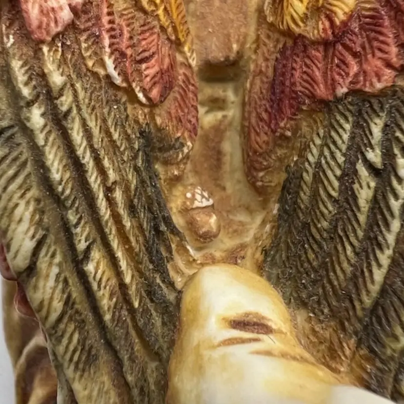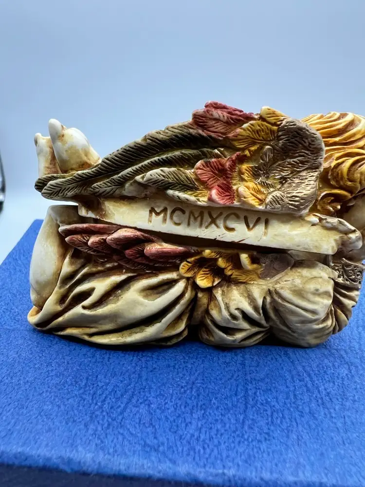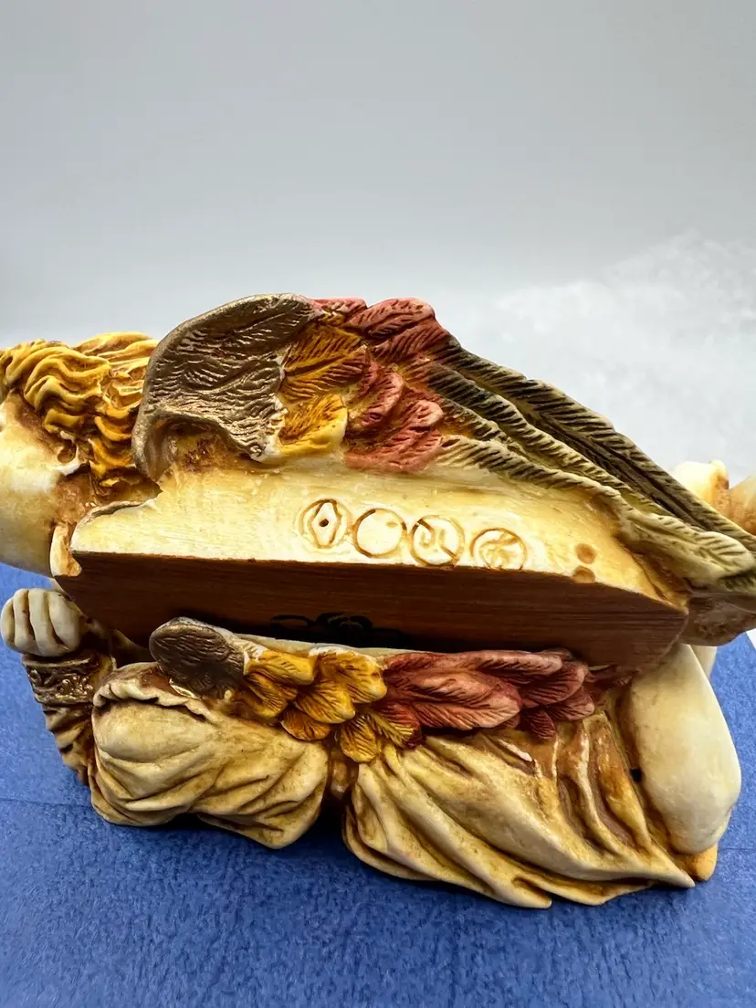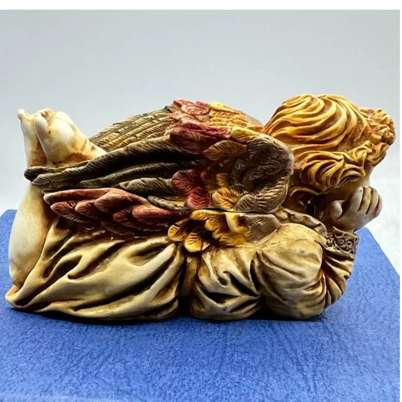 THIS HARMONY KINGDOME “BON ENFANT” HAS COLORED WINGS AND BLOND HAIR. SHE IS THE 2ND VERSION THERE WERE 3. SHE HAS THE ACORN BETWEEN HER FEET HAS TRI COLOR WINGS. HER RELEASE DATE WAS 1996 AND SHE WAS RETIRED 2 YEARS LATER. KNOWN AS A HOLIDAY ANGEL SHE HAS A HEART PILLOW WITH AN ARROW IN HER SECRET COMPARTMENT. MADE OF CRUSHED MARBLE AND RESIN AND PAINTED BY THE TOWN FOLK SO NO TWO ARE ALIKE.