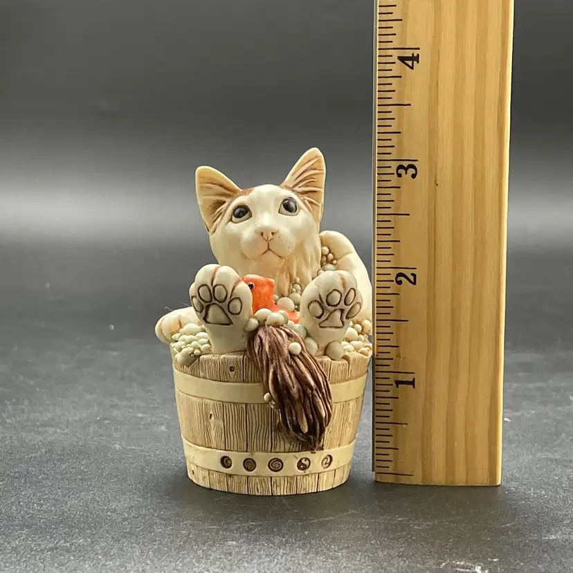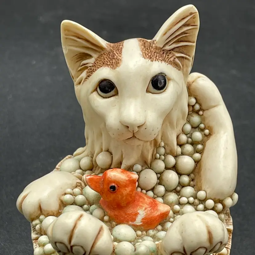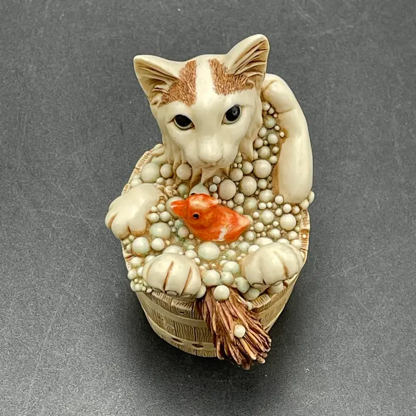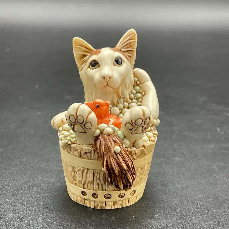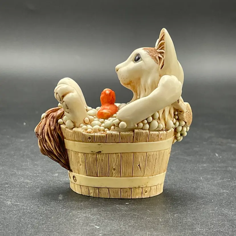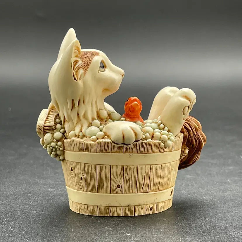 This is a vintage 2003 Harmony Kingdom Turkish Van cat with fish trinket box titled Back Scratch II. There is a swimming cat hiding on the inside. This box is part of the Treasure Jest series. Designed by Peter Calvesbert. Made in England. Measures approximately 3" tall x 3" long. There is a little scuffing on the back of his head as shown in pictures. No box. No chips or cracks.