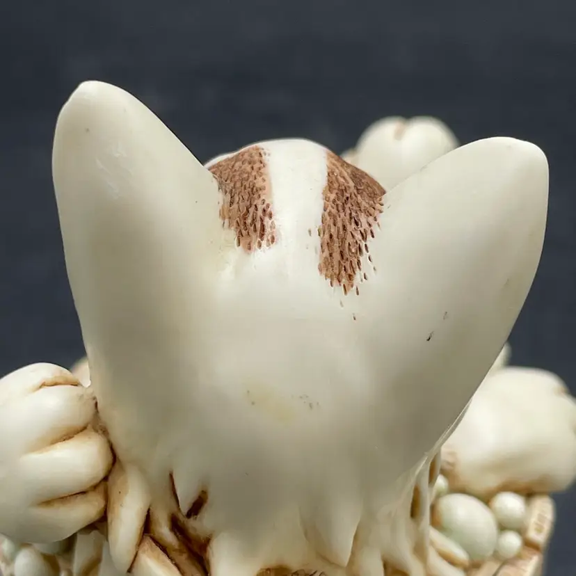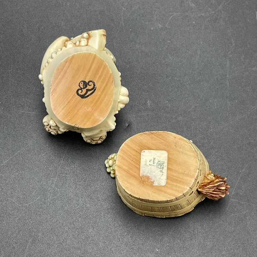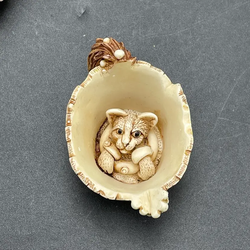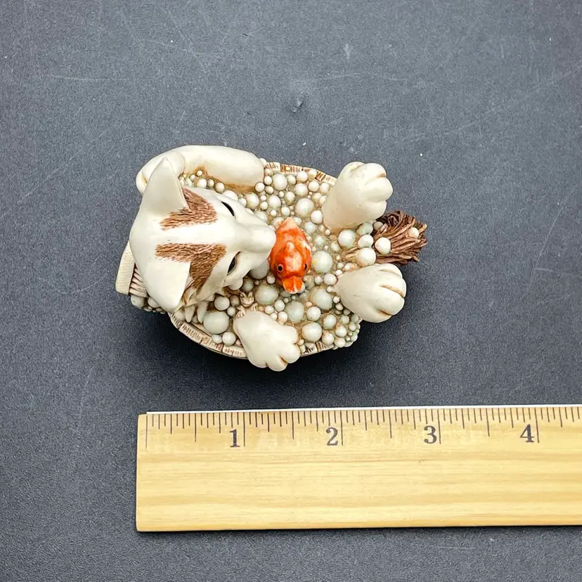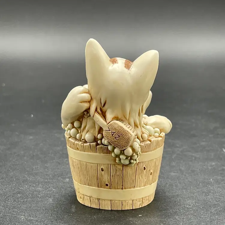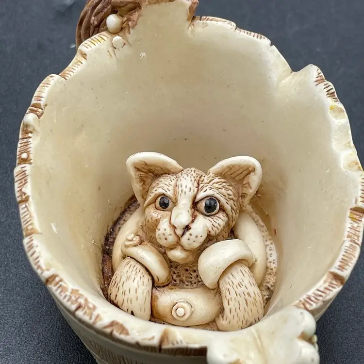 This is a vintage 2003 Harmony Kingdom Turkish Van cat with fish trinket box titled Back Scratch II. There is a swimming cat hiding on the inside. This box is part of the Treasure Jest series. Designed by Peter Calvesbert. Made in England. Measures approximately 3" tall x 3" long. There is a little scuffing on the back of his head as shown in pictures. No box. No chips or cracks.