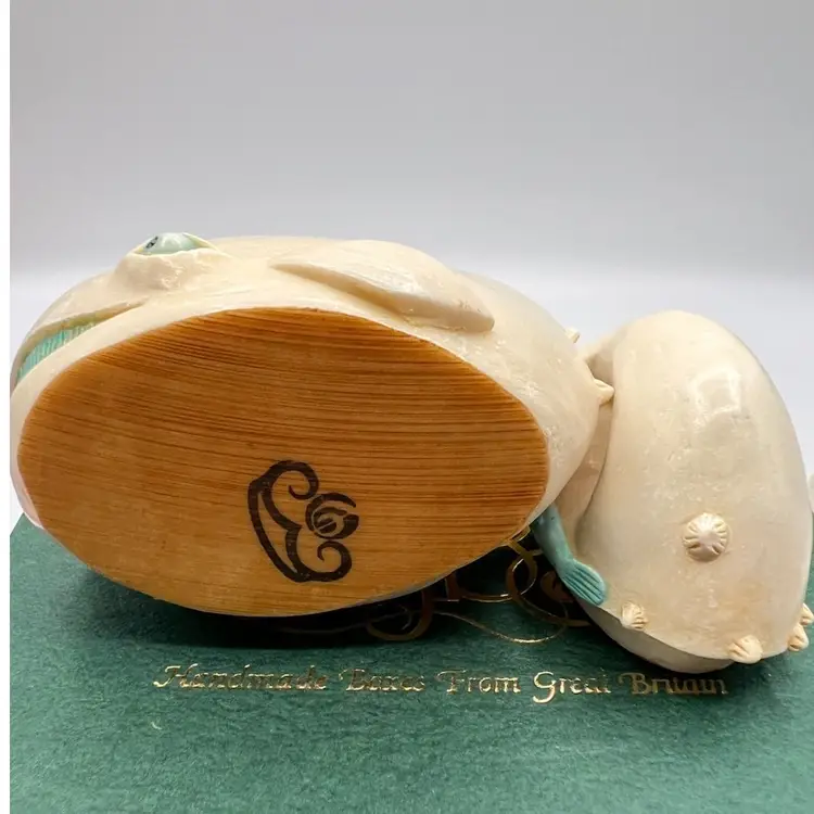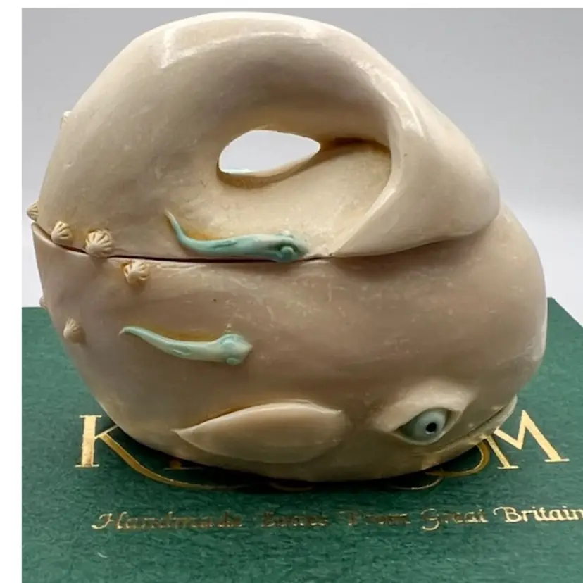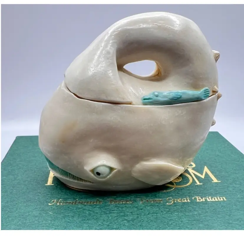 CARVED BY PETER CALVESBERT IN 1993, WAS RELEASED 12/1/1993 AND RETIRED 06/1/1996. THIS WAS THE VERY FIRST PIECE TO HAVE A INNER FIGURINE IN THE COMPARTMENT. IT IS NOAH WITH HIS SHIRT SLEEVES ROLLED UP TAKING A REST. THE FINISH WORK AS WITH ALOT OF THE PIECES WAS DONE BY LOCAL CRAFTSMAN IN COTSWOLDS ENGLAND. IT IS MAGNIFICENT JUST THE LITTLE BIT OF COLOR POPS THE WHALE INTO A DIFFERENT RELM, THE EYES VERY REAL. THIS IS A VERY RARE AND SPECIAL FIRST EDITION