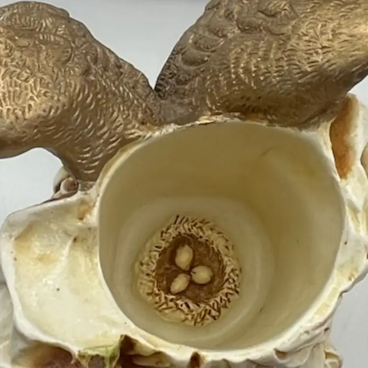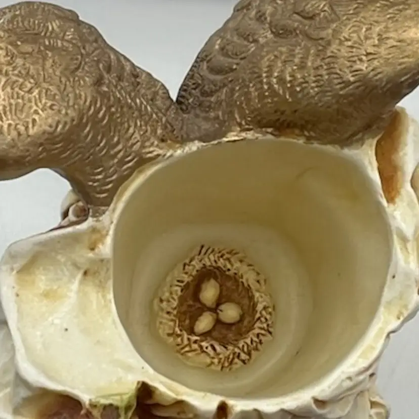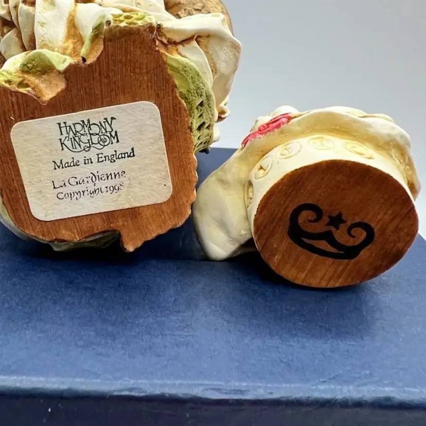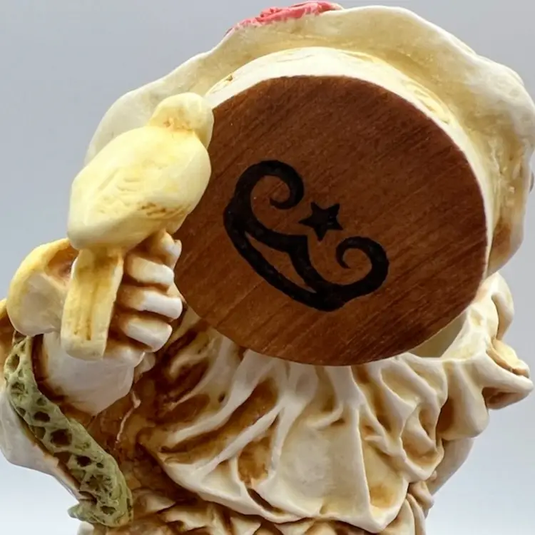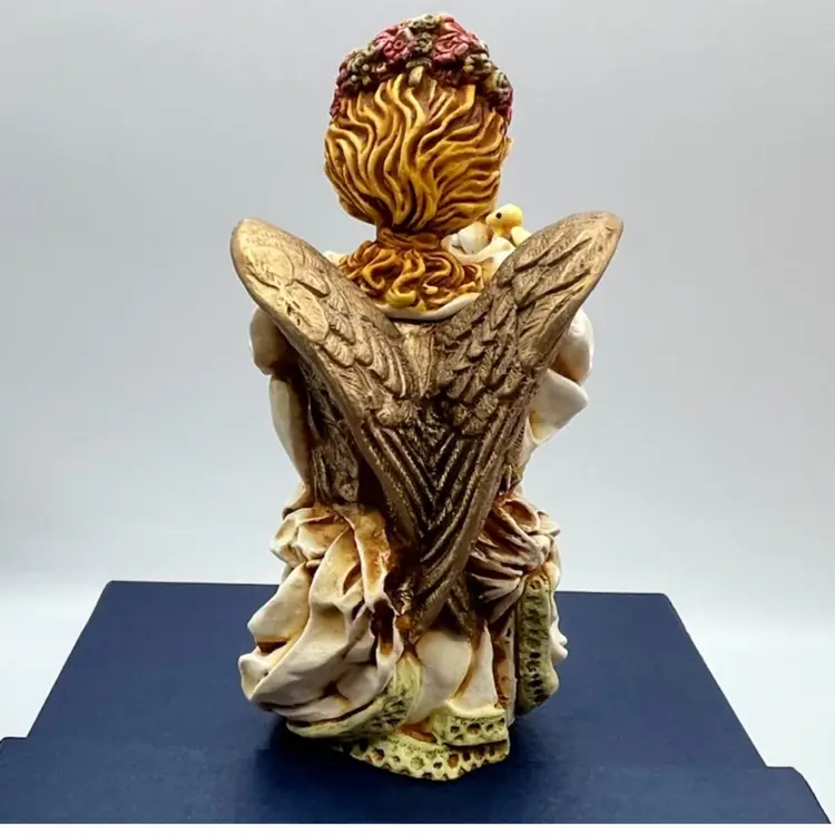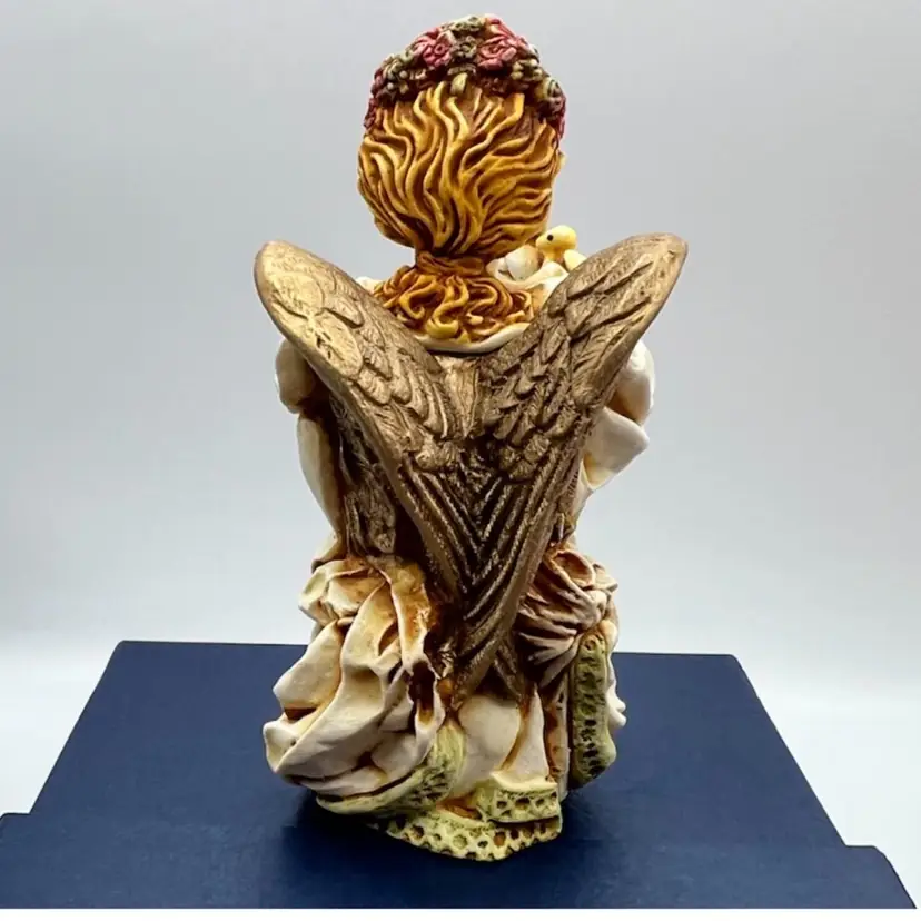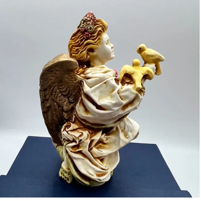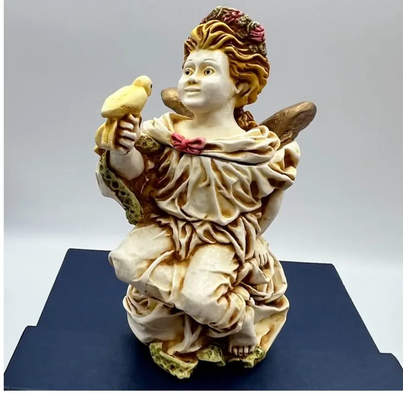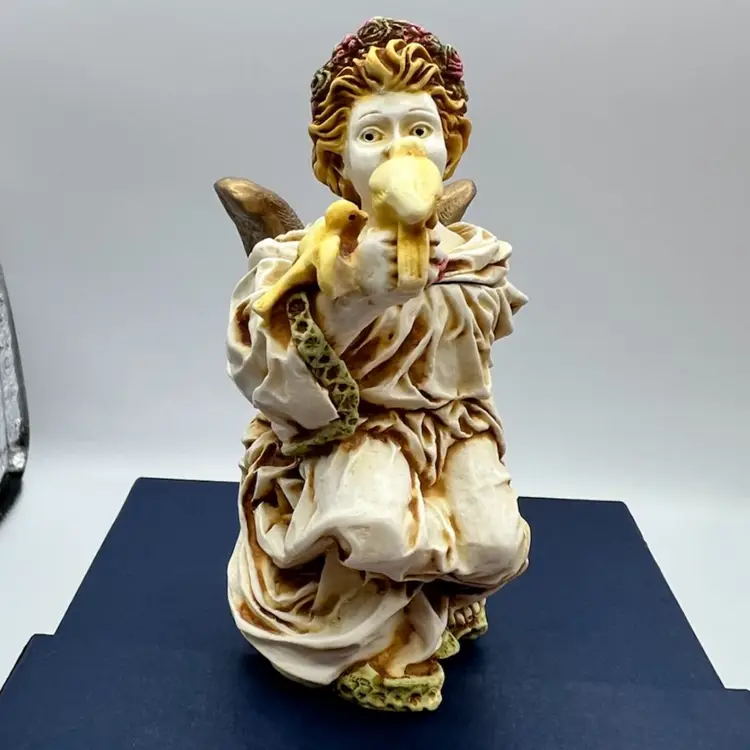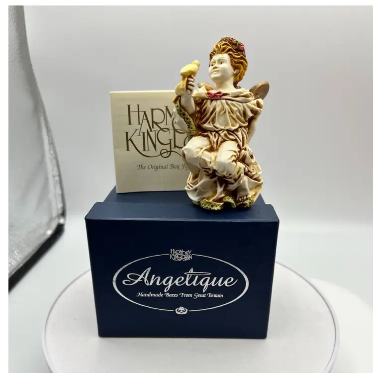 THIS IS A PART OF THE HARMONY KINGDOM ANGELIQUE COLLECTION. LTD FOR 1998. DAVID LAWRENCE IS THE MASTER CARVER IN 1997 IT WAS RELEASED IN 1998 AND THEN RETIRED A FEW YEARS LATER. SHE IS HOLDING HER BEAUTIFUL YELLOW BIRDS AND THEY ARE FANTASTIC, WHILE INSIDE HERE COMPARTMENT IS A TINY NEST WITH EGGS.