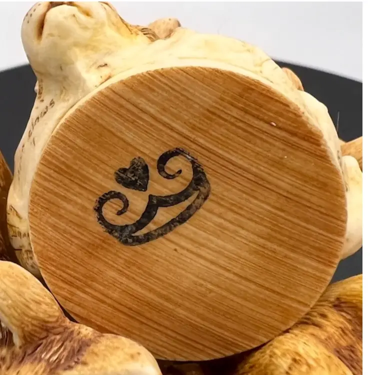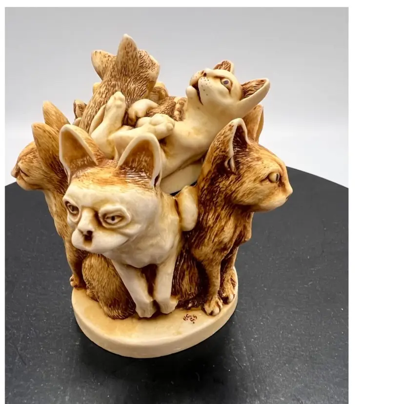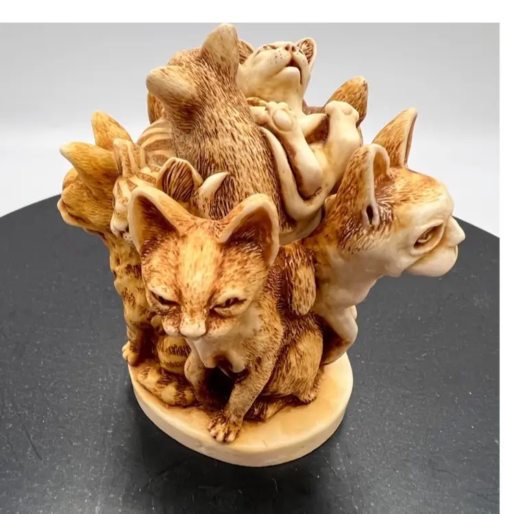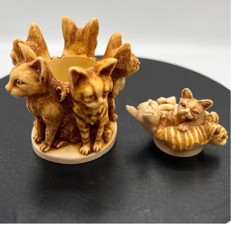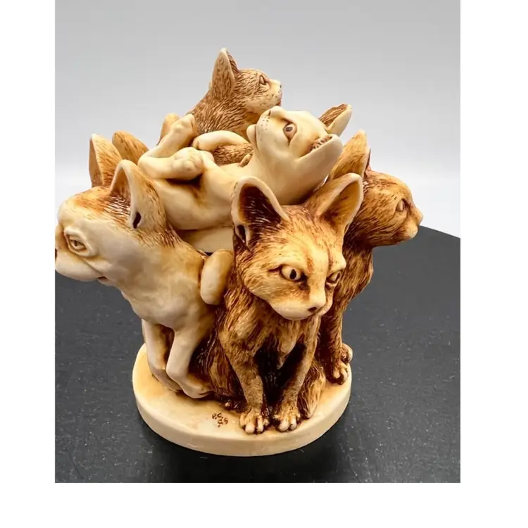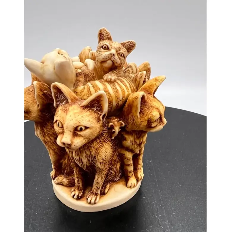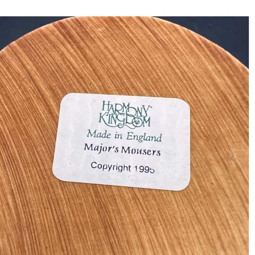 HARMONY KINGDOM “MAJOR MOUSERS” MARTIN PERRY STUDIO’S IN ENGLAND DATED 1995. CARVER WAS PETER CALVESBERT IT IS PART OF THE TREASURE JEST COLLECTION. CARVED 1995, RELEASED 5/1/1995, RETIRED 6/1/1997. THESE 5 SR CITIZEN CATS WERE ORIGINALLY CONCEIVED AS A HARMONY BALL CHIMING SPHERE WITH KITTY LID. SPOT LIKENESS OF PRIME MINISTER JOHN MAJOR. EVEN THE MOUSE BETWEEN THE HEADS OF 2 CATS LLOOKS AS IT HE SHOULD MOVE INTO THE HOUSE OF THE LORDS. EARLY MOLD MAY HAVE DROP CLAWS 4 UNDER THE STRIPED KITTEN THIS IS A REFERENCE TO A LEGAL CLAUSE WAS OPPOSED BY THE LABOUR PARTY. THE RETIREMENT WAS ANNOUNCED ON MONTH PRIOR TO JOHN MAJOR’S RETIREMENT. THE INTERIOR IS EMPTY EXCEPT FOR THE LOGO HBC.