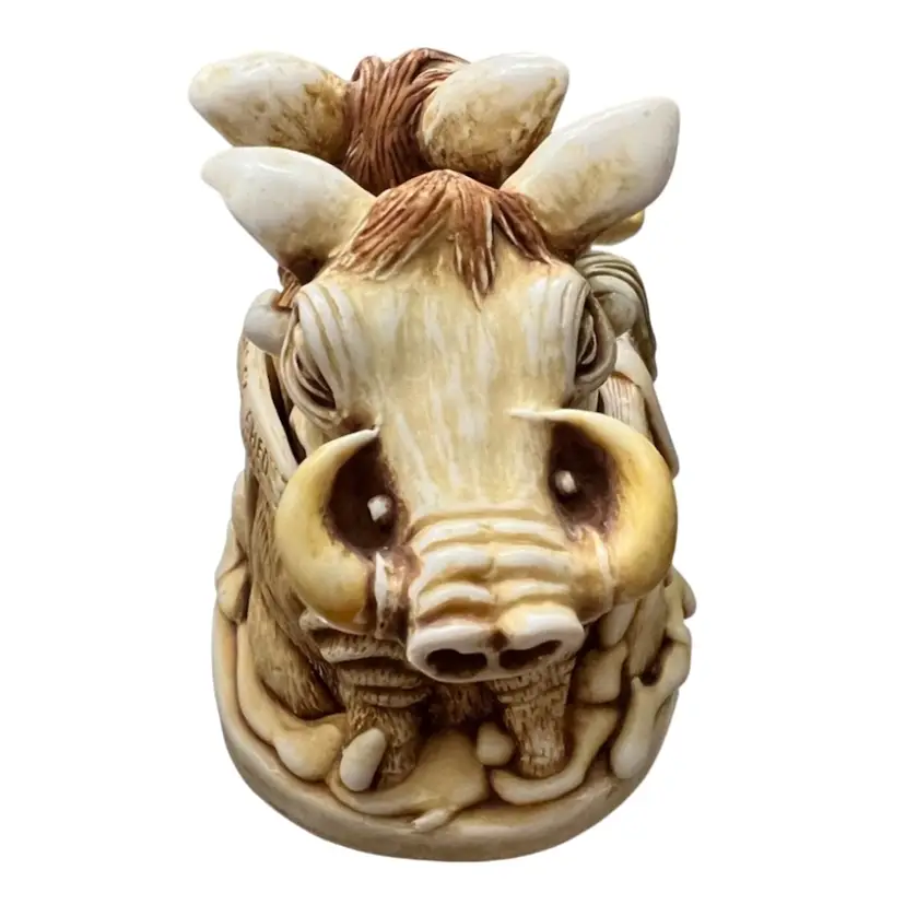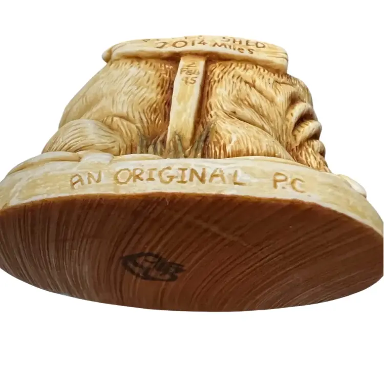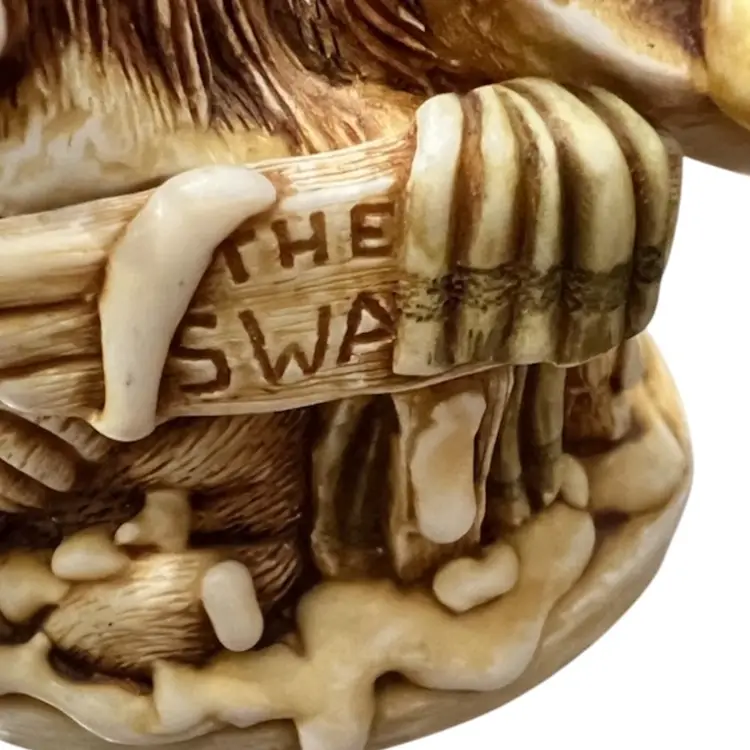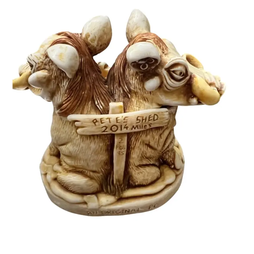 THIS WAS CARVED BY PETER CALVESBERT IN 1995 AND RELEASED IT 4/1/1995 AND RETIRED 6/1/1997. THESE GENTLE GENTS ARE AT THE FAVORITE HANGOUT THE SWAMP TAKING A MUD BATH. ANOTHER CLUE THIS IS A ORIGINAL IS THE “AN ORIGINAL PC” ON THE BASE OF THE BOX, THE MOUSE IS IN THE EAR OF ONE OF THE BOARS. THE SIGN PETE’S SHE2014 IS THE DISTANCE BETWEEN PETER’S SHED AND THE HK CORPORAT HEADQUARTERS IN COLUMBUS OH AND THE DATE BELOW 2 FEB 95 WHICH WAS THE COMPLETION DATE INTERIOR HALLMARKS INCLUDE C AND THE HBC LOGO. IN EXCELLENT CONDITION AND HAS BOX
