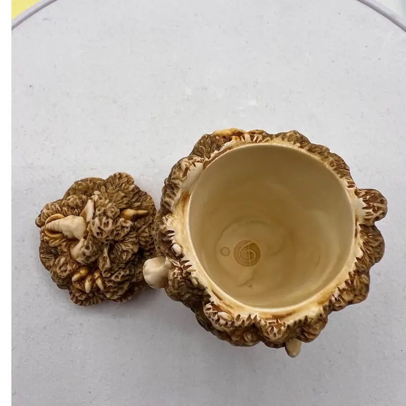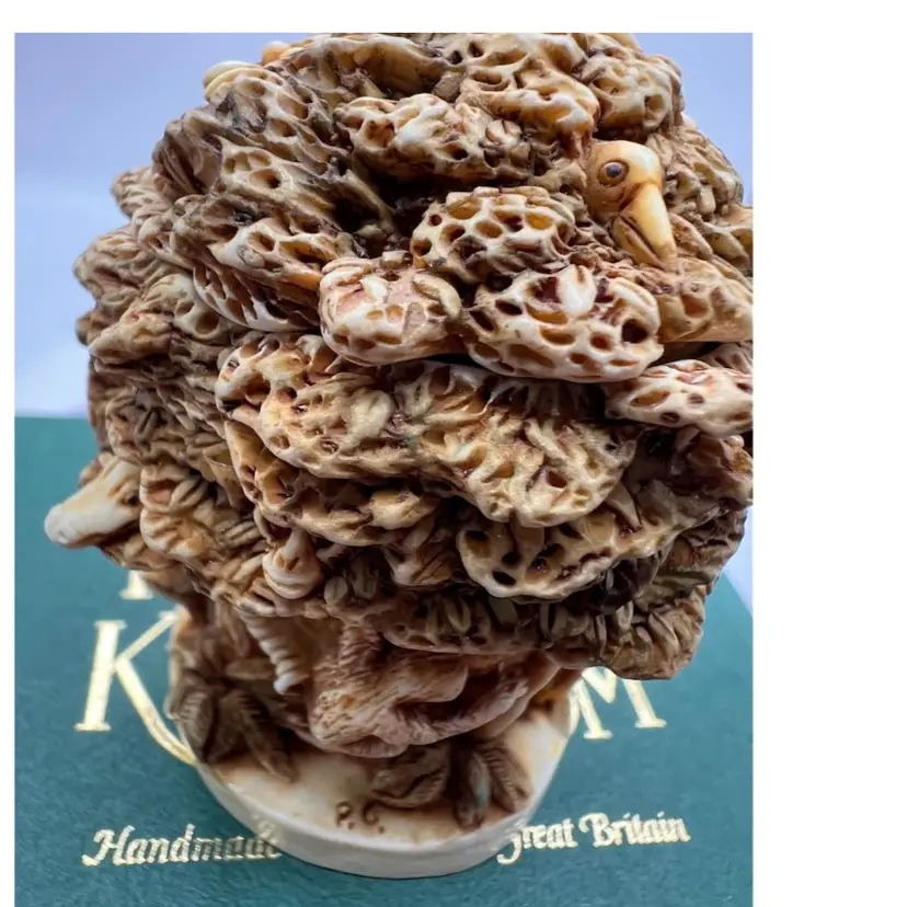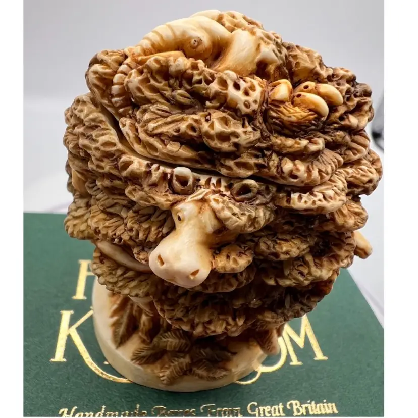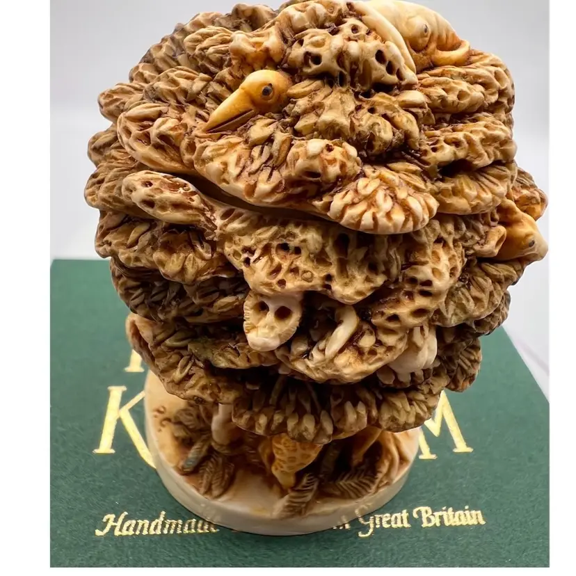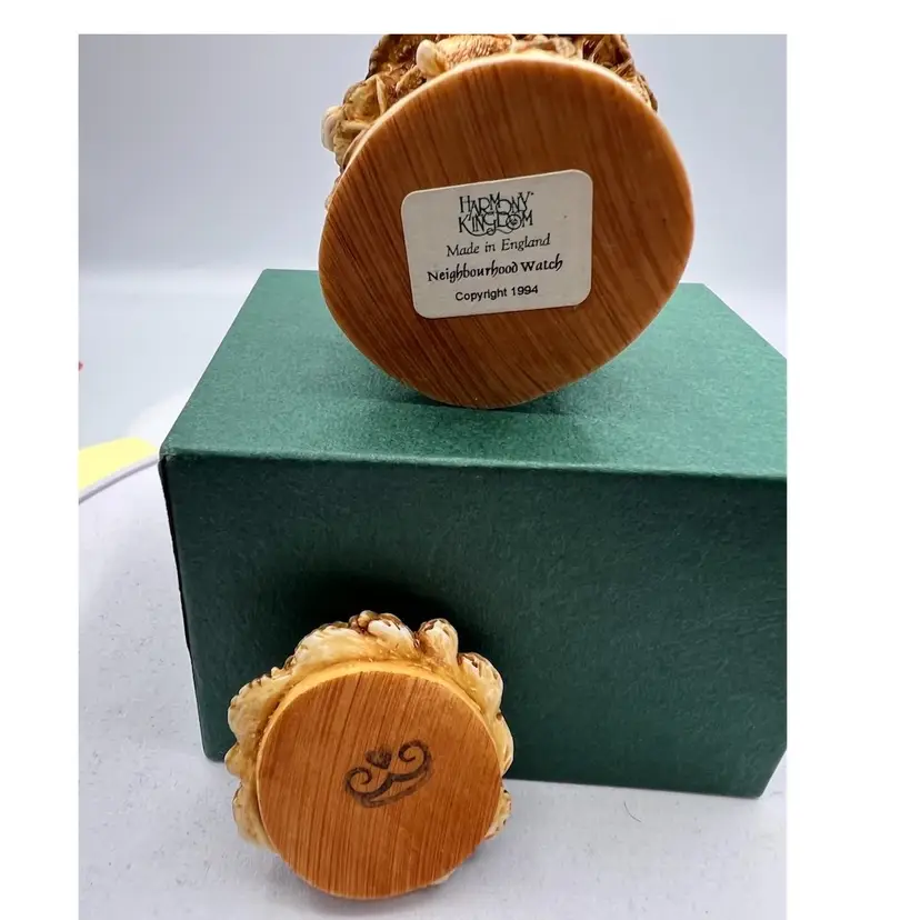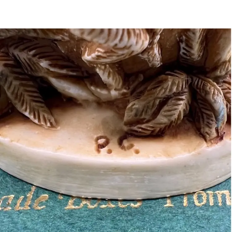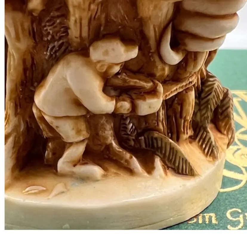 THIS IS A VERY RARE LISTING AND IS HARD TO FIND. RETIRED SMALL CRUSHED MARBLE FIGURE REPRESENTING THE RAINFOREST DESTRUCTION. A MAN TRYING TO CUT DOWN THE FOREST WITH A SAW WITH ALL THE ANIMALS WATCHING OUT OF THE TREES. IT ENCAPSULATES PETER’S CONCERNS FOR JUNGLE HABITAT. NEAR THE GIRAFFE PETER DISPLAYS WHAT HE THINKS OF THOSE WHO DESTROY THE FORESTS. COLOURATION ON THIS PIECE EAS VERY LIGHT UNTIL LATE 1995 WHEN MORE COLOUR WAS ADDED. THE MOUSE IS NOT PRESENT IN THIS PIECE AND THERE ARE NO INNER CARVINGS. THE ONLY MARKING IS A PC ON THE BASE. THESE EARLIER VERSIONS HAD EMPTY INTERIORS WHILE LATER PIECES INCLUDED A MINI “UNBEARABLES” FIGURE INSIDE. THIS SCULPTURE IS SO PERFET AND SO INTENSE IT IS BEAUTIFUL