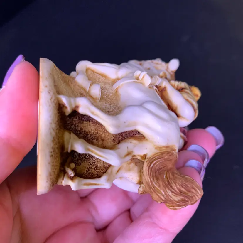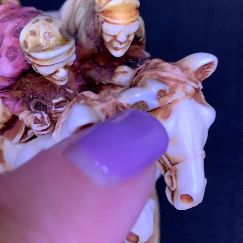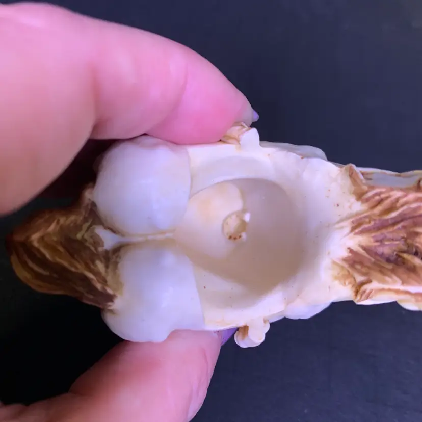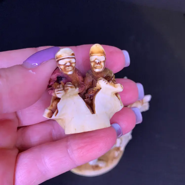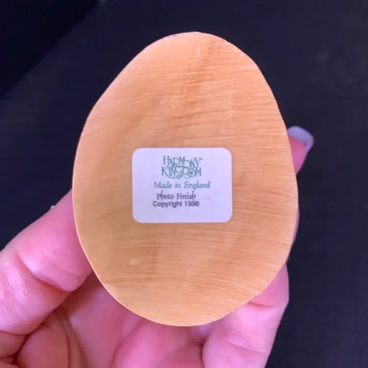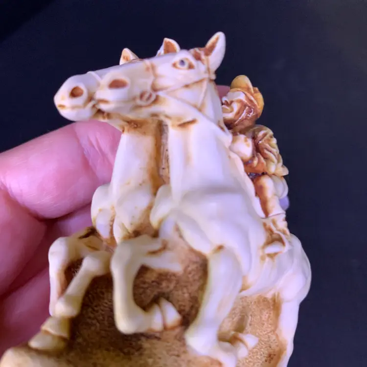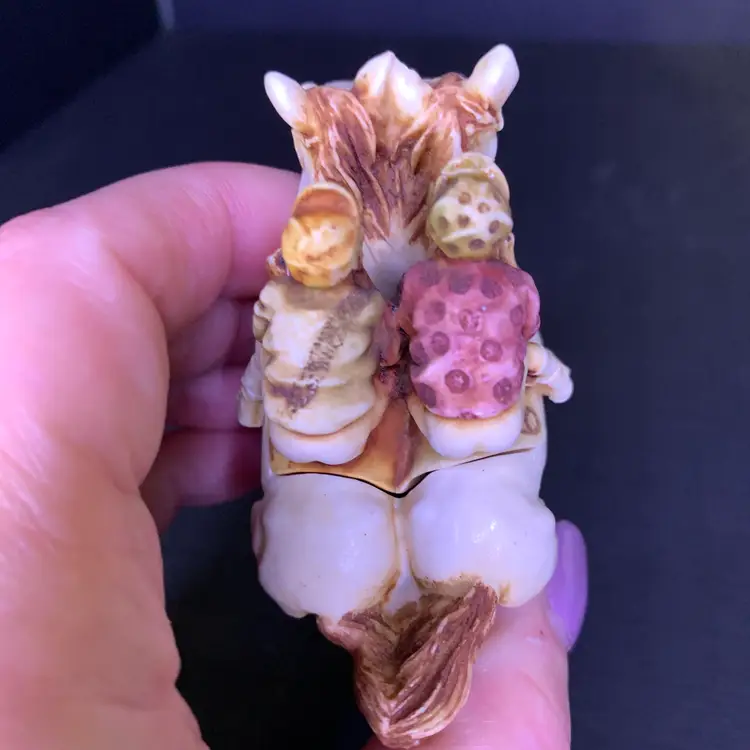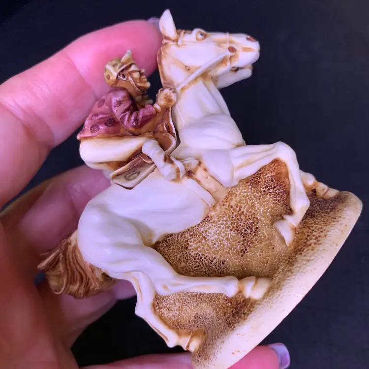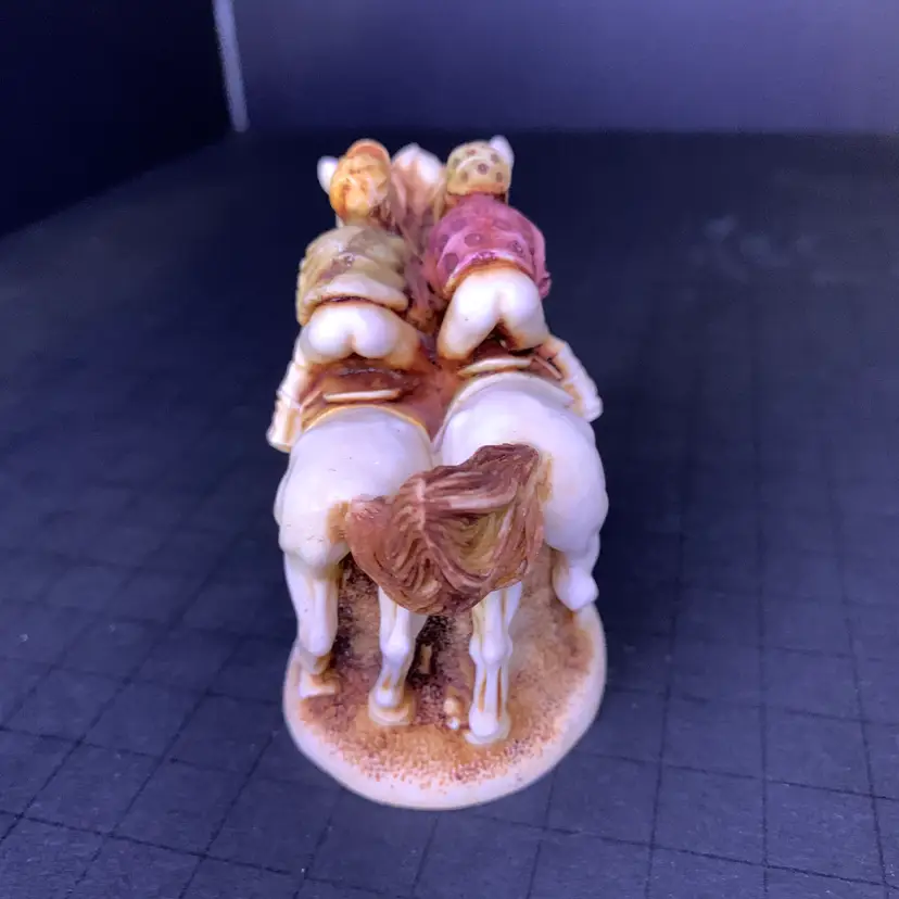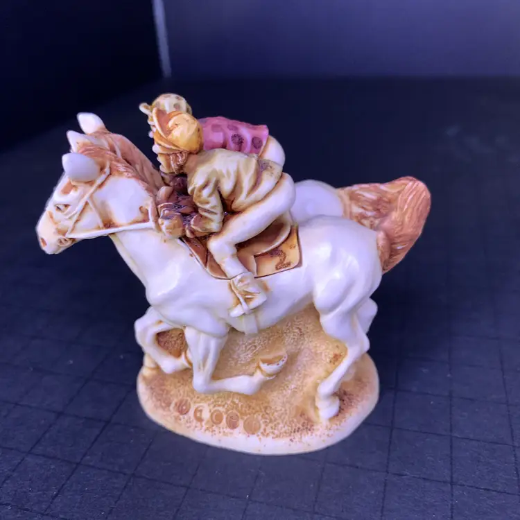 This is in good condition. There is a repair to one of the jockey's caps and a chip on the horse's ear. No other chips or cracks. Measures 3 1/4 inches across, 1 7/8 inches wide and 2 3/4 inches tall. Weighs 4 ounces. If the actual postage ends up being less than what you paid, you will be refunded for anything over one dollar.