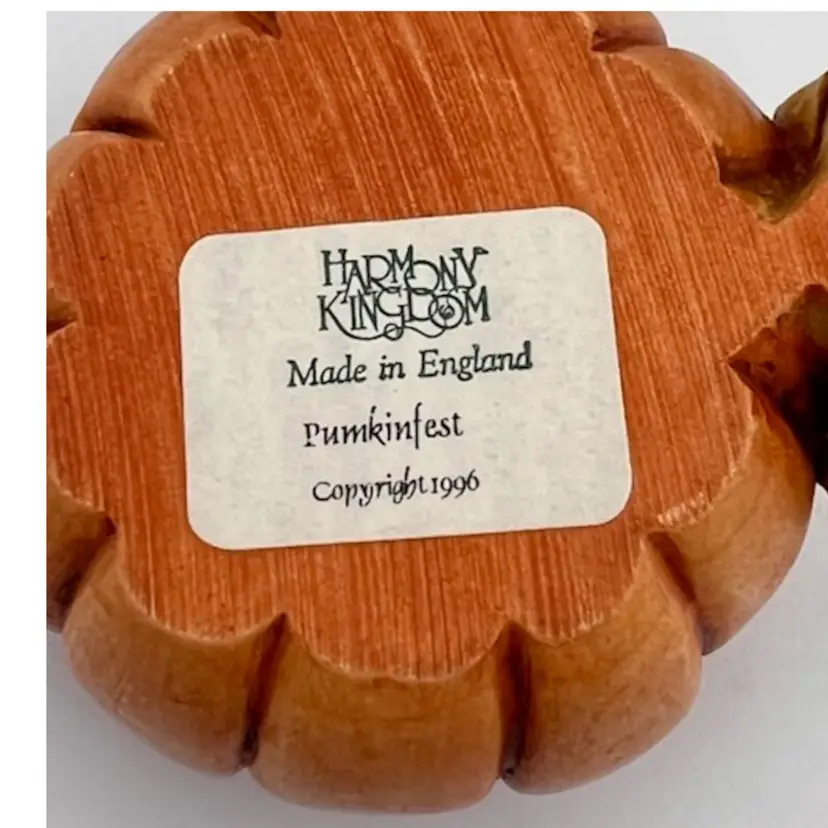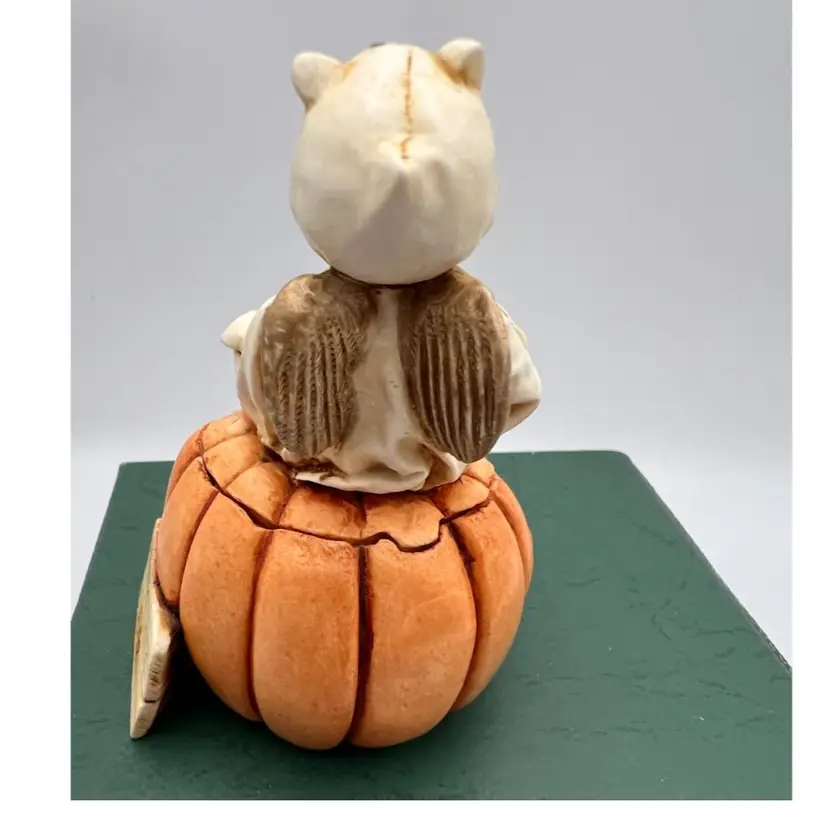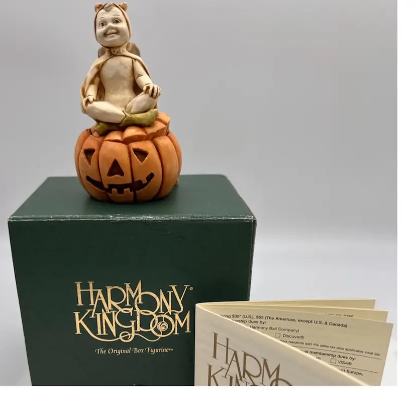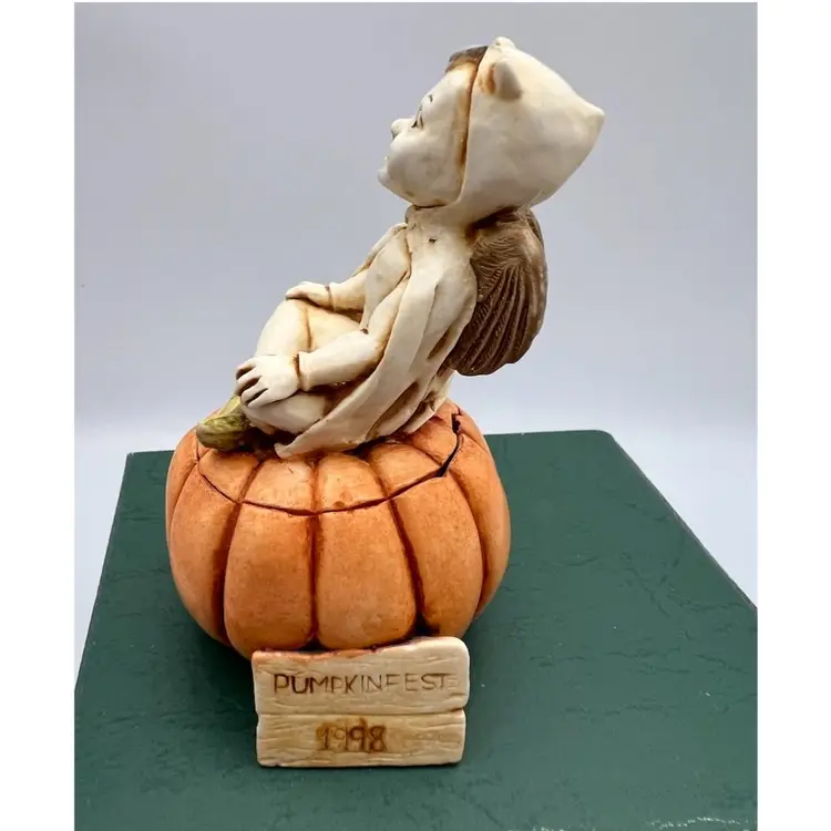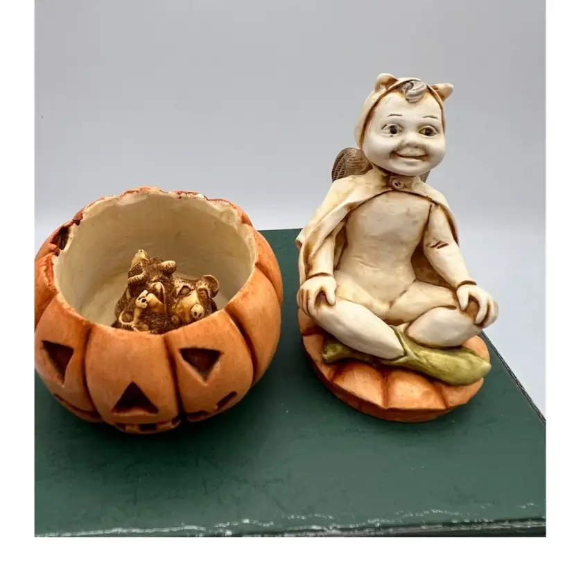 HARMONY KINGDOM “PUMPKIN FEST” DATED 1996 CARVED BY DAVID LAWERENCE THIS DEVILISH/ANGEL IS PUMPKIN SITTING ON A COMPARTMENT THAT HAS A FEW LITTLE RATS IN IT. IT IS MADE OF CRUSHED MARBLE AND RESIN PAINTED TINTED AND HIGHLIGHTED BY LOCAL TOWN FOLK.