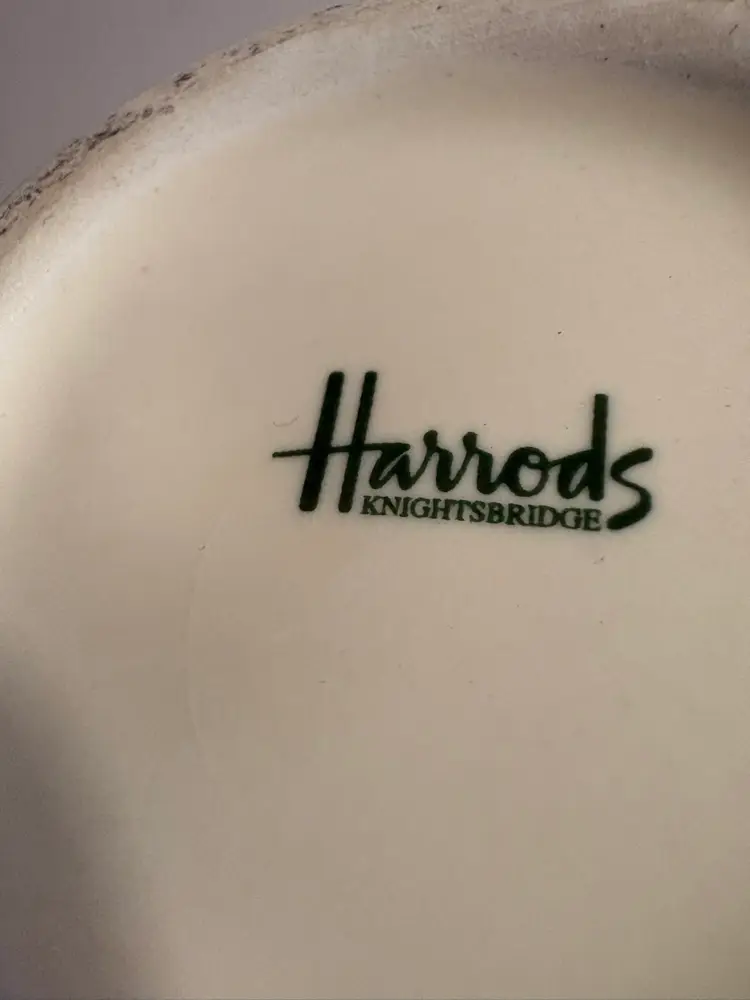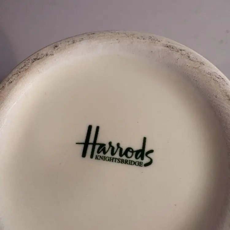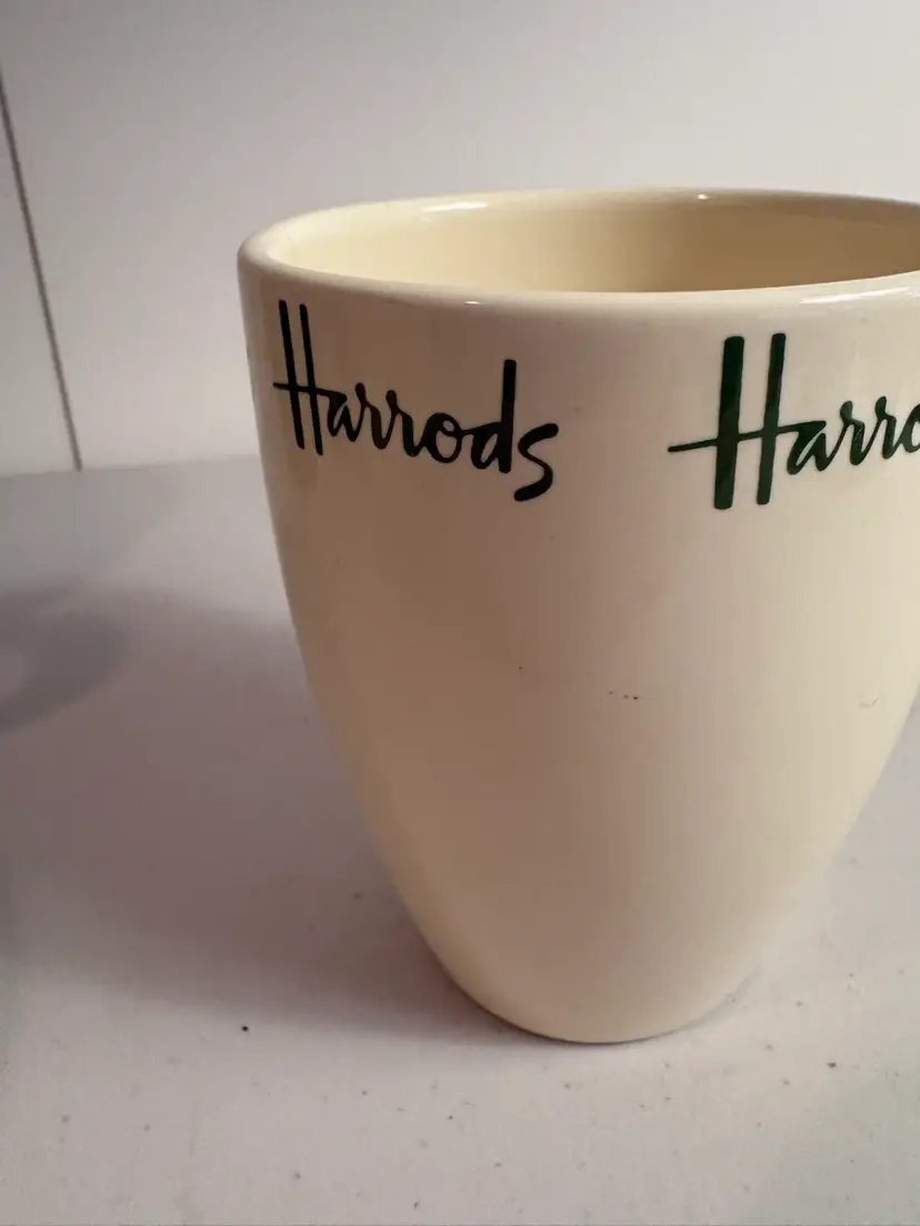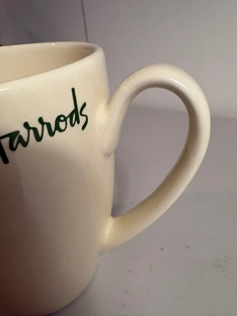 Harrods Knightsbridge Fine Stoneware Mug Cup 4.5" Tall 12oz Beige w/ Green lettering. It’s in perfect condition. Cheers!