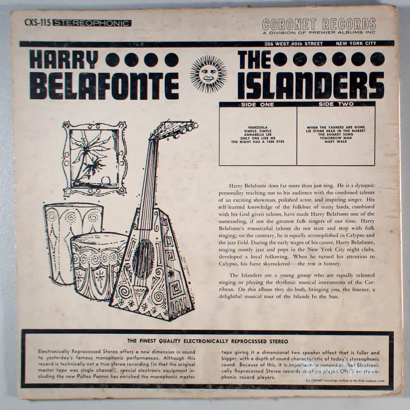 Sings Five Early Songs, by Harry Belafonte, is a repackaging of the album Folk Songs And Calypso with an alternate track list. Of the Belafonte tracks, one was a genuine West Indian folk song: Venezuela, which had been released as a single by Jubilee in 1954. The additional Belafonte tracks are Annabelle Lee, Only One Like Me, The Night Has a Thousand Eyes, and Simple, Simple, Simple. The album also features The Islanders, a young group who are equally talented singing or playing the rhythmic musical instruments of the Carribean.