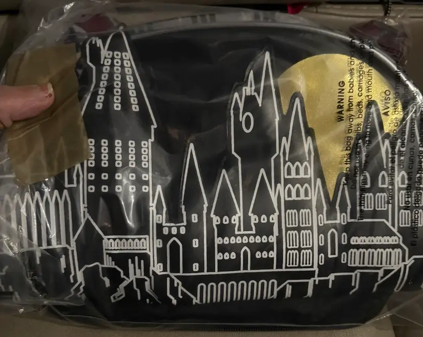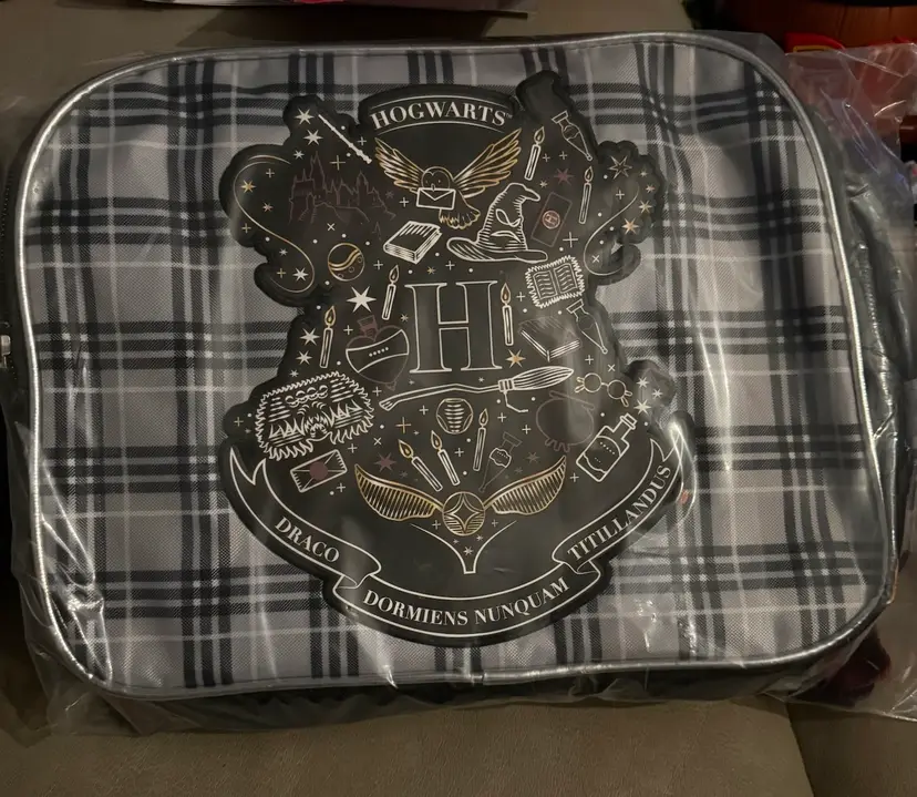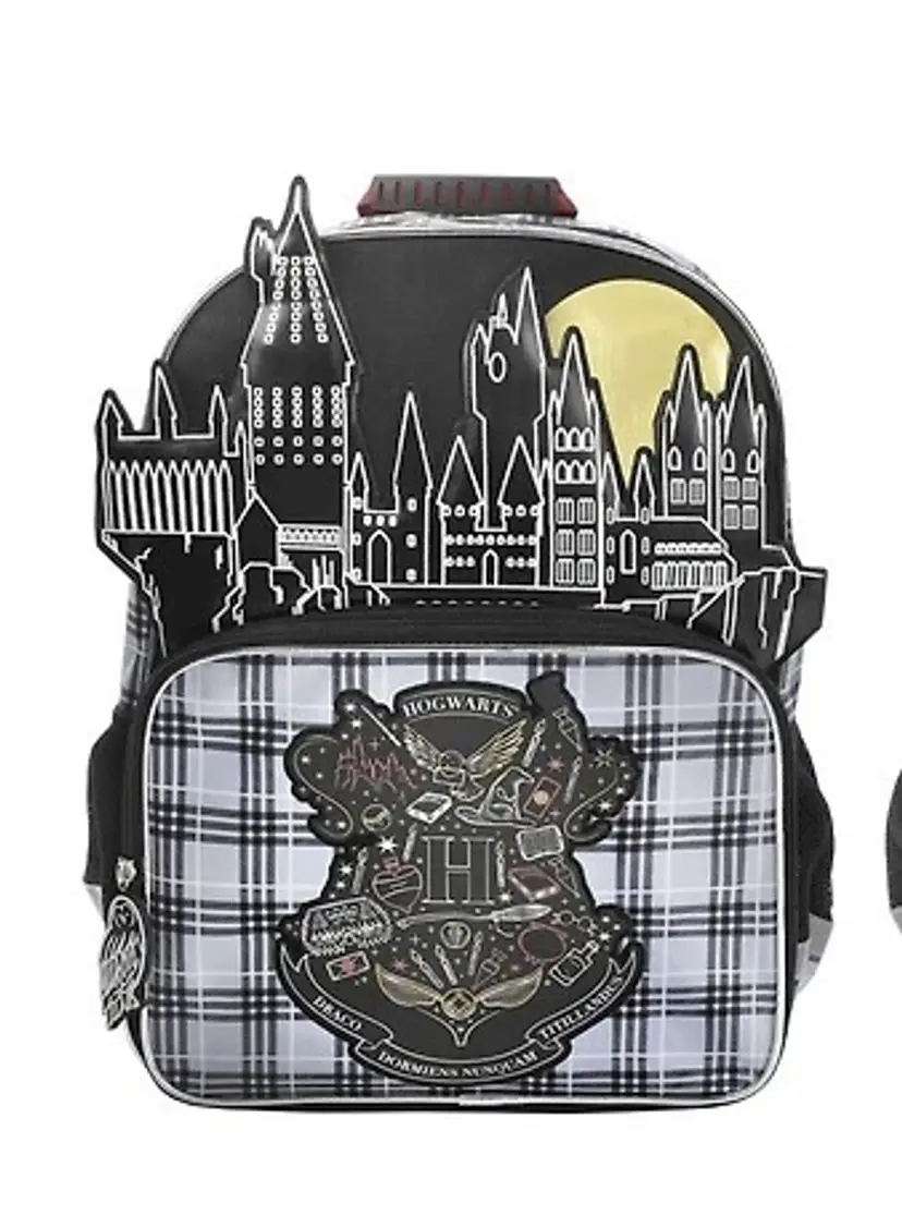 This is the Harry Potter Hogwarts Tartan Crest 16" backpack, by Bioworld, or a variation of a Loungefly product. It features a black and white plaid pattern on the bottom section and a silhouette of the Hogwarts castle and moon on the top section. The large Hogwarts crest is an appliqué on the front pocket.