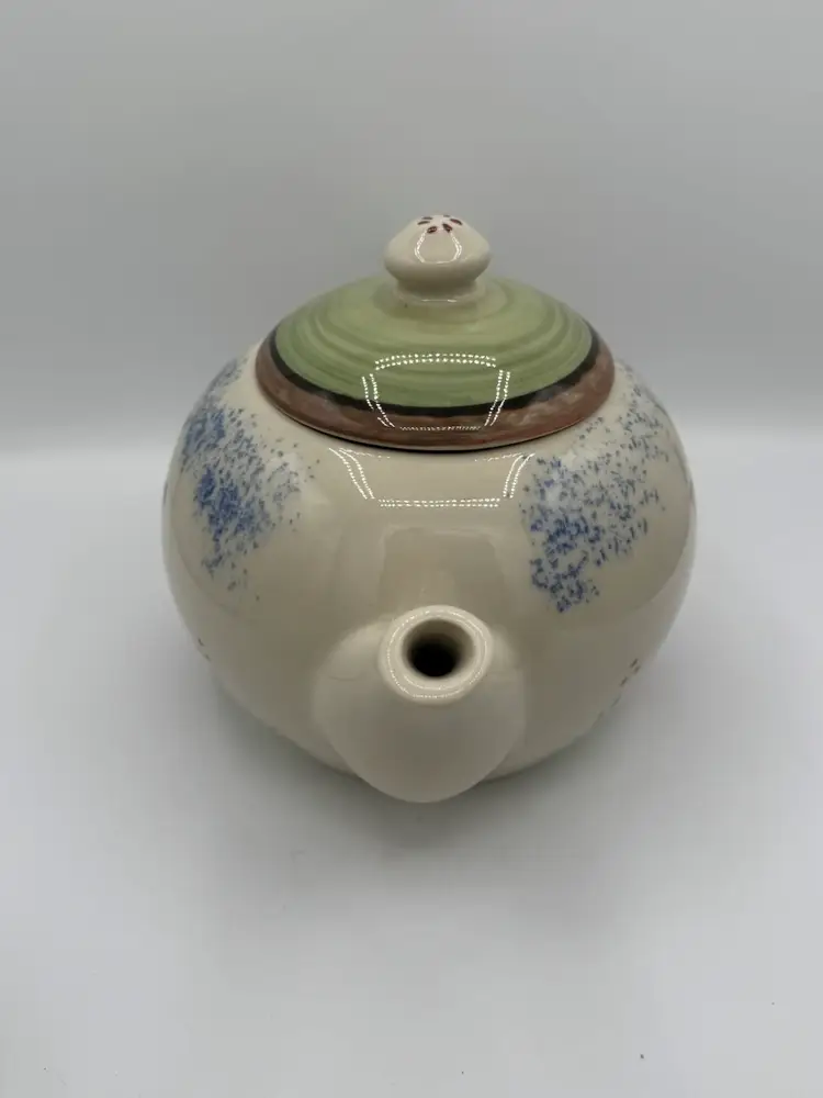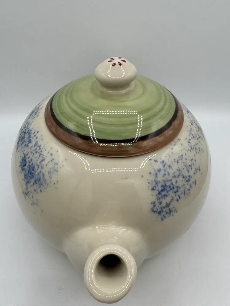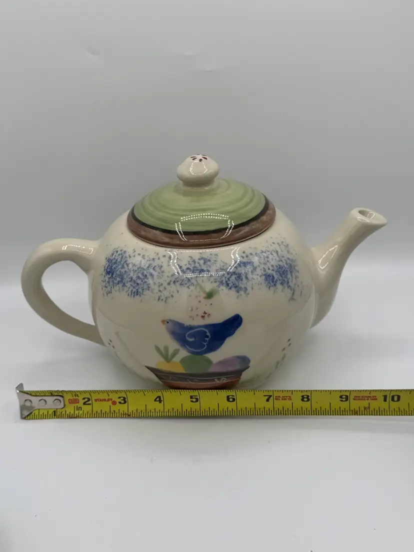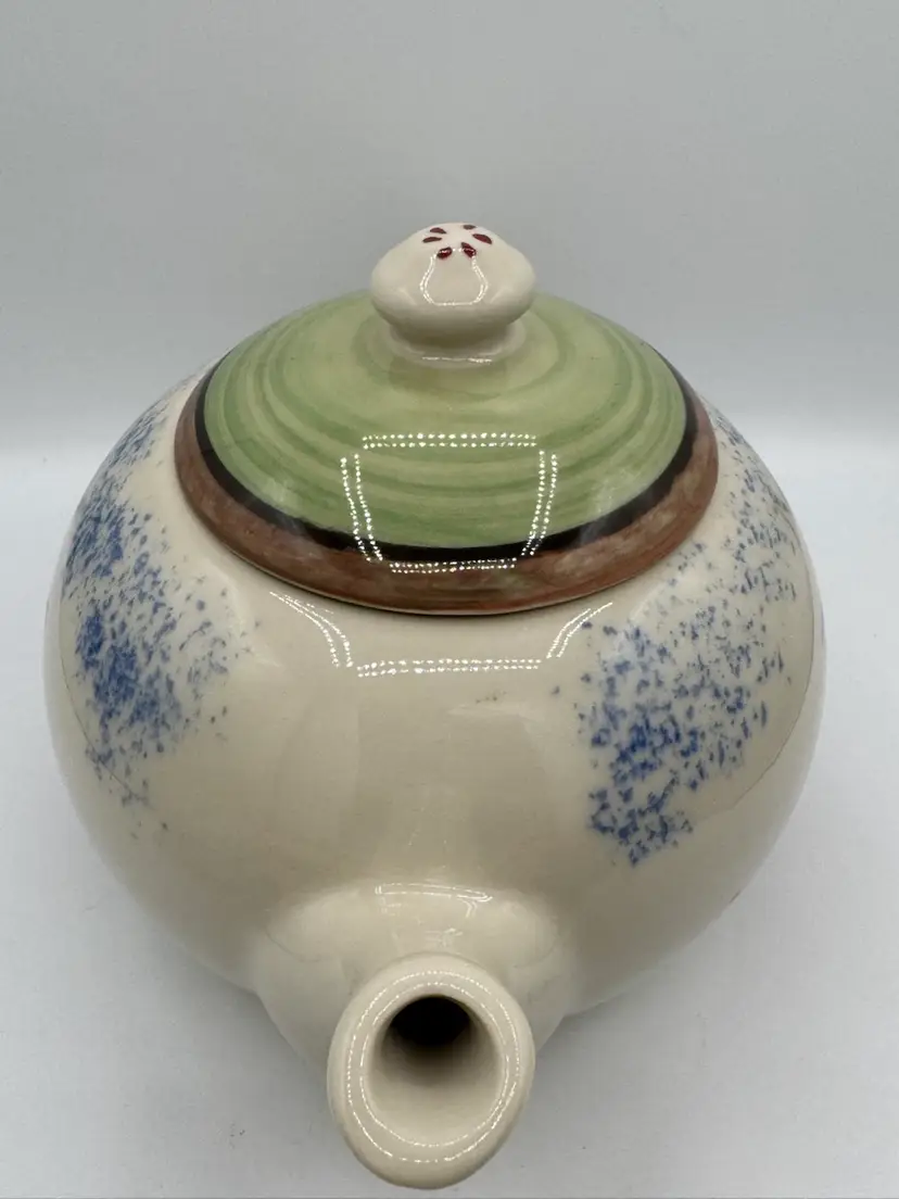 Very sweet teapot by Hartstone Pottery of Zanesville, Ohio. Measures about 6 1/2 inches tall and 10 inches wide. Very good vintage condition with no chips or cracks.