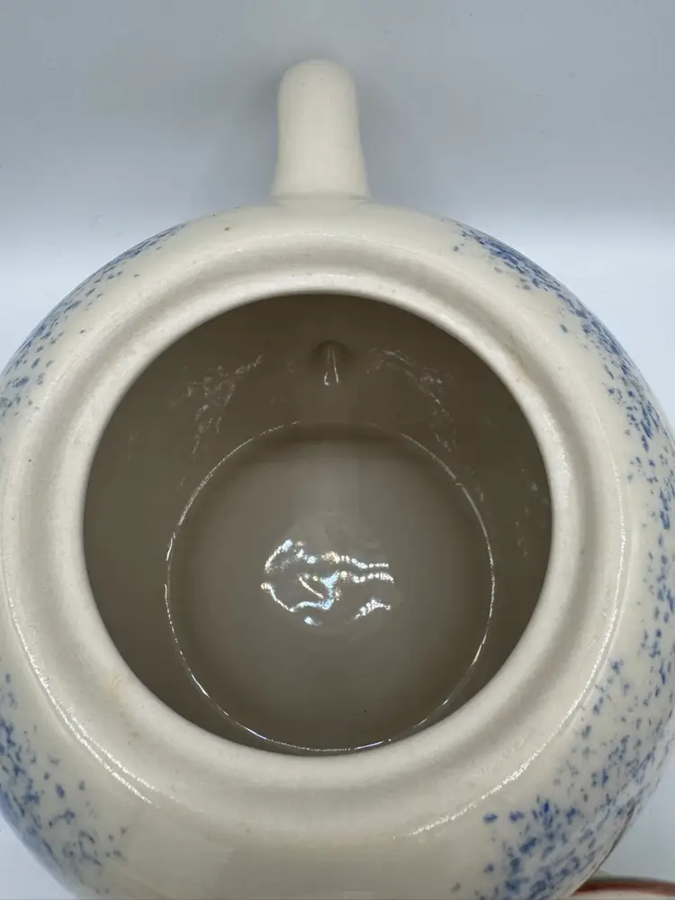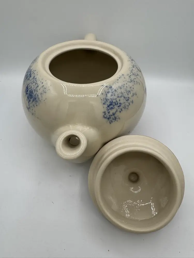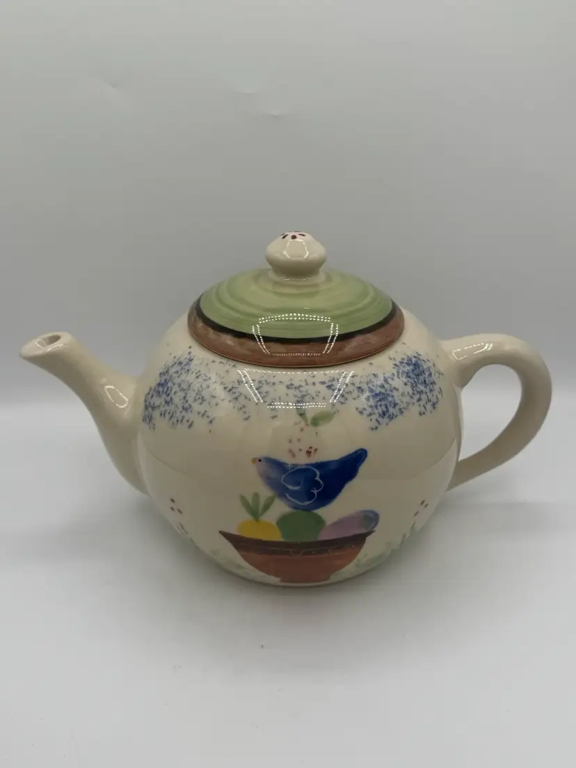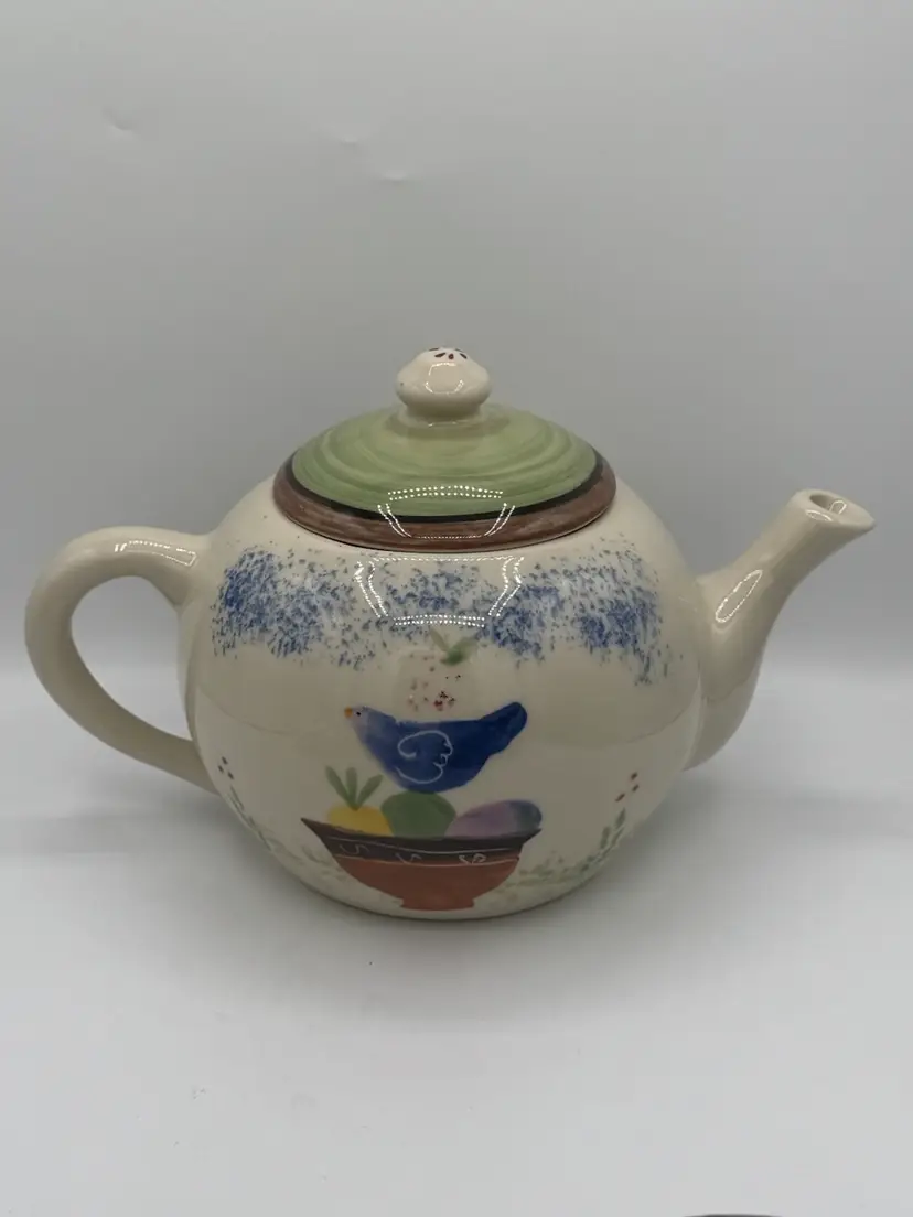 Very sweet teapot by Hartstone Pottery of Zanesville, Ohio. Measures about 6 1/2 inches tall and 10 inches wide. Very good vintage condition with no chips or cracks.