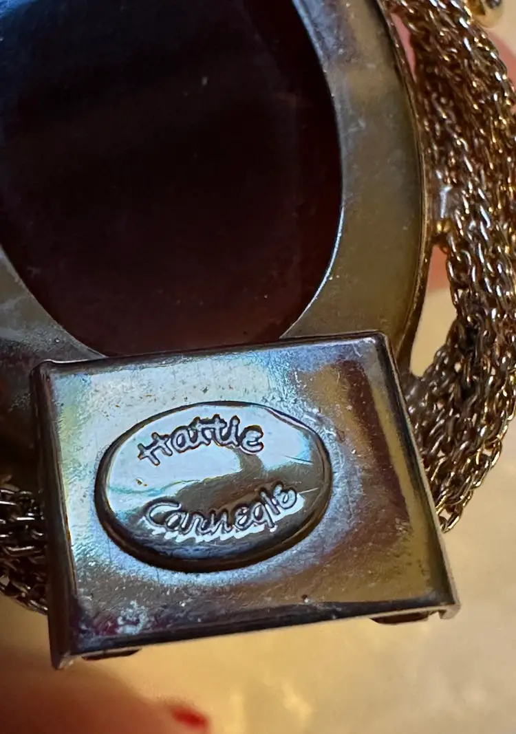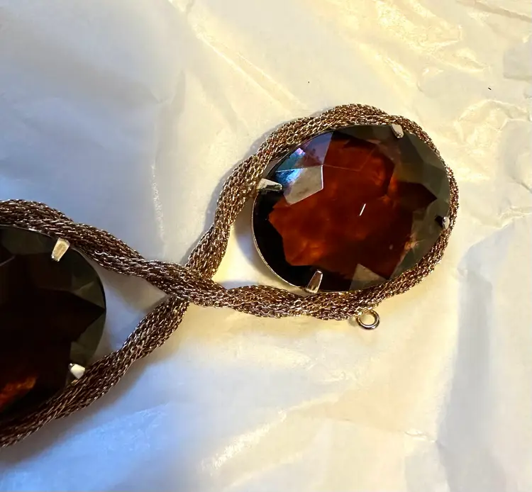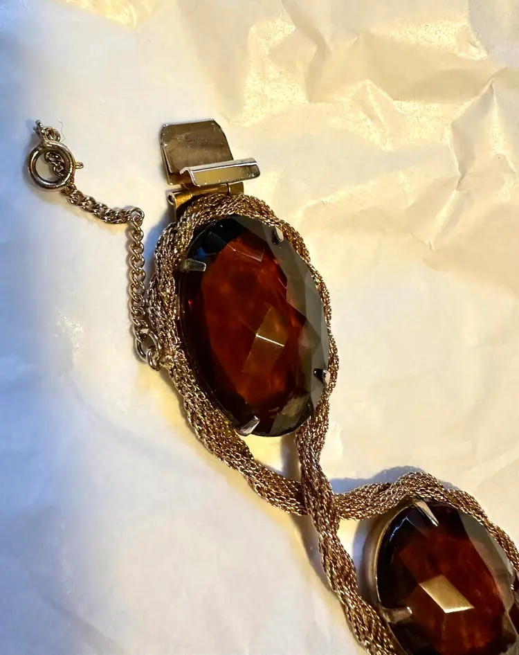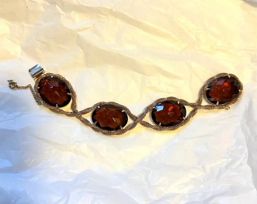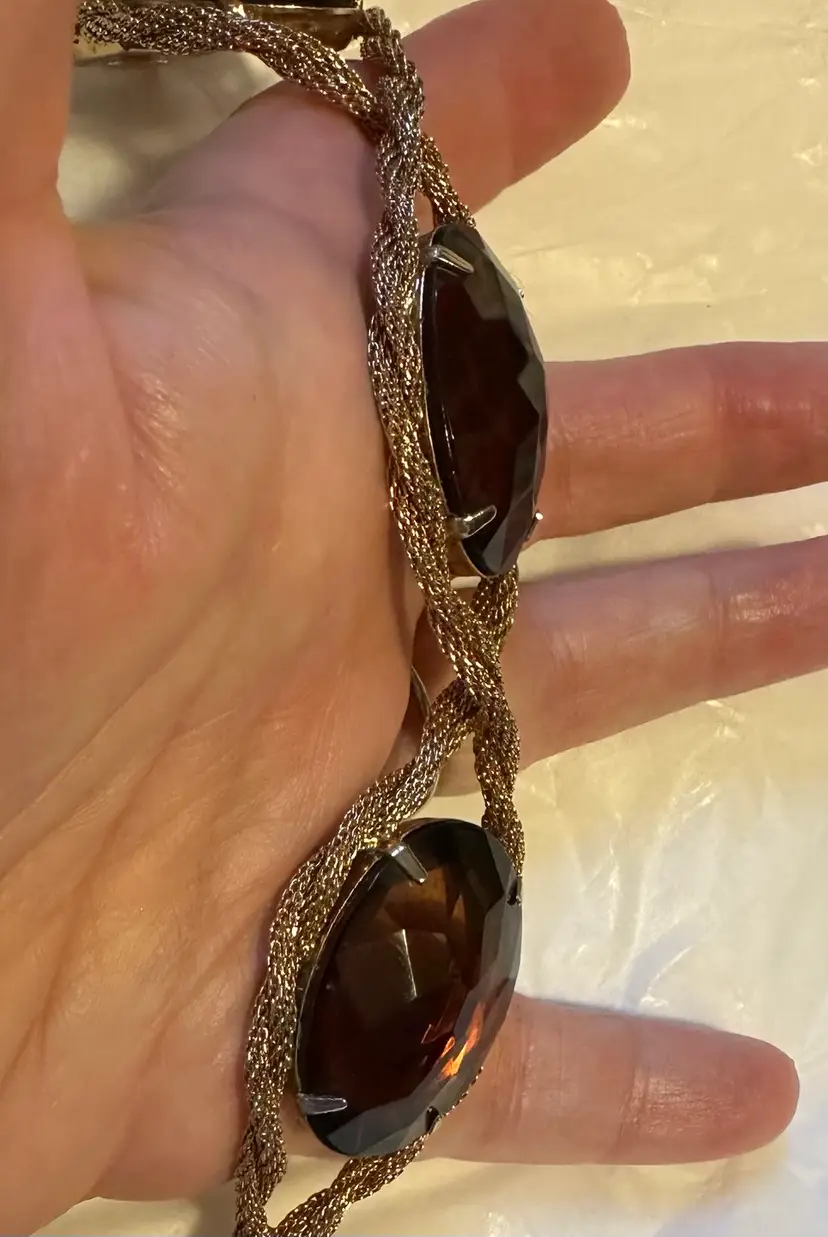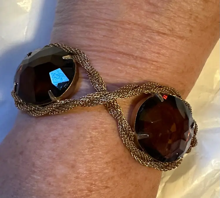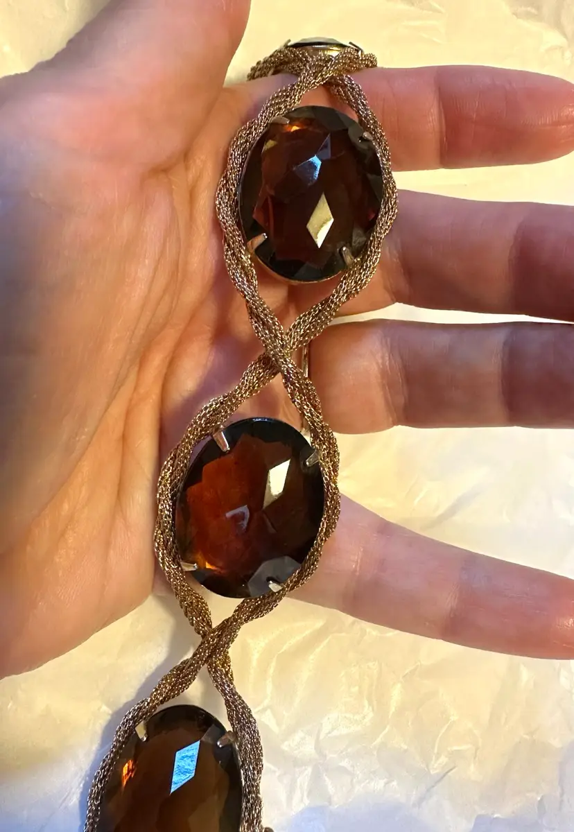Great looking Hattie bracelet is done with mesh roping and set with large purple faceted stones. It measures 8” x 1.25”. Condition is very good.